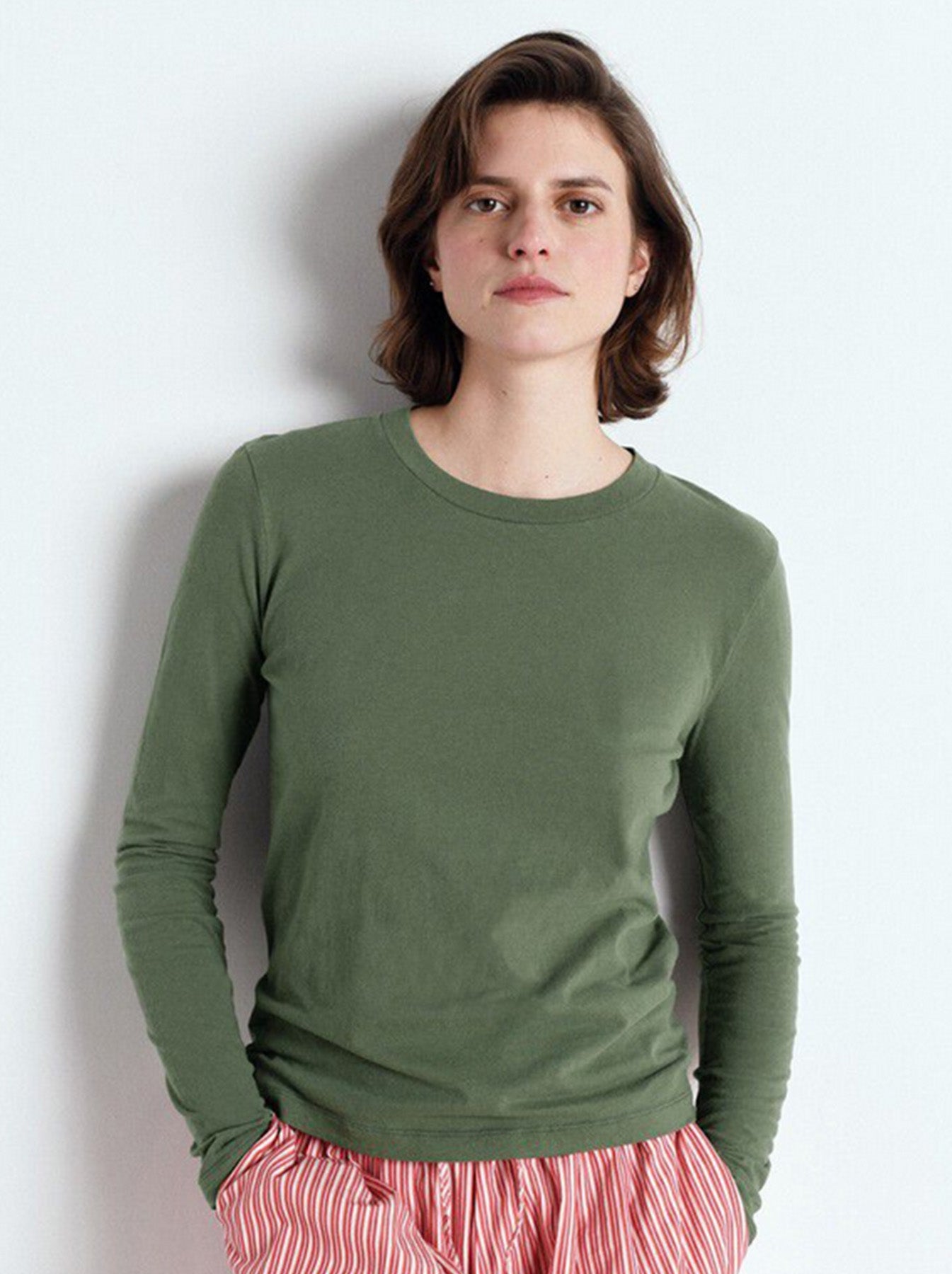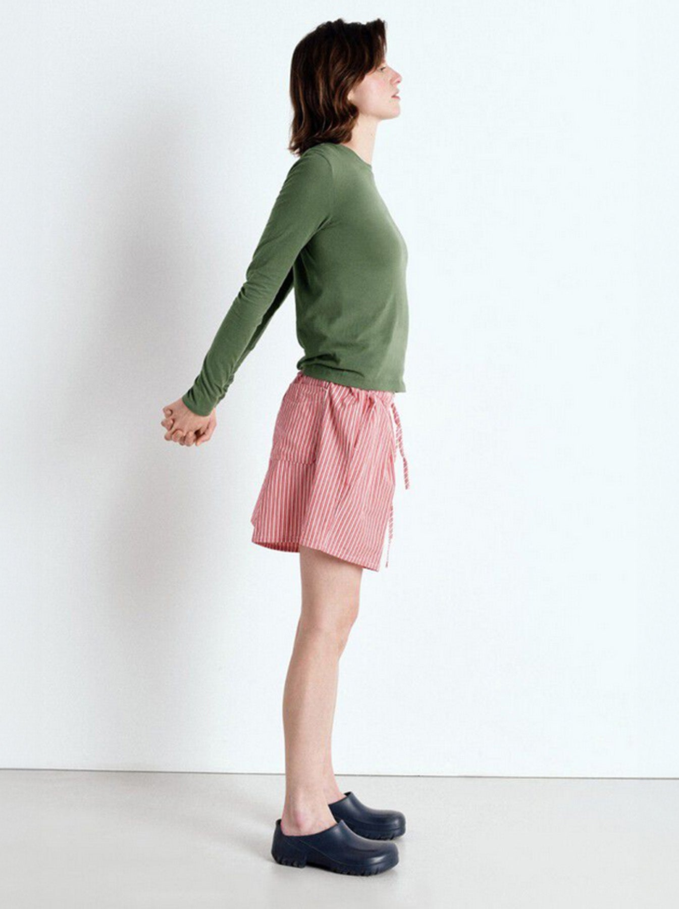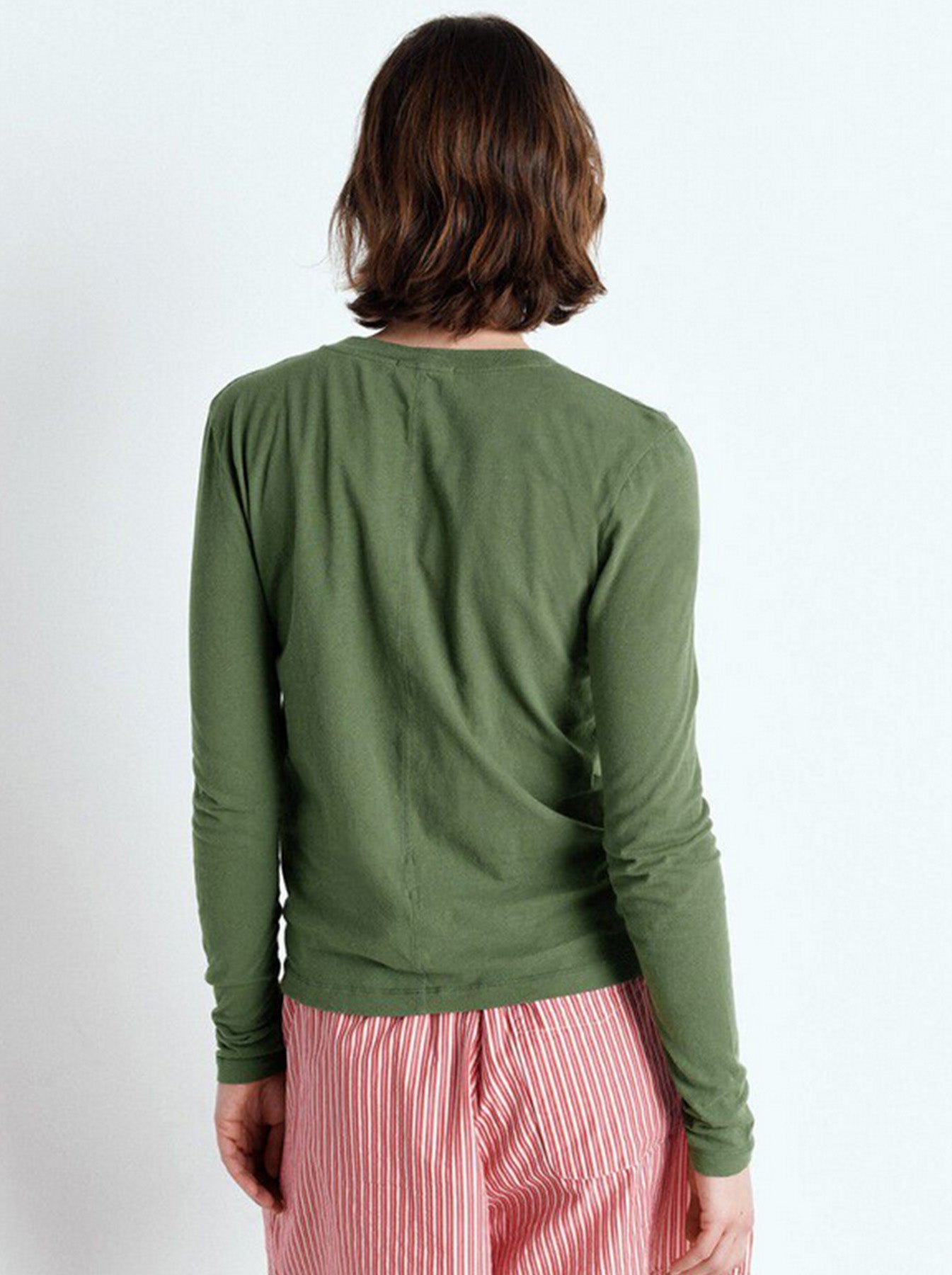 - Details: loose-fitting cotton t-shirt, round neck, longline body, and long sleeves finished with a centre seam on back.
