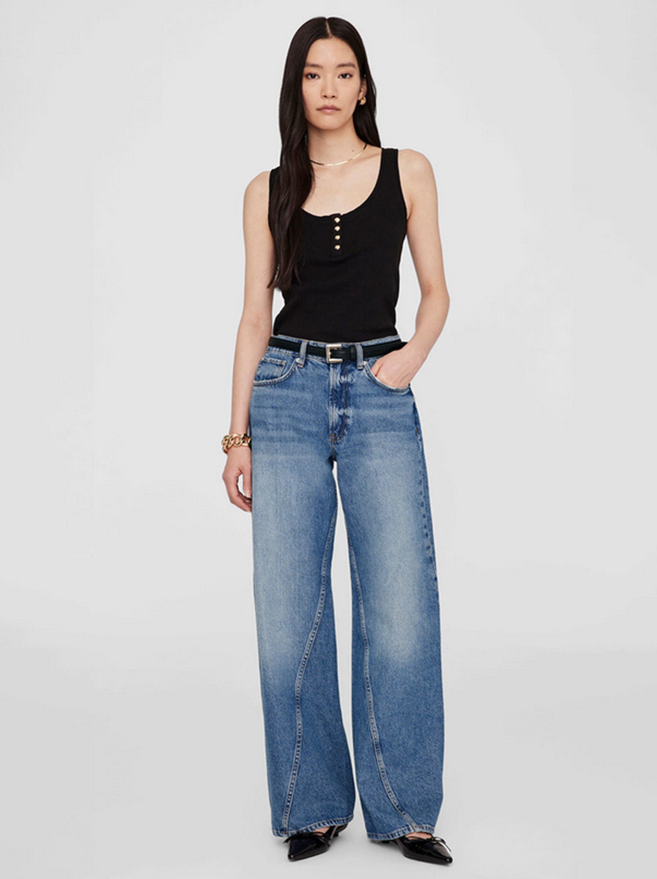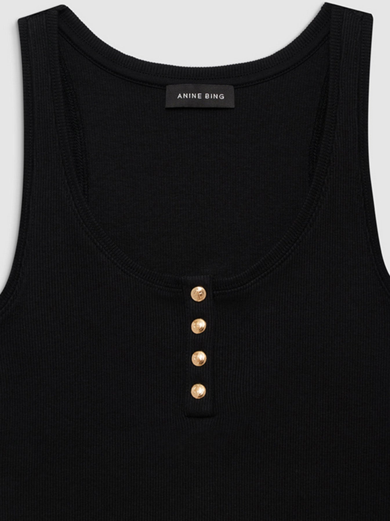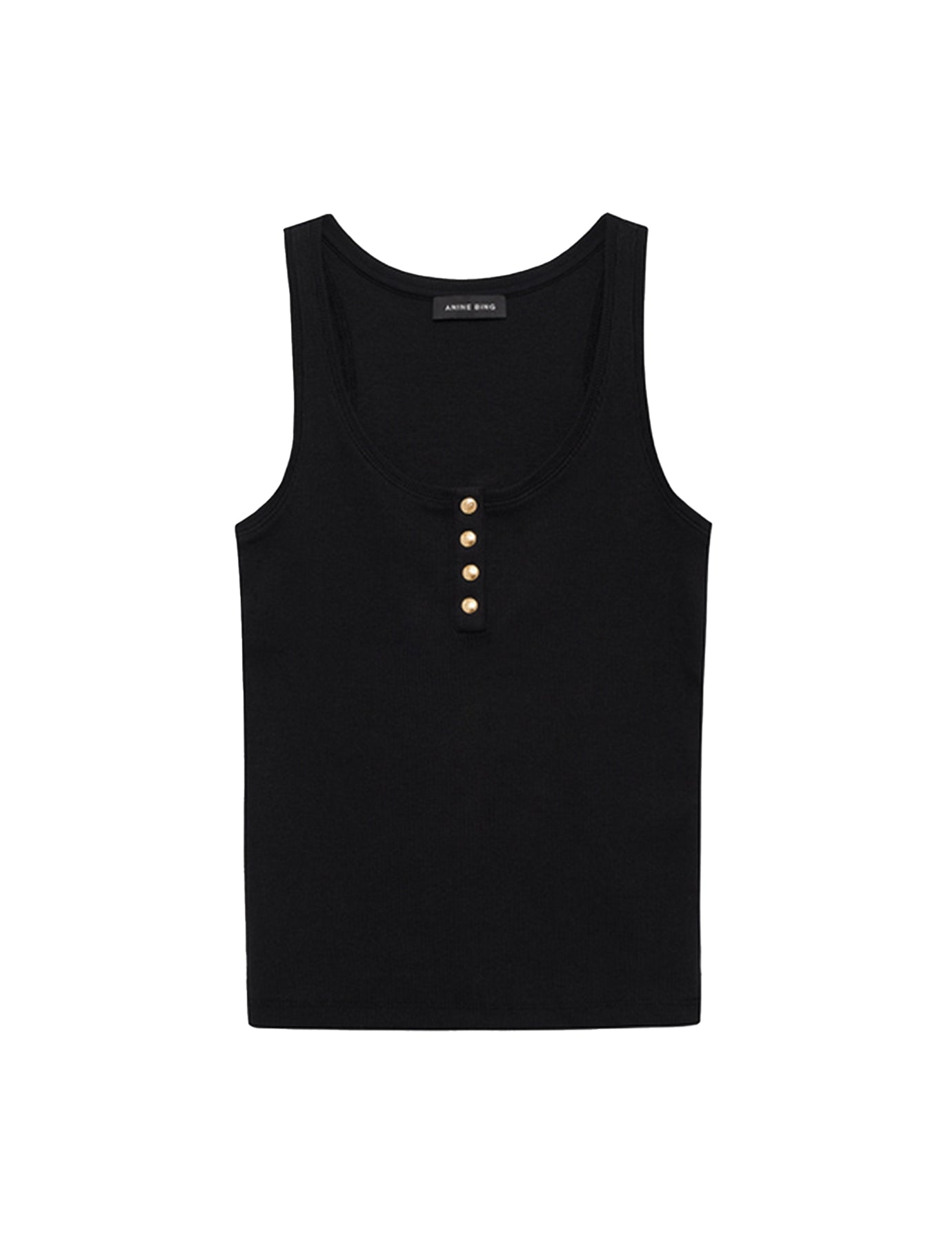 Anine Bing presents a modern tank top with Henley-inspired details, made from a durable cotton-spandex blend. Featuring a fully ribbed texture this elevated staple offers a soft feel, round neckline and gold monogram snap buttons along the front placket. Pair it with your favourite denims and pointed heels for a sleek "on-the-go" look.