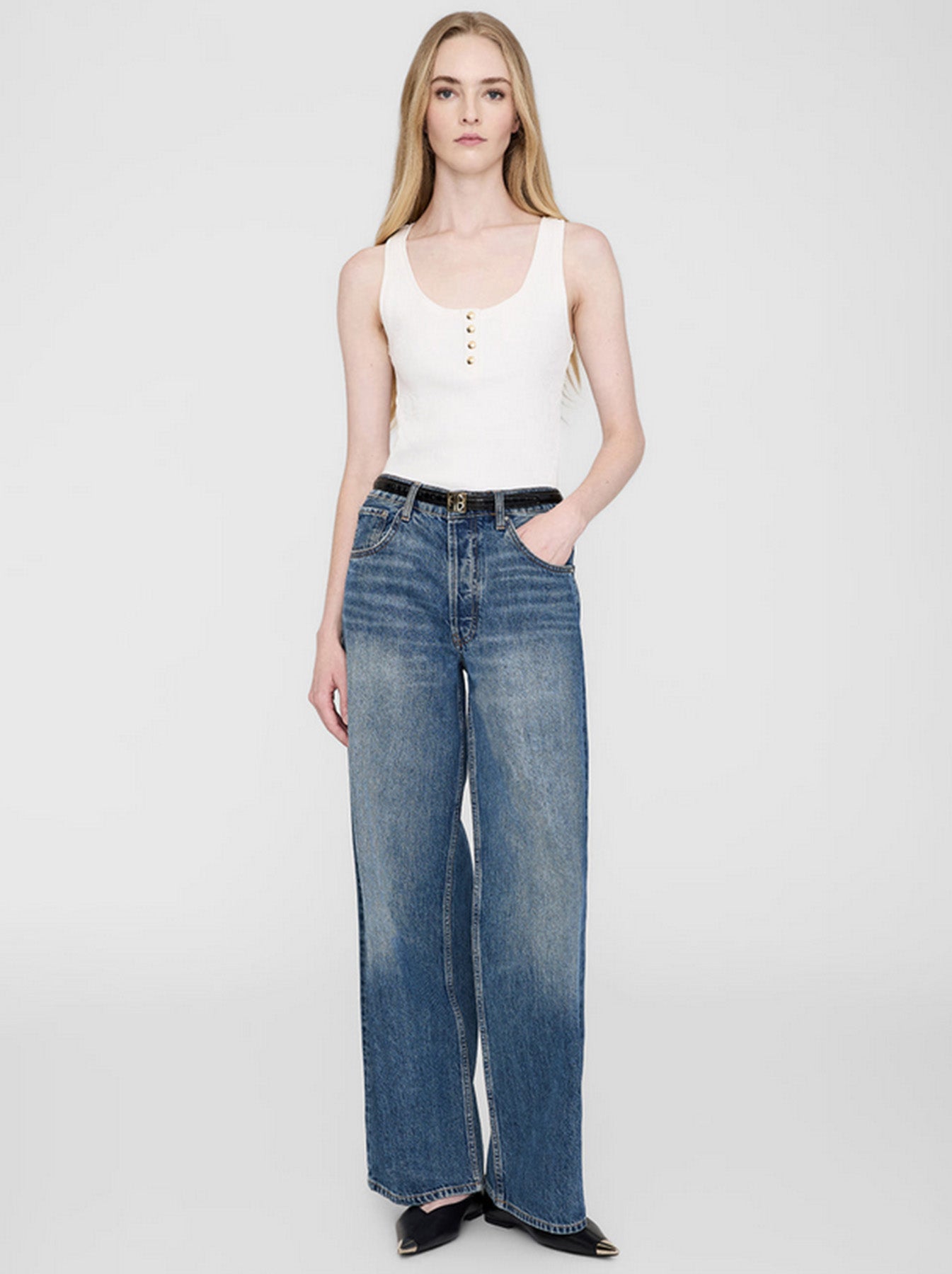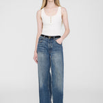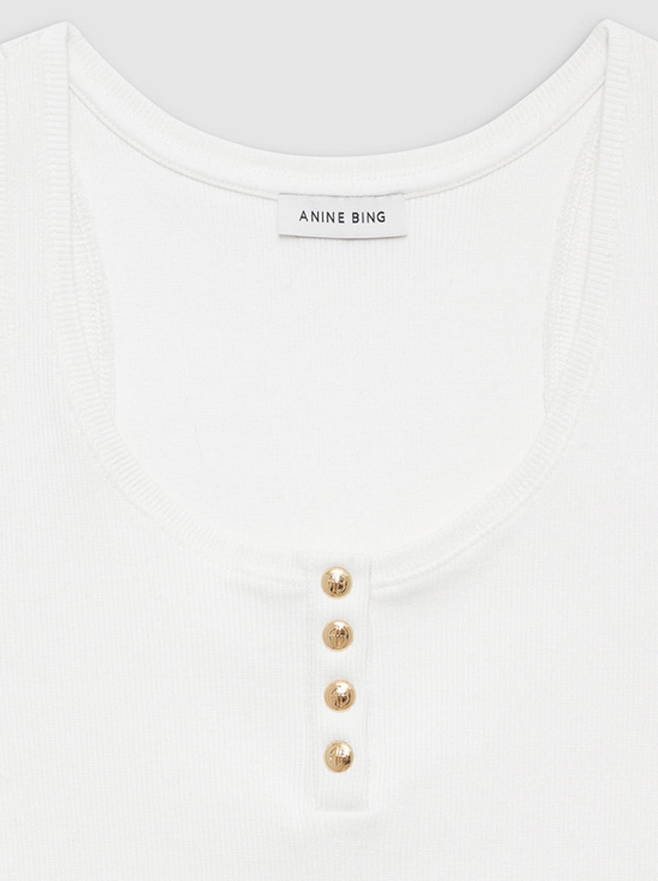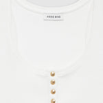 Anine Bing’s Alessia ivory tank is made from a cotton-spandex blend, featuring a ribbed texture throughout. With a round neckline and gold monogram snap buttons down the front, this piece brings Henley-inspired style to a modern look. Pair it with some long-line denim shorts, an oversized blazer and loafers for a high-fashion look.