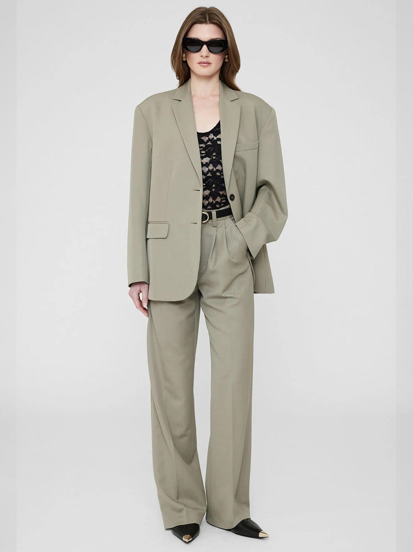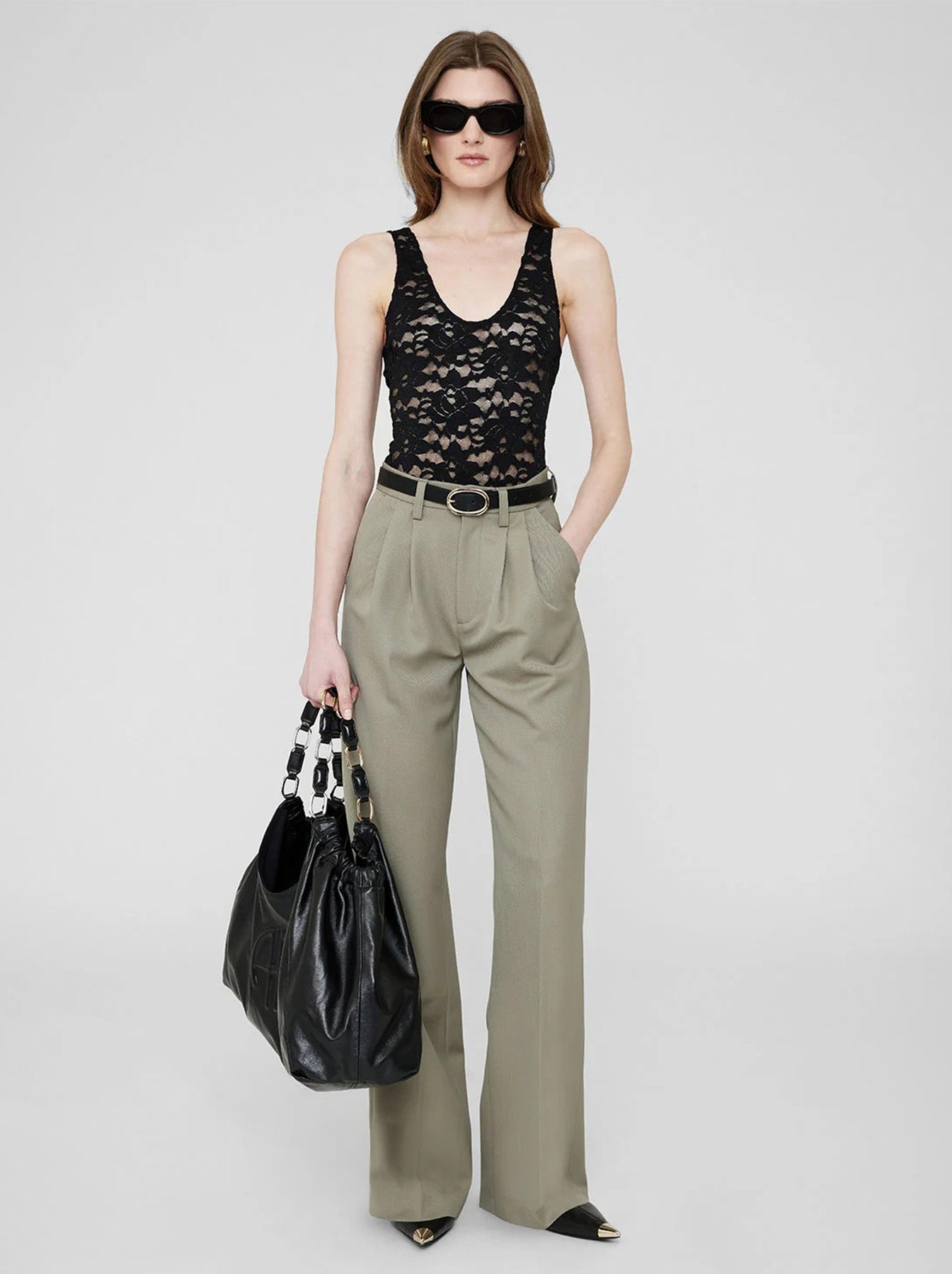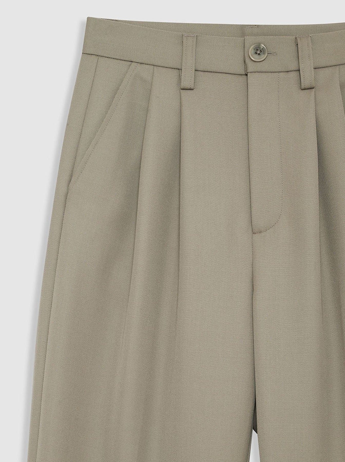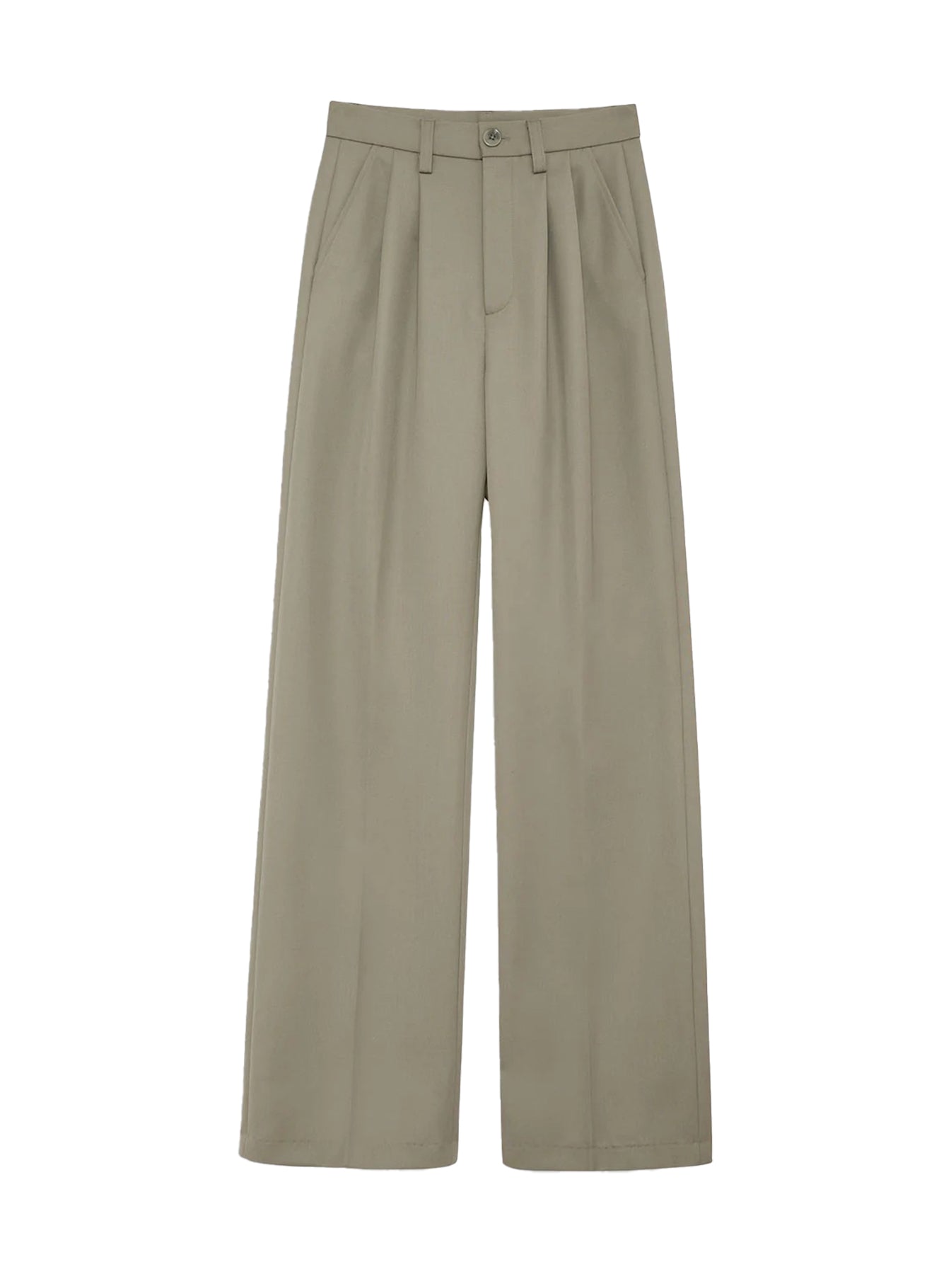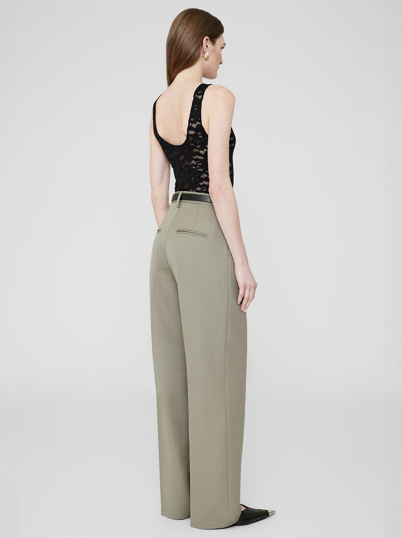 The Carrie Wool Pant by Anine Bing is a heavy-weight, fully-lined trouser featuring a relaxed fit and wide-leg design. Crafted from luxurious wool for a warm and stylish look in a cool khaki green, these pants have a high-rise waist and full-length legs, making them ideal for cooler months. Pair them with elegant heels for a dressed-up look or dress them down with a graphic tee and sneakers for a classic casual outfit.