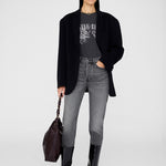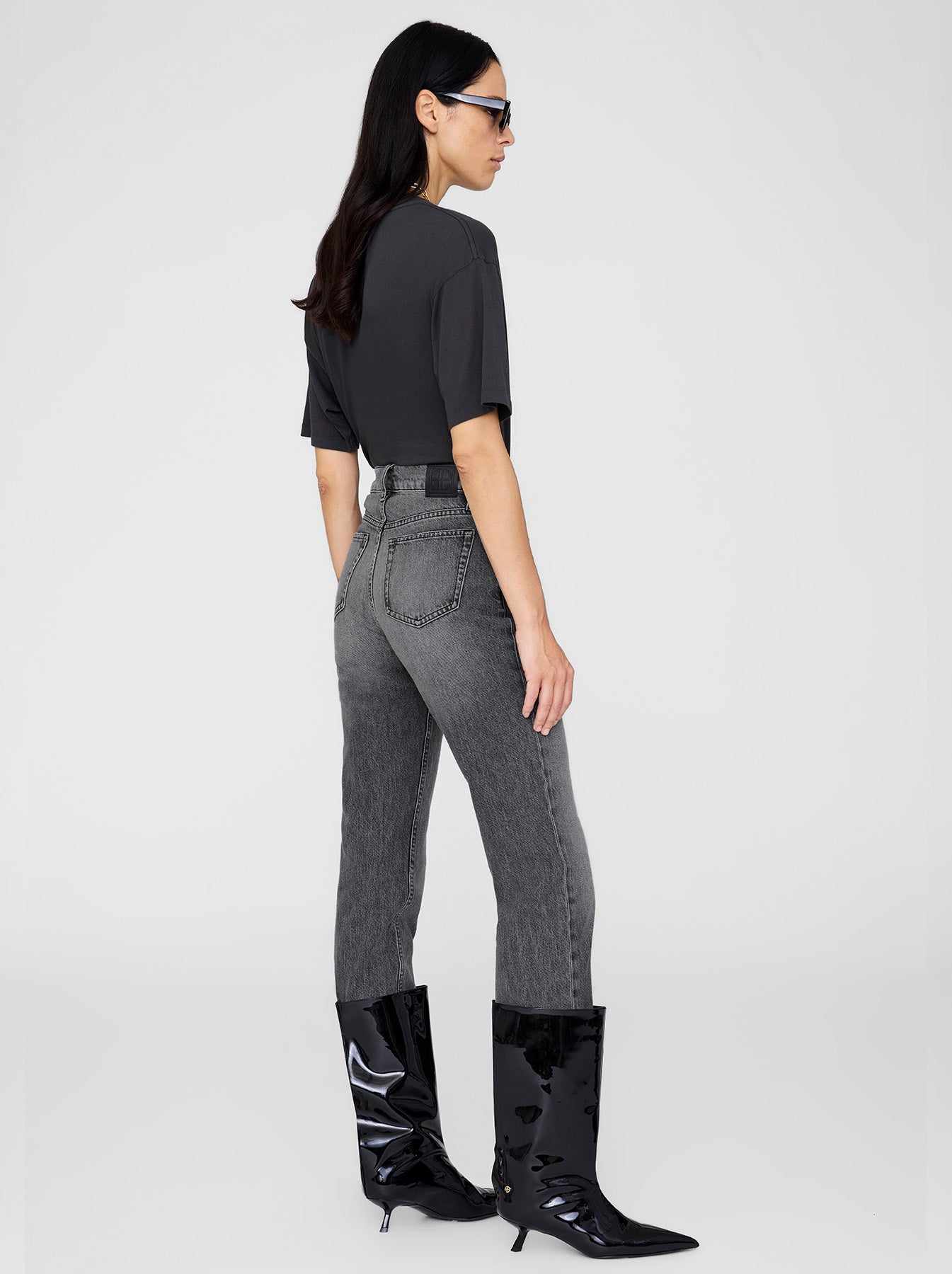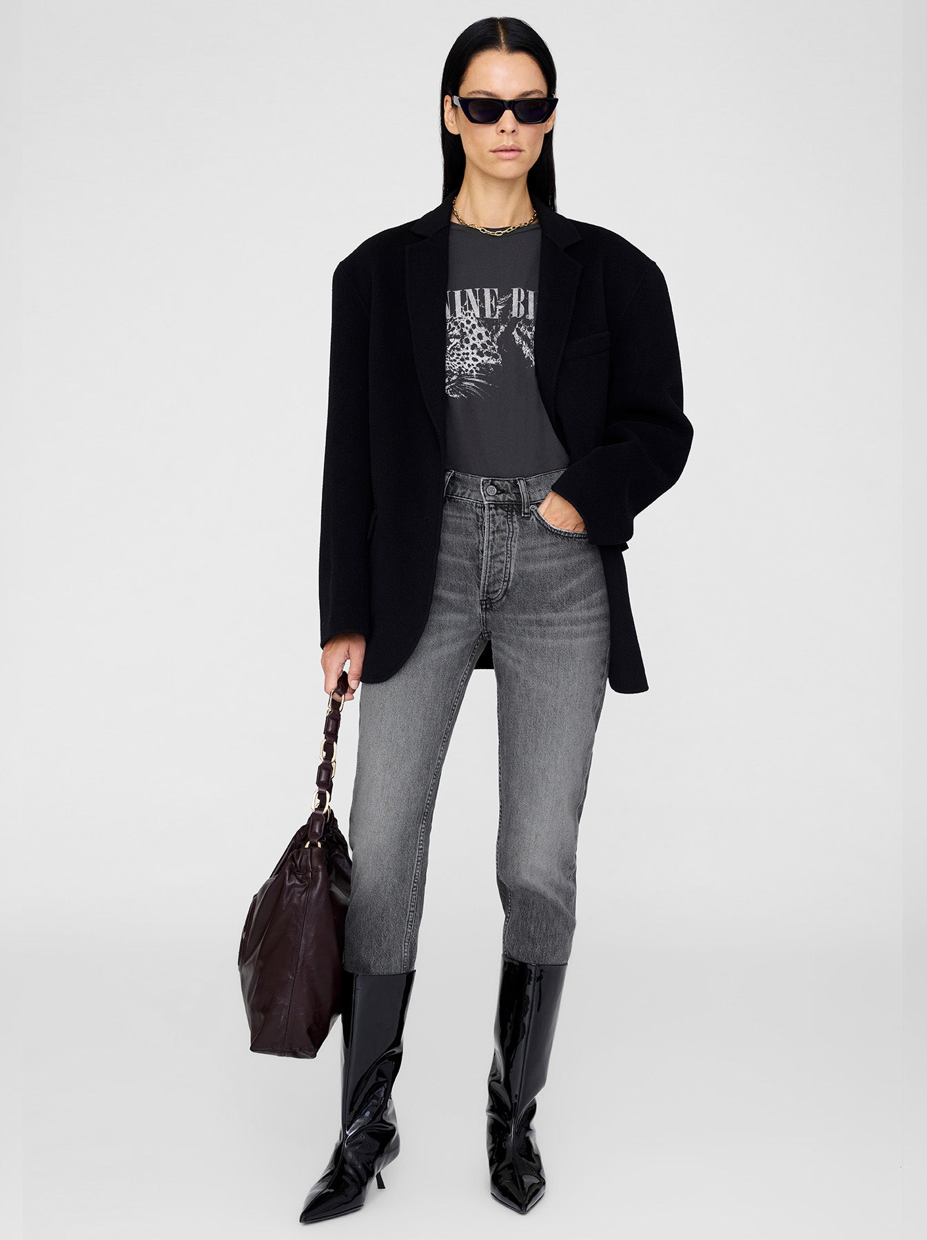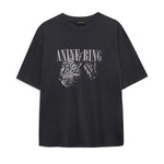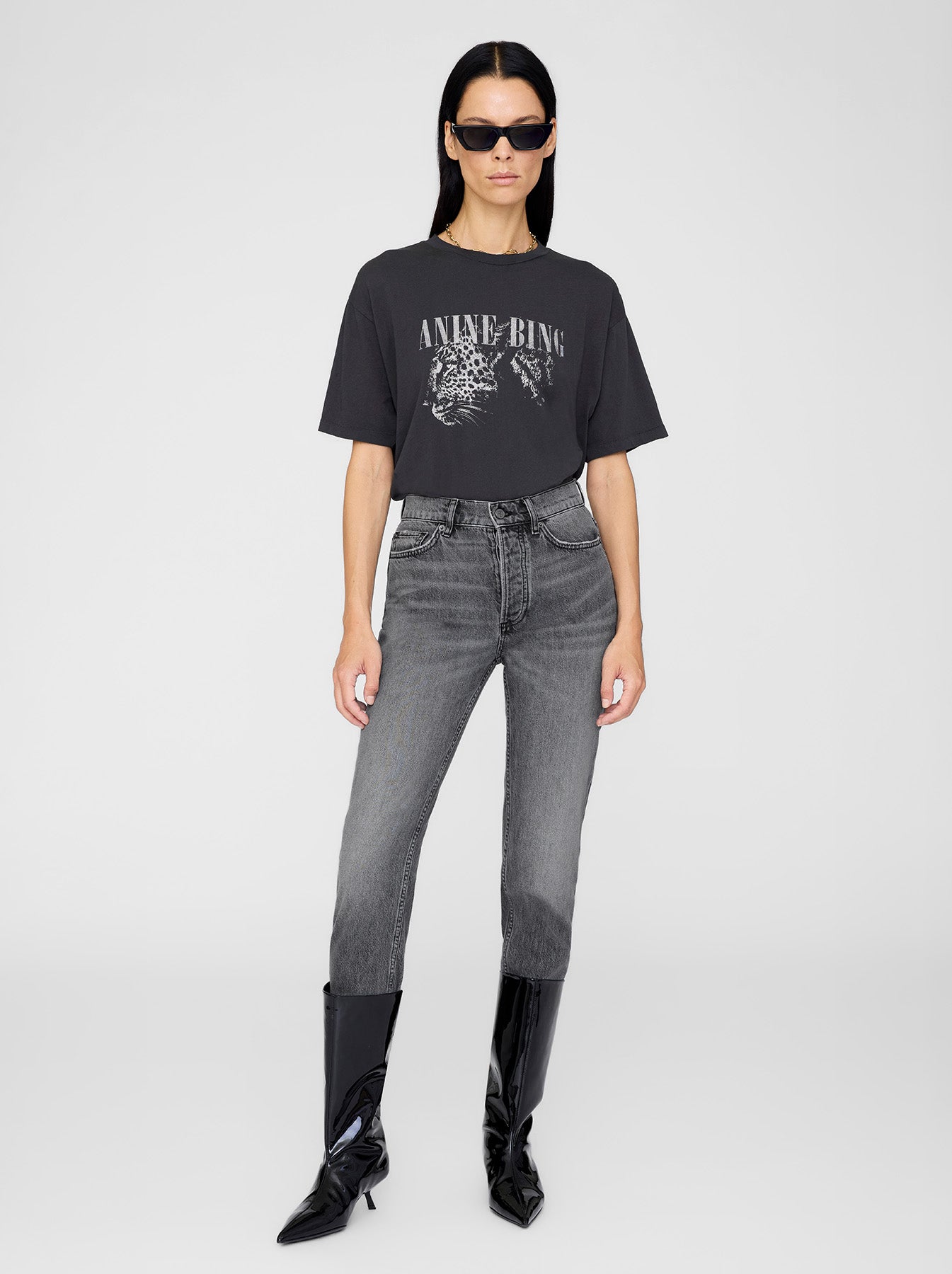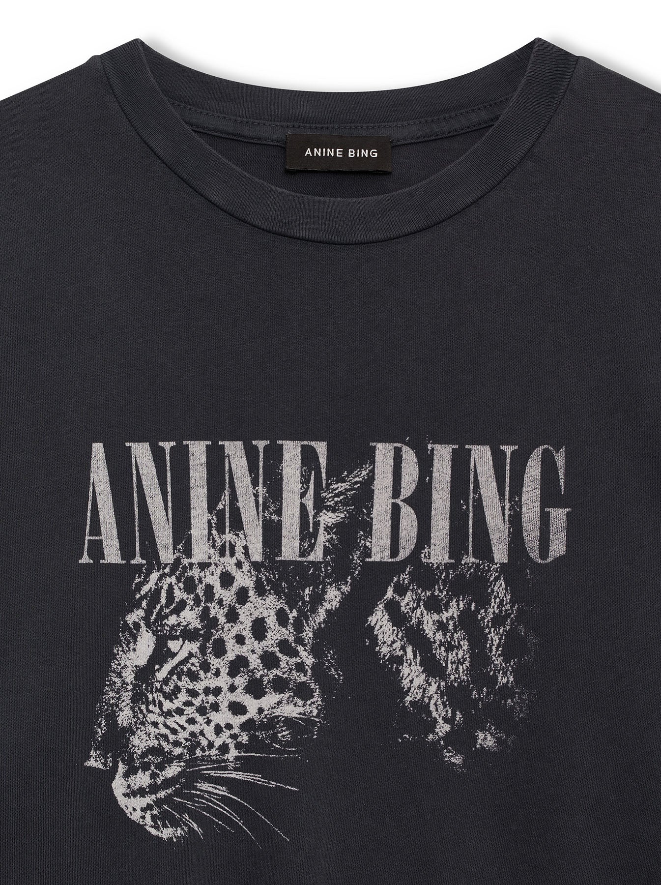 Details: Oversized, boxy fit, ribbed crew neck, washed black tee with faded off-white "Anine Bing" & leopard screen print.