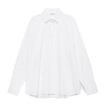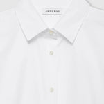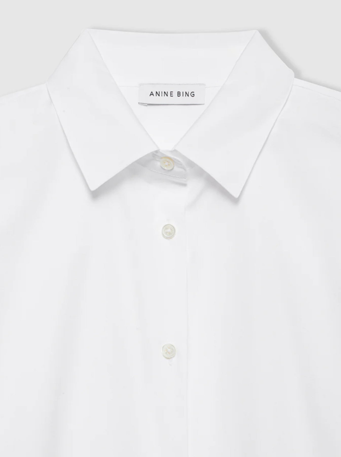 - Details: Crisp white button-up shirt, with spread collar & mother-of-pearl buttons down centre placket and cuffs, drop shoulders, back yoke and shirttail hem, finished with a discreet framed "AB" monogram embroidered within the centre placket.