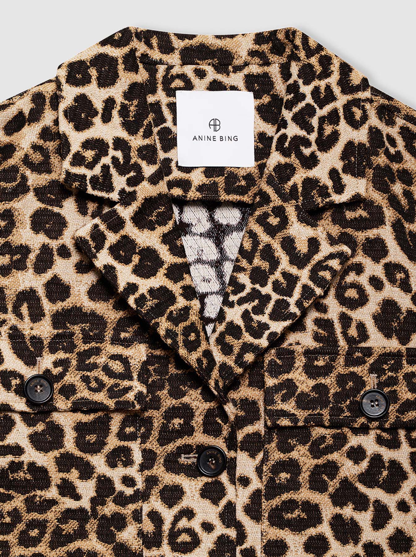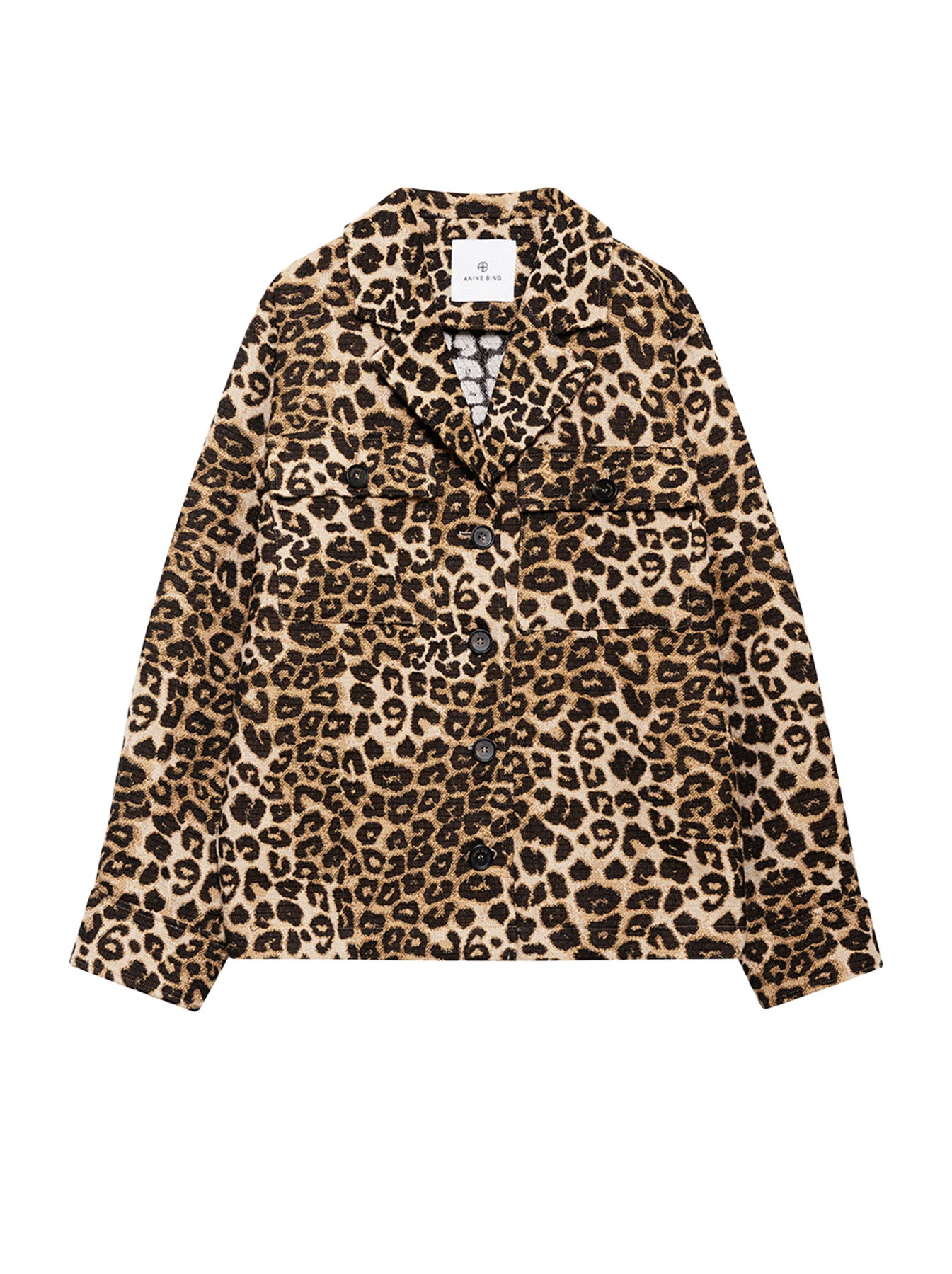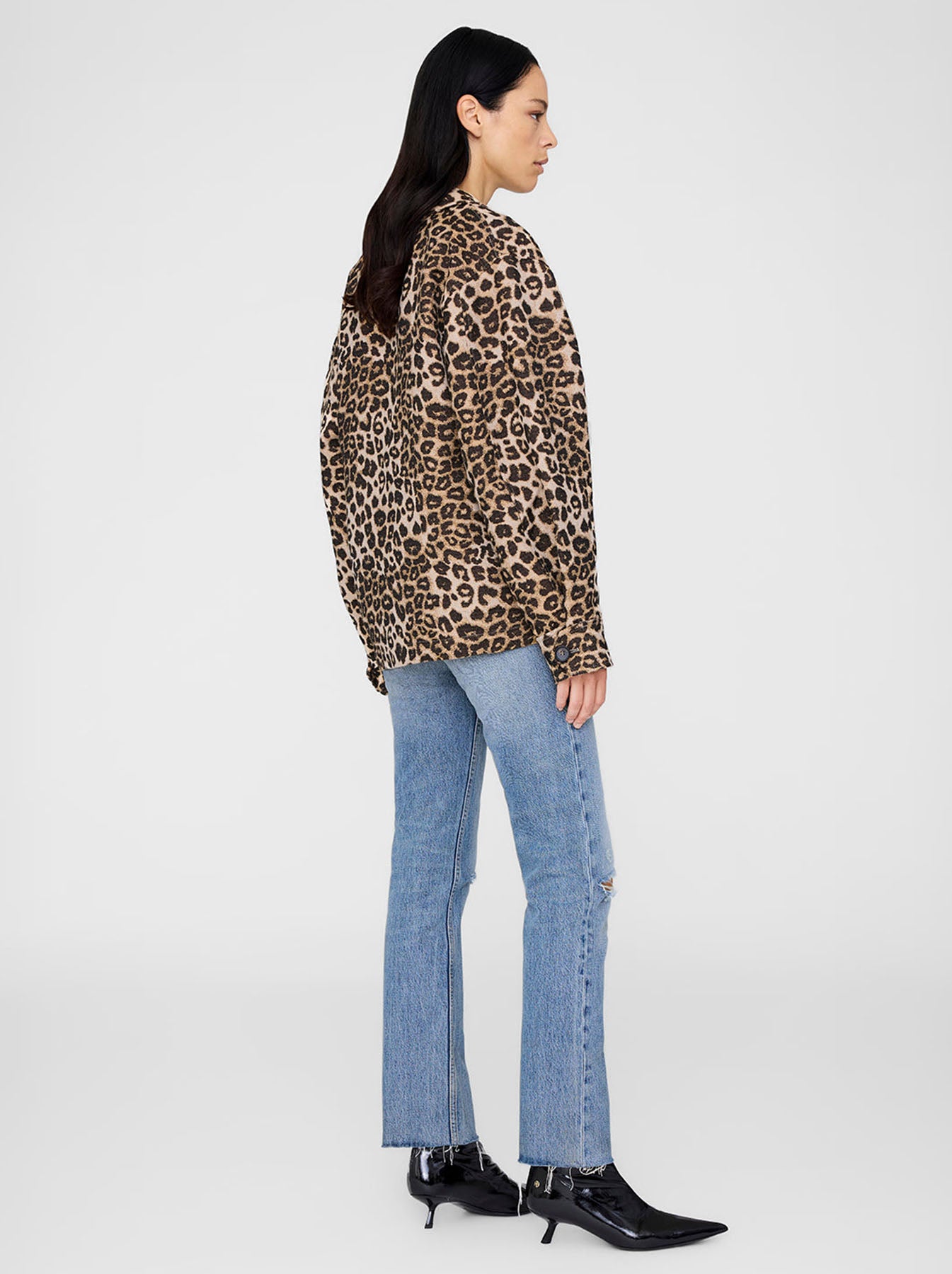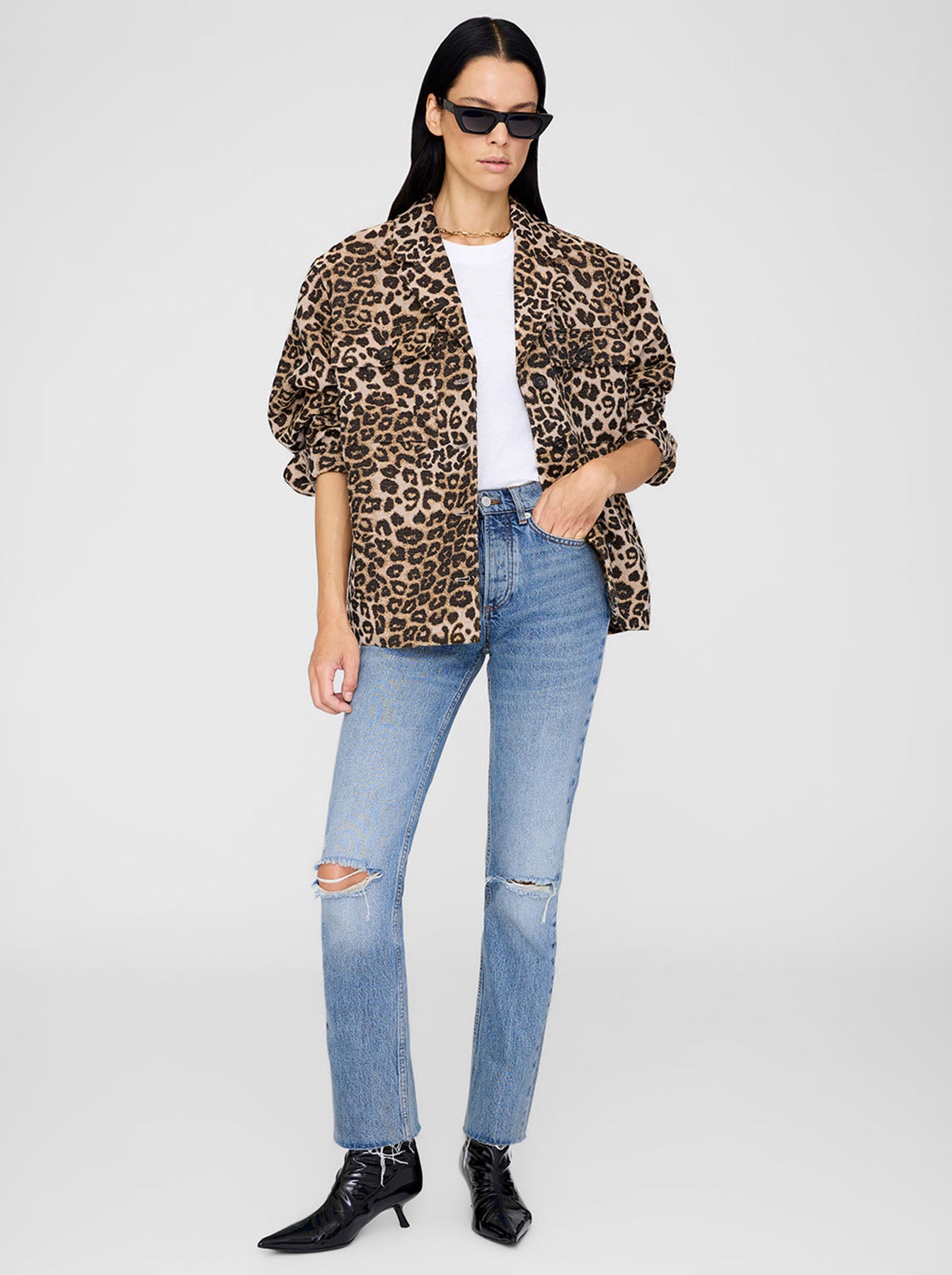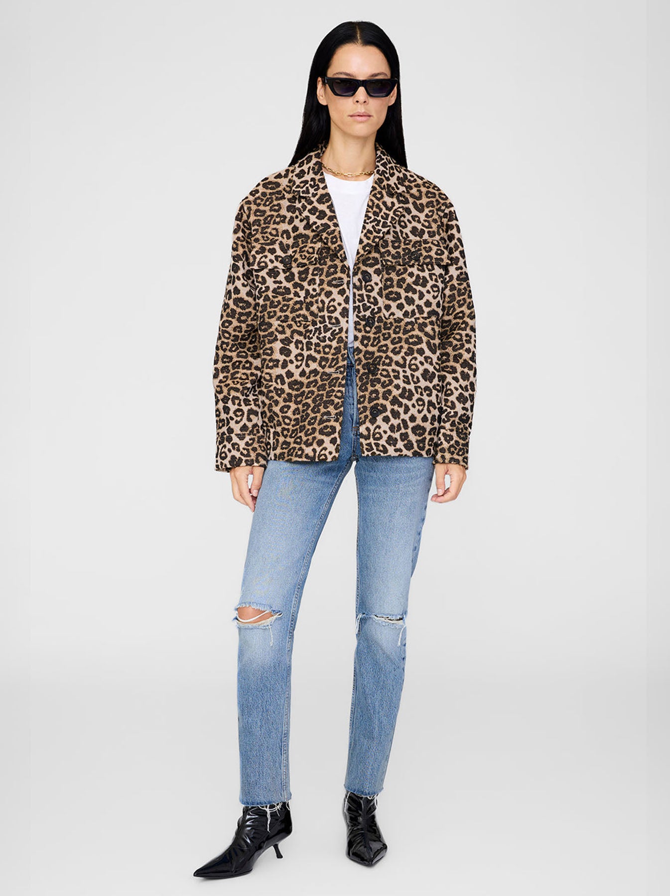 The Flynn Jacket offers a bold take on everyday outerwear with its striking animal print and softly structured silhouette. Designed in a relaxed shape and crafted from cotton-blend fabric that brings a mid-weight feel, this piece is perfect for layering across seasons without bulk. Wear it open over a crisp white tee and high-waisted denim pale blue denim for a modern everyday outfit.