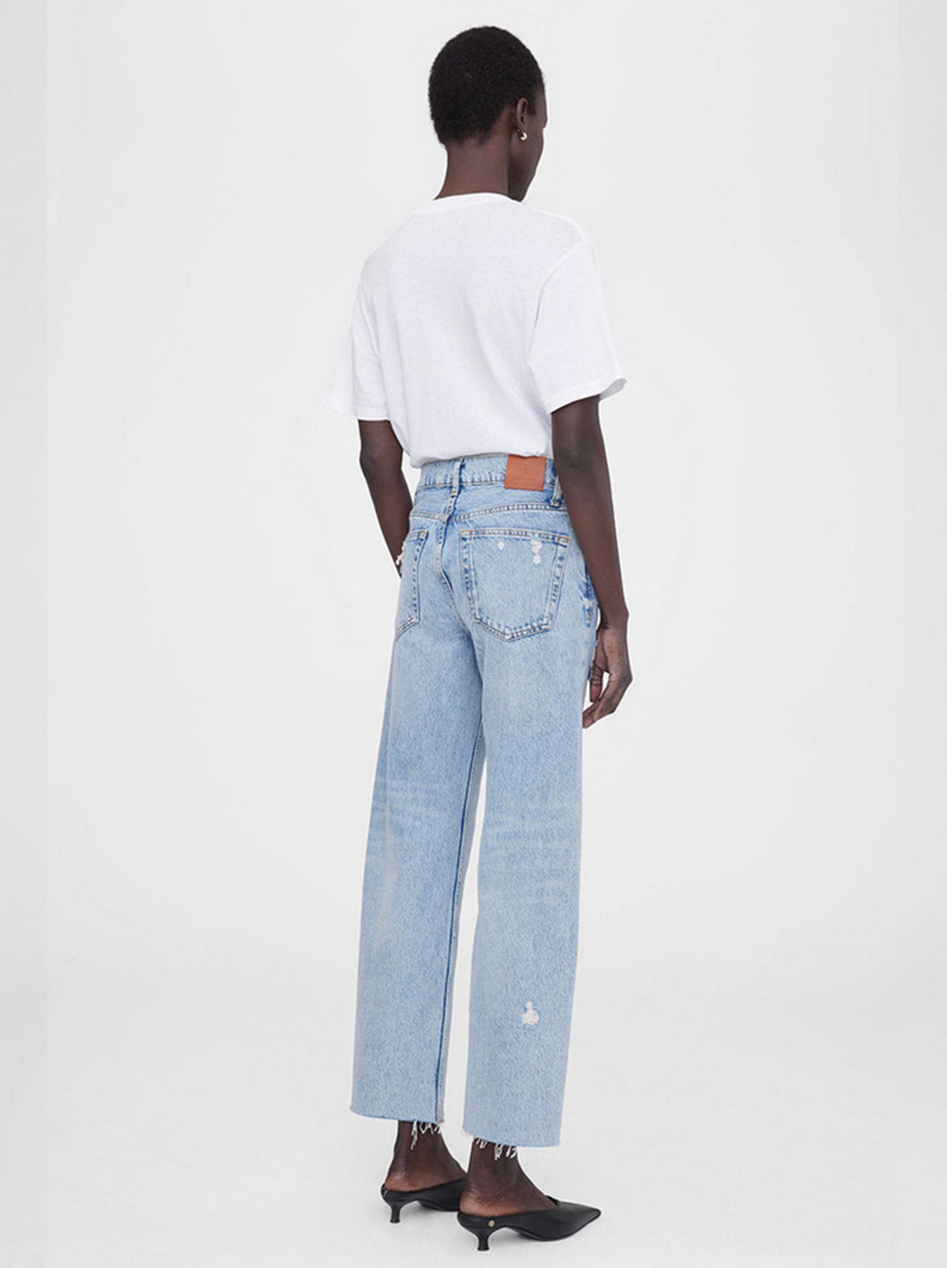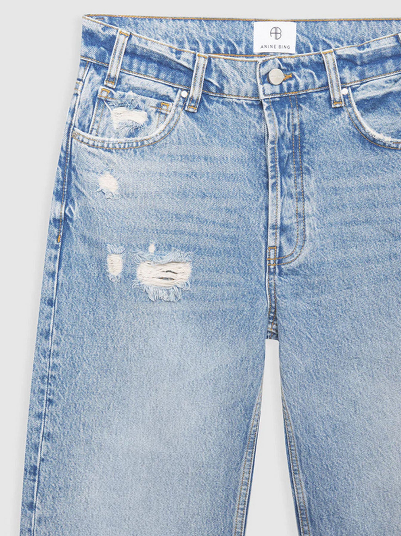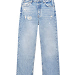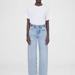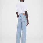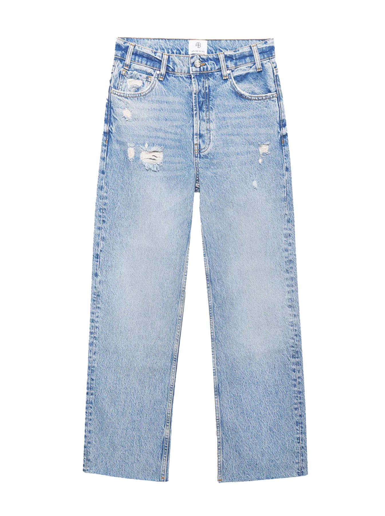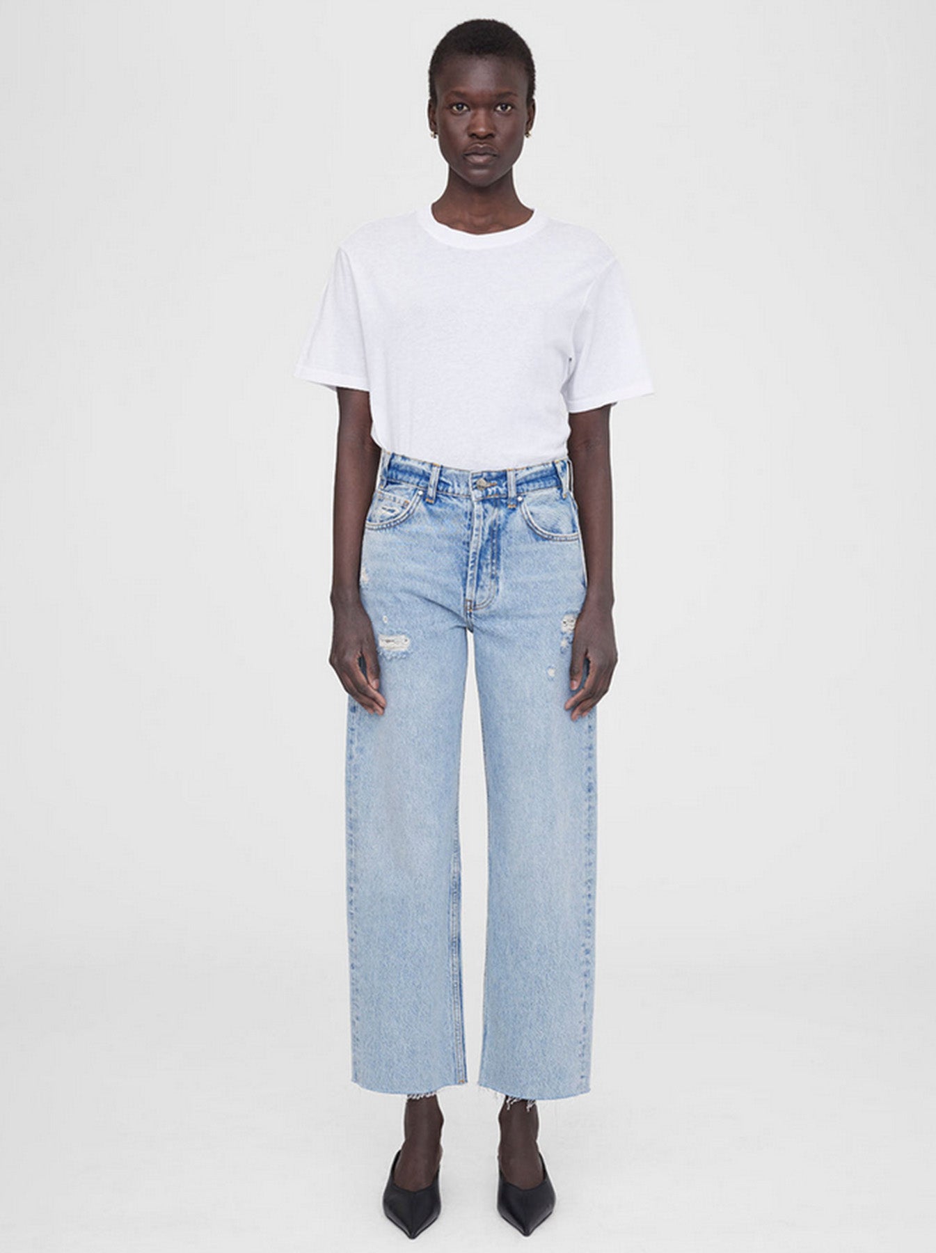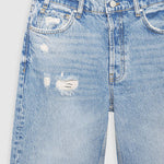 The Anine Bing Gavin jeans are a cropped boyfriend style fabricated from heavyweight 100% cotton rigid denim. The faded light blue wash features distressing on the front as well as the back pockets, making them the perfect summer denims for that easy on-the-go look. They’re finished with a raw-edge, ankle-length hem for added edge.