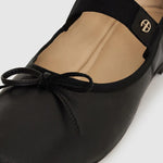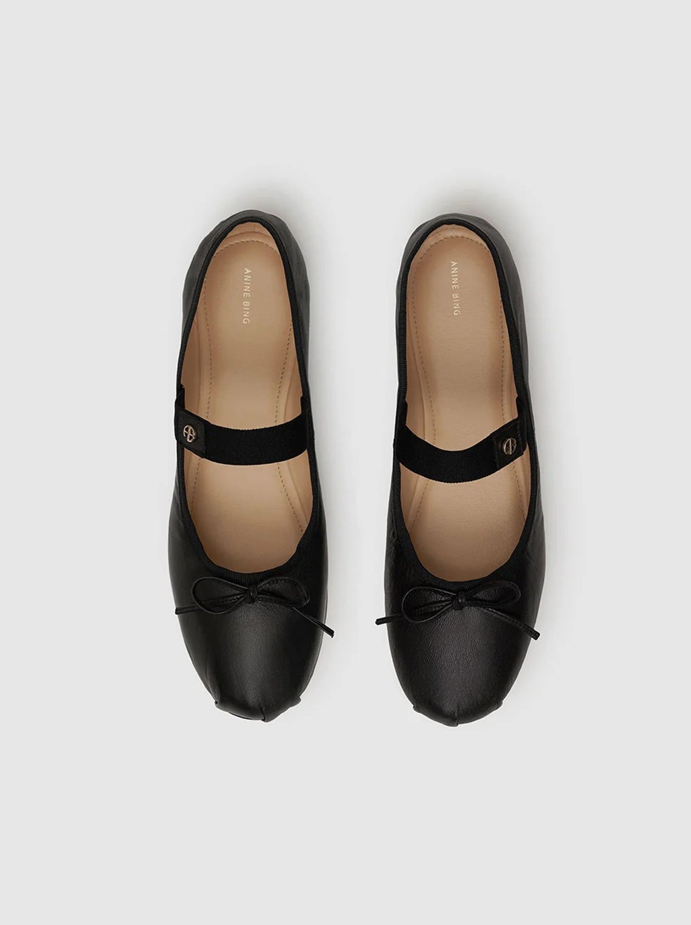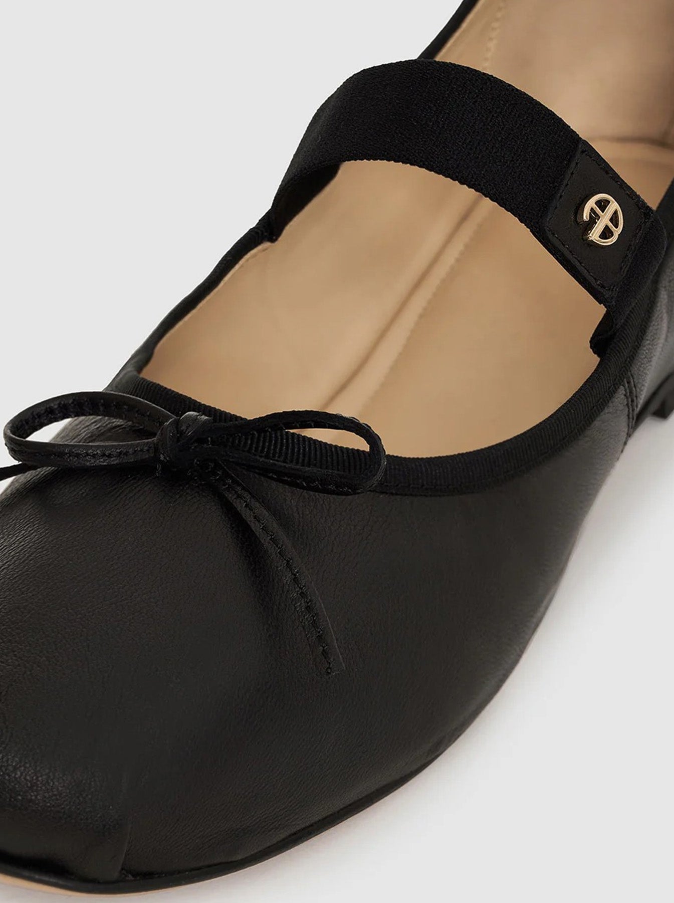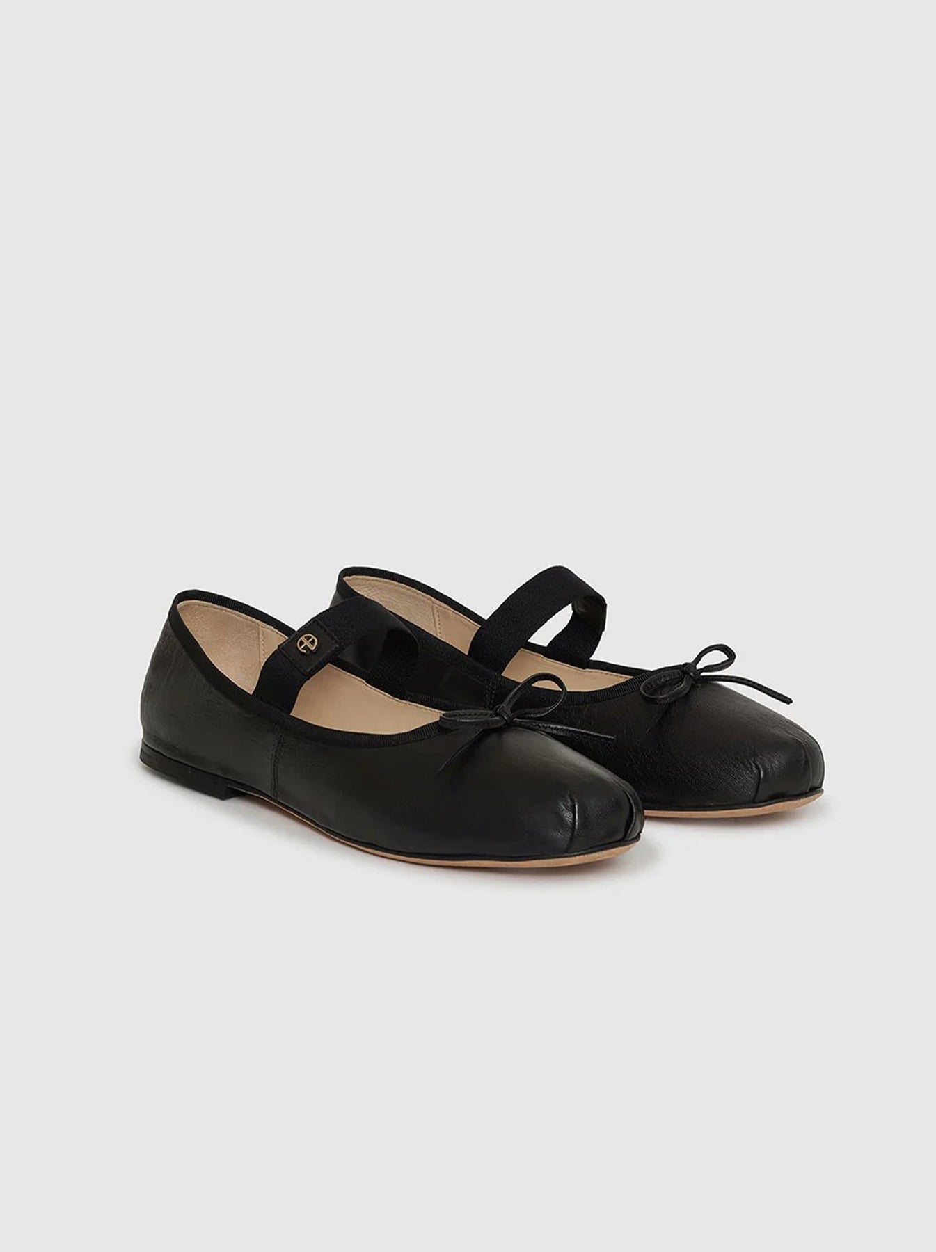- Ballet inspired flat, rounded toe, leather bow, elastic strap for secure fit, gold Anine Bing hardware