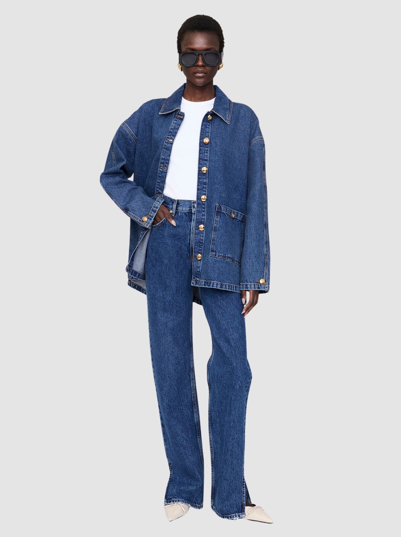- Details: Relaxed, long-sleeve, long-line cotton jacket with oversized front pockets, gold snap-buttoned front placket, and button-detailed broad cuffs