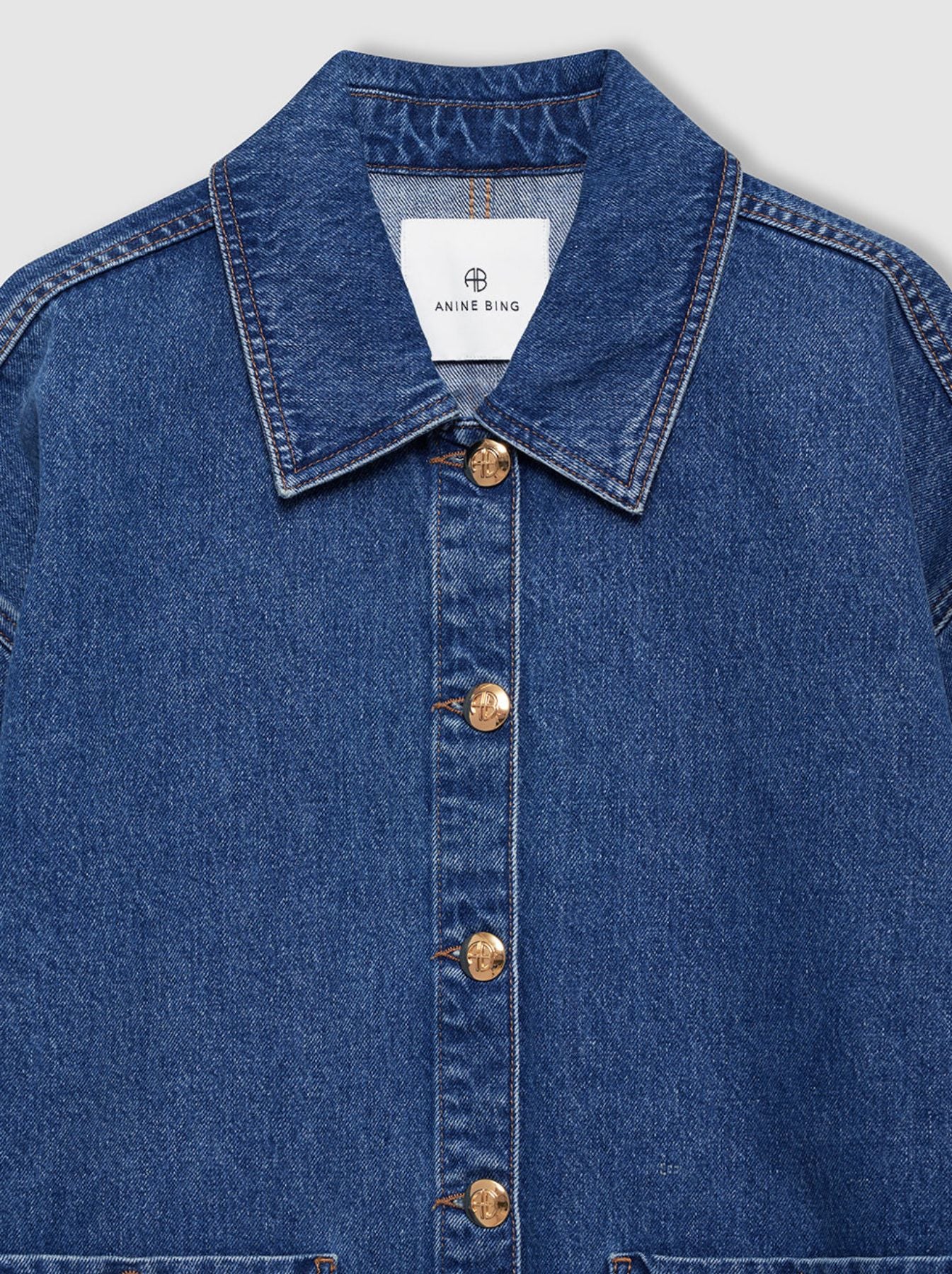 - Hardware: Gold-toned "AB" engraved, domed snap-buttons