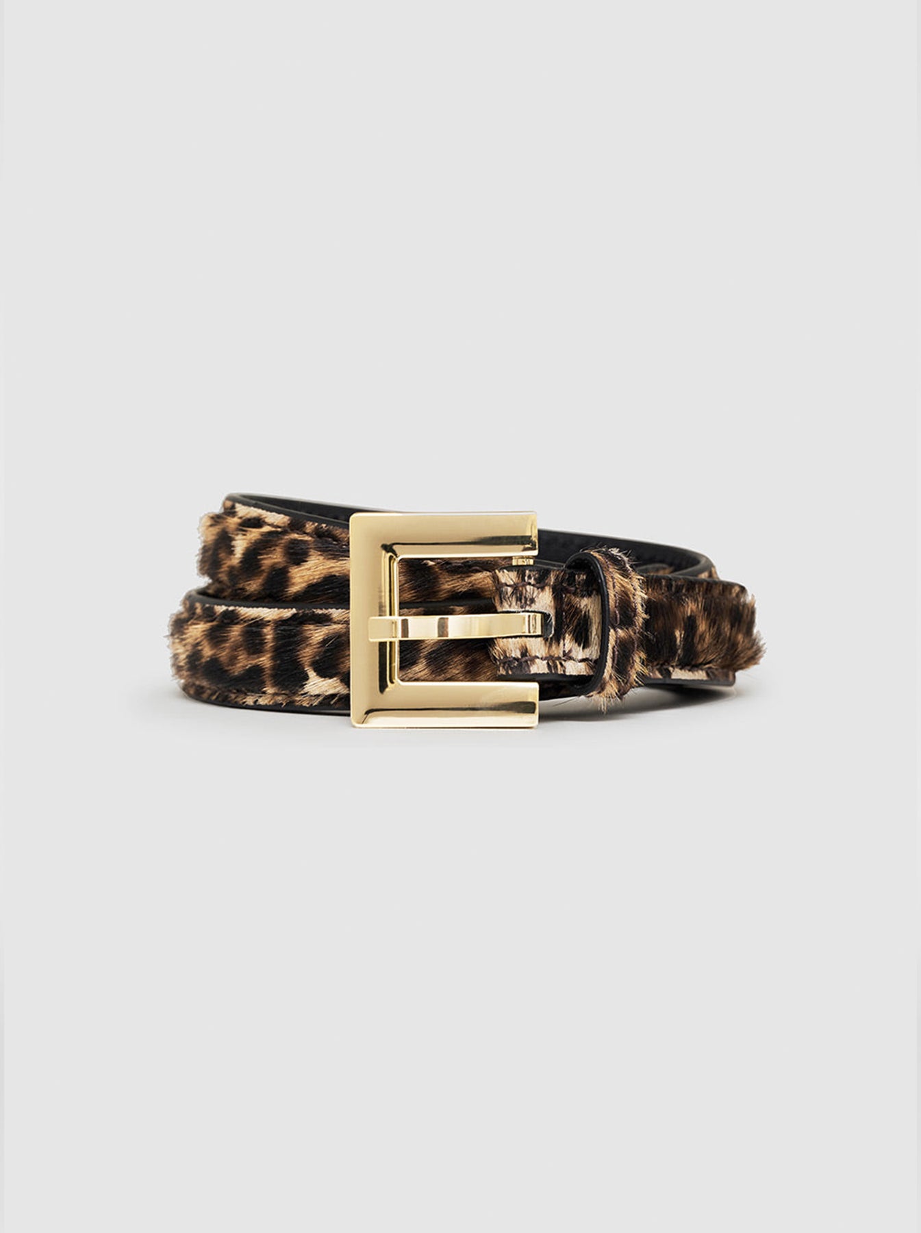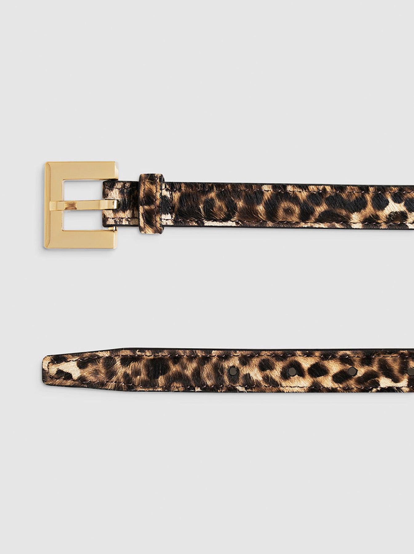 - Details: 100% leopard print calf hair leather belt, with slightly padded strap, accented by a unique 14k gold- plated square buckle