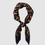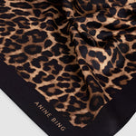 The Anine Bing York Scarf is a square neck scarf crafted from 100% silk twill, featuring a black and brown leopard print with subtle ANINE BING branding. Wear around your neck or tie around your handbag handle for a on trend accent.