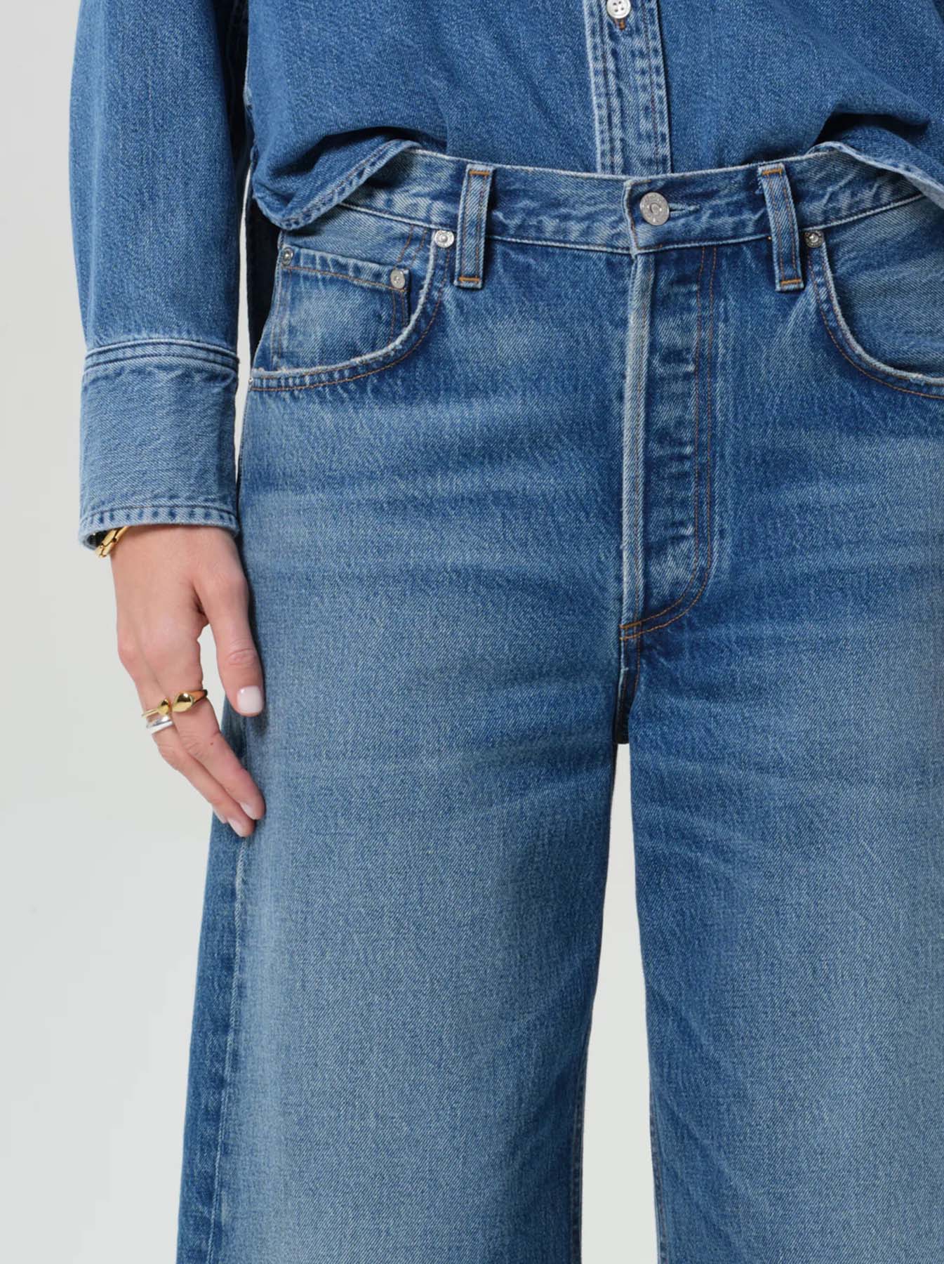 - Details: Mid-rise rigid denim, classic 5 pockets, belt loops, clean hem, full-length inseam, with slight distressing, whiskering, and fading on upper thigh and knees, concealed button-fly.