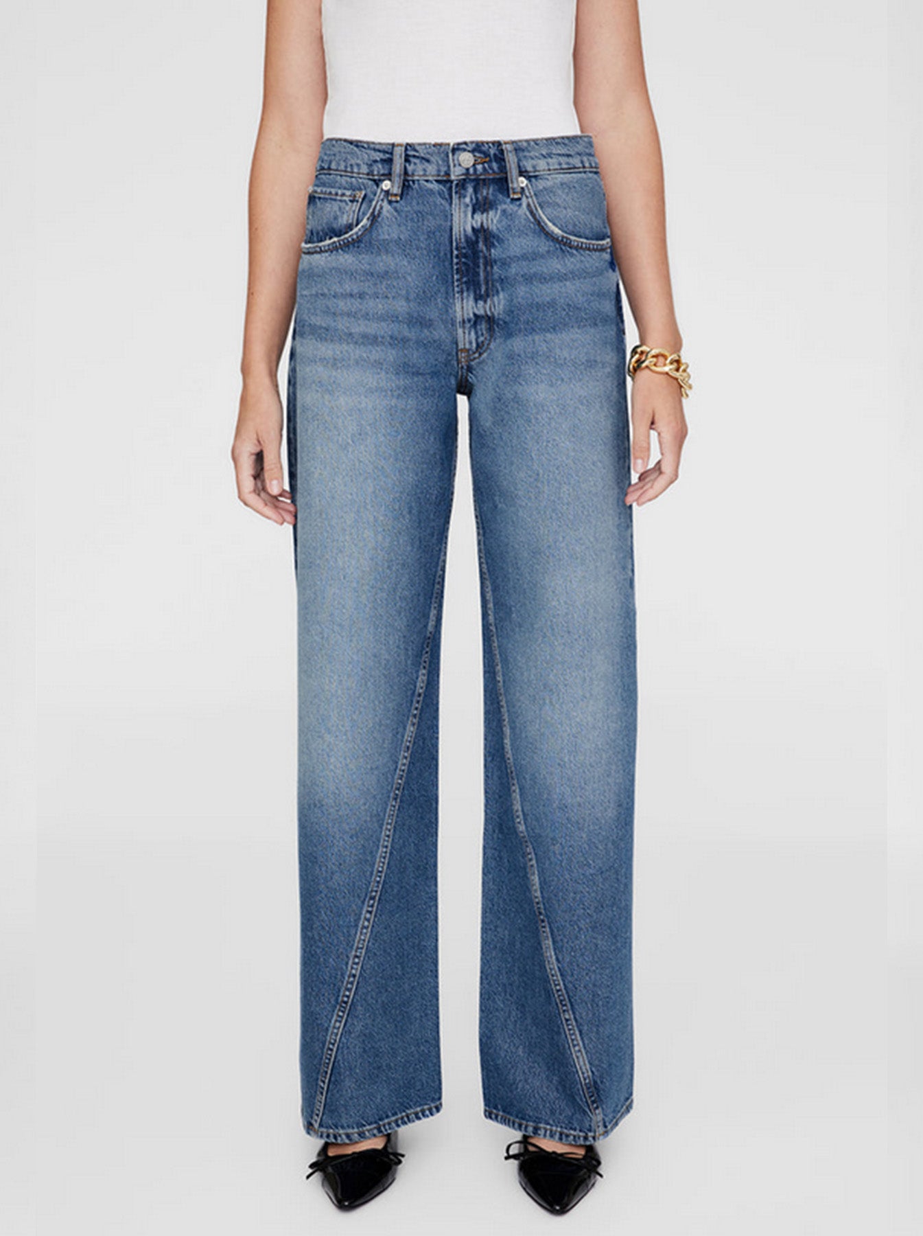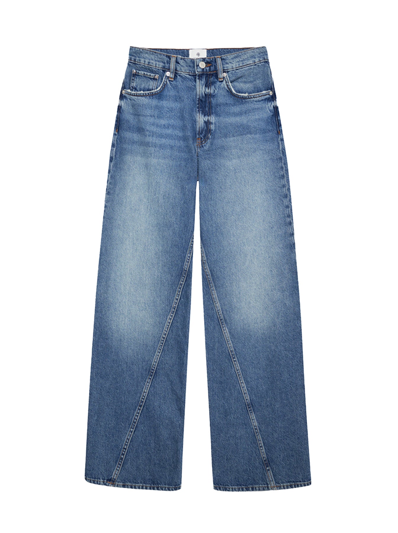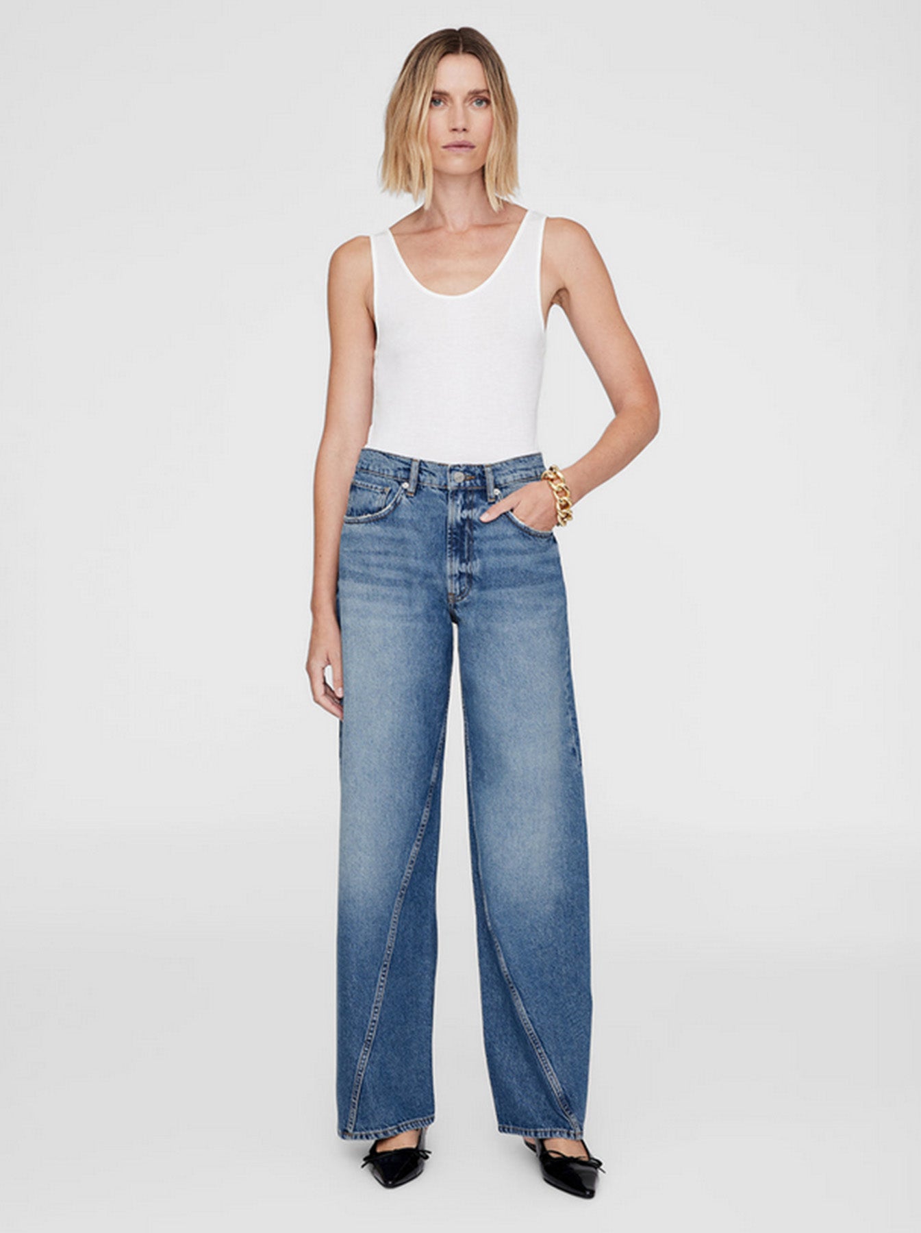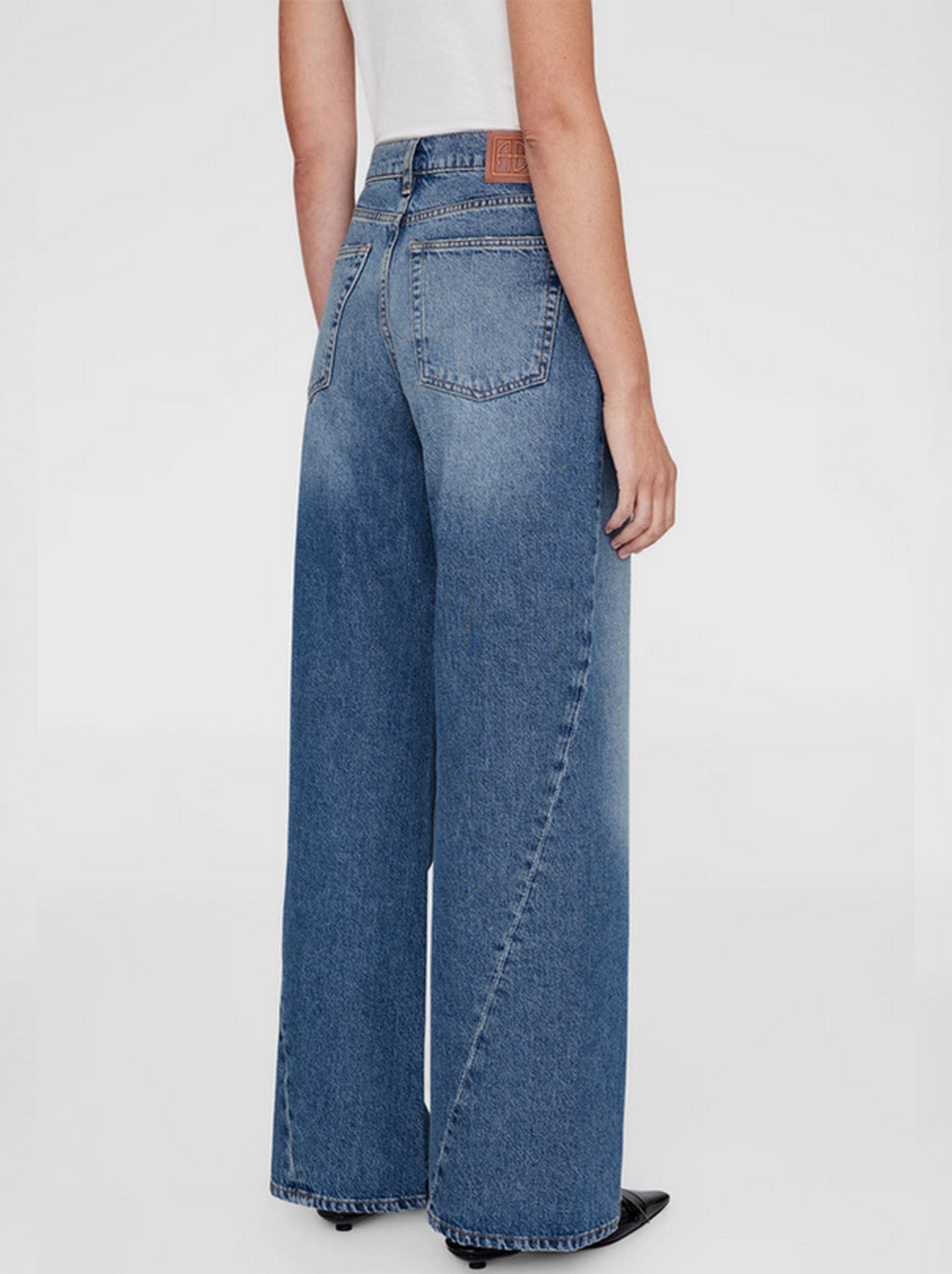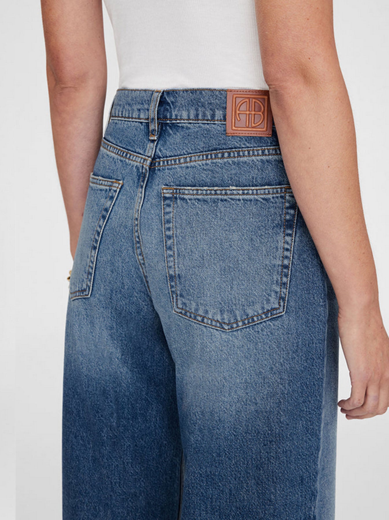 Introducing Anine Bing's Brie Jean - a comfortable, relaxed fit made from high-quality rigid cotton with no stretch. The bright indigo wash and slight drape add a soft touch to this classic style. Features include a high rise, button-fly closure, wide leg, and twisted seam detailing.