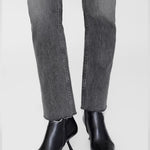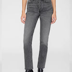Details: High rise, straight leg with an ankle-length inseam and raw-edge hem, fading and whiskering, hidden zipper fly closure
