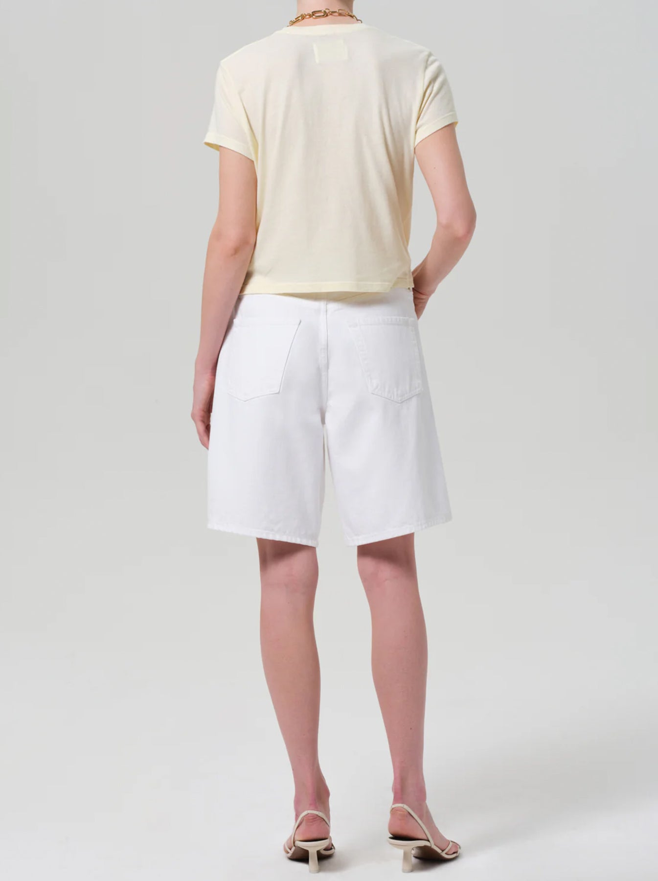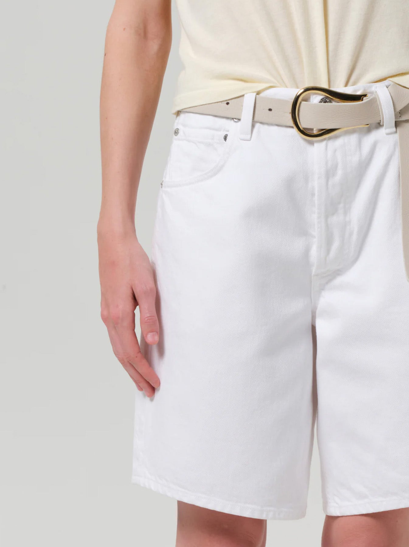 Citizens of Humanity updates classic summer denim with the Ayla Denim Short Clean Hem, a longer Bermuda-style cut with a relaxed mid-rise fit. Crafted from rigid, opaque white denim, it holds its shape while gradually softening with wear for lasting comfort. The clean hem keeps the silhouette sharp and polished, emphasizing its modern, structured look. Pair with a breezy blouse and jelly flip flops for a casual, sun-ready summer outfit.