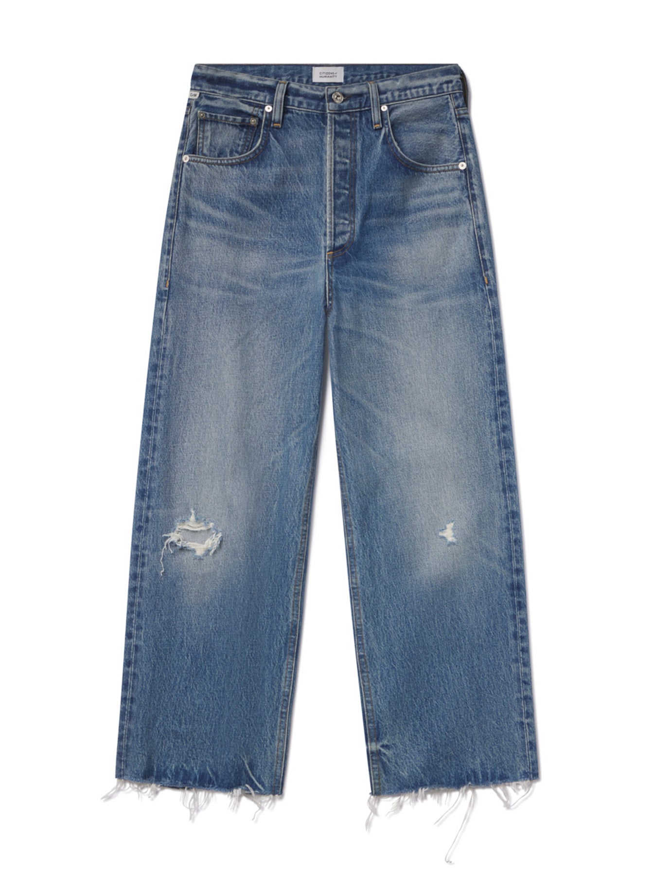 - Details: Mid-rise rigid denim, classic 5 pockets, belt loops, raw hem, full-length inseam, with slight distressing, whiskering, and fading on upper thigh and knees, concealed button-fly.