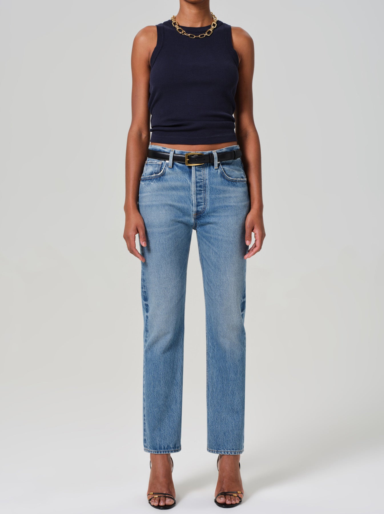 - Details: High-waisted blue denim with slight fading/whiskering, with straight leg silhouette, classic five-pocket design, belt loops, monotonal stitching, and a concealed zip-fly