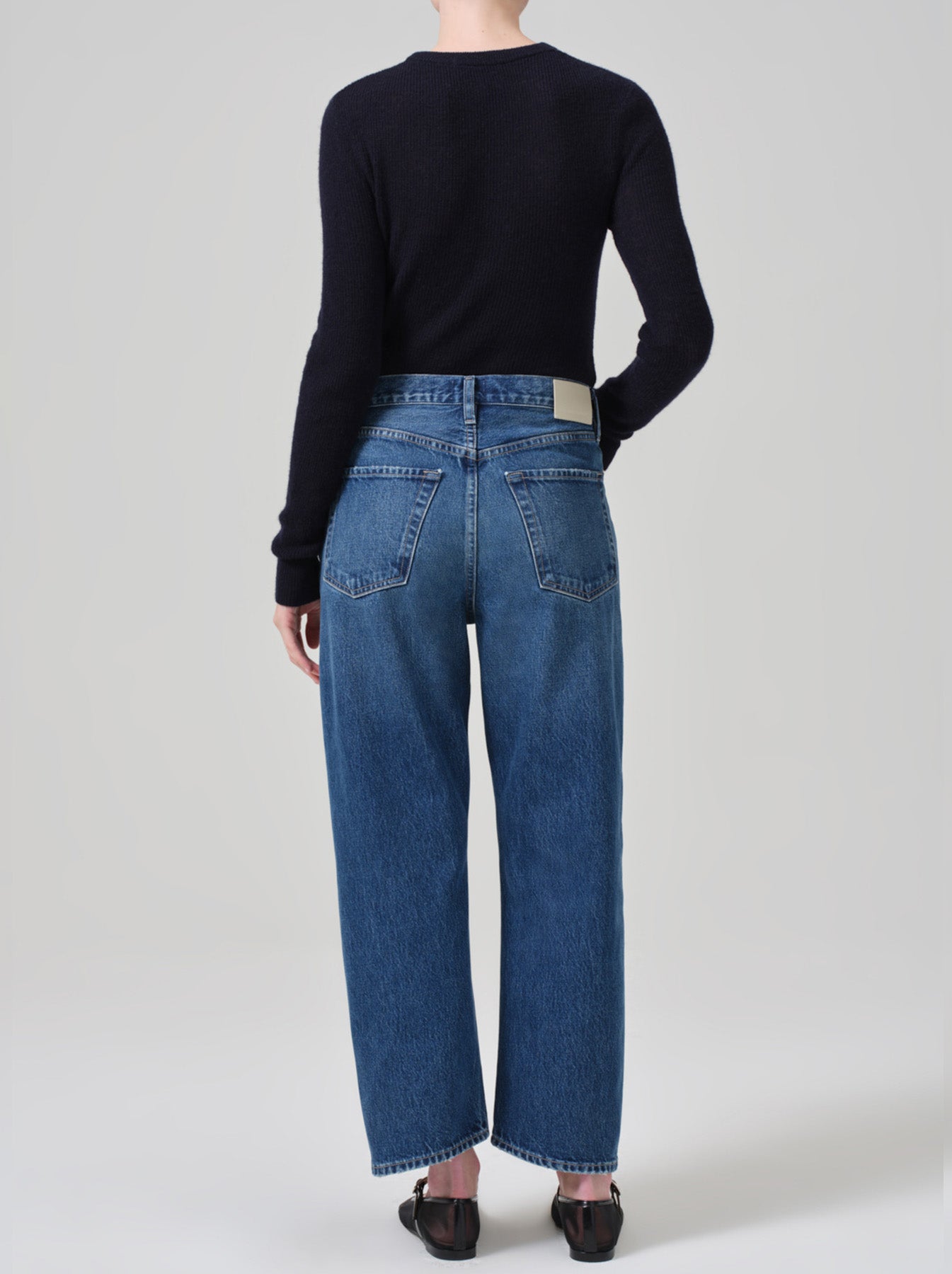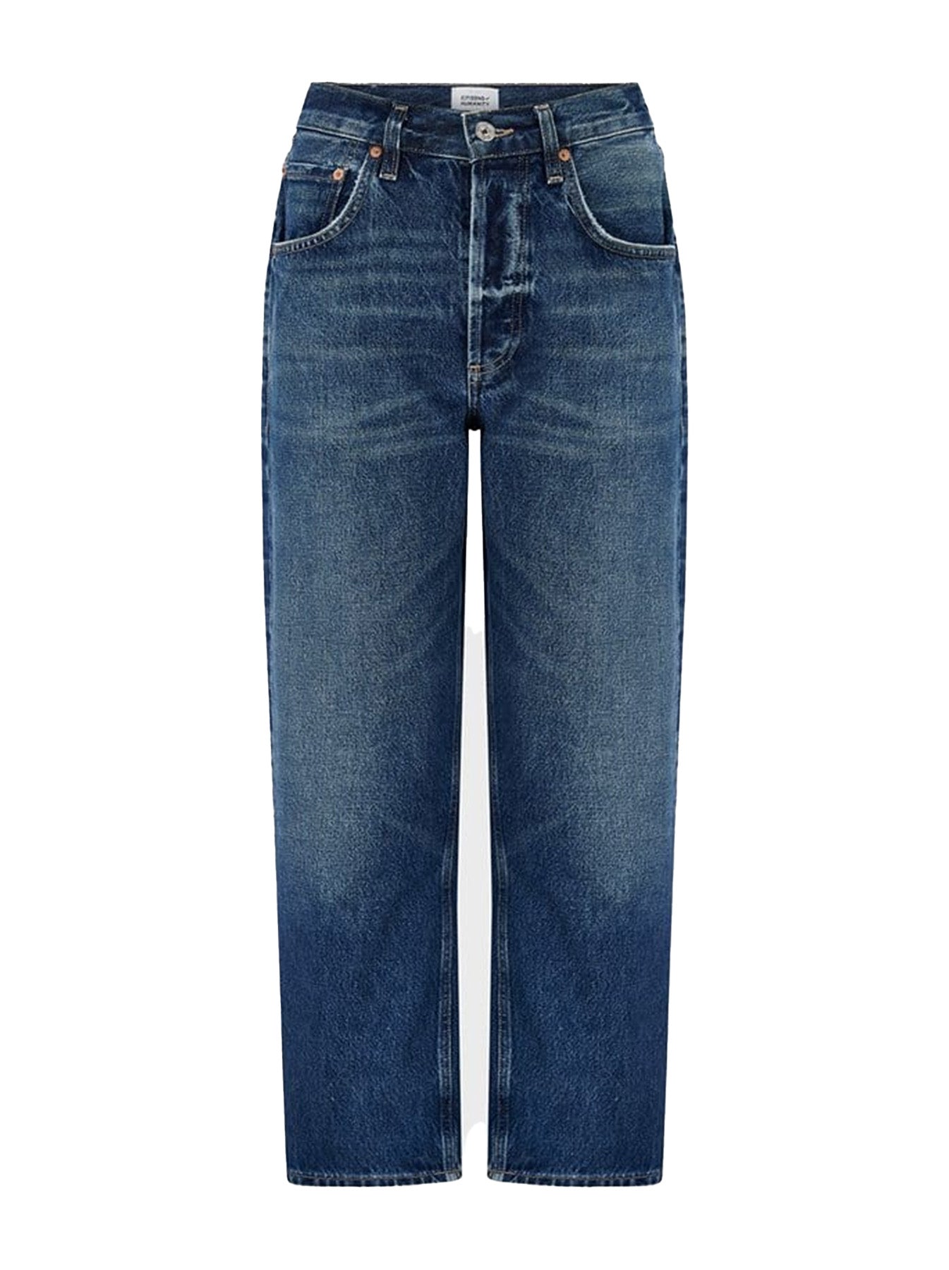 Details: Classic 5 pockets, belt loops, faded and slightly whiskered mid-blue denim, clean hem with uneven baby roll finish, button fly