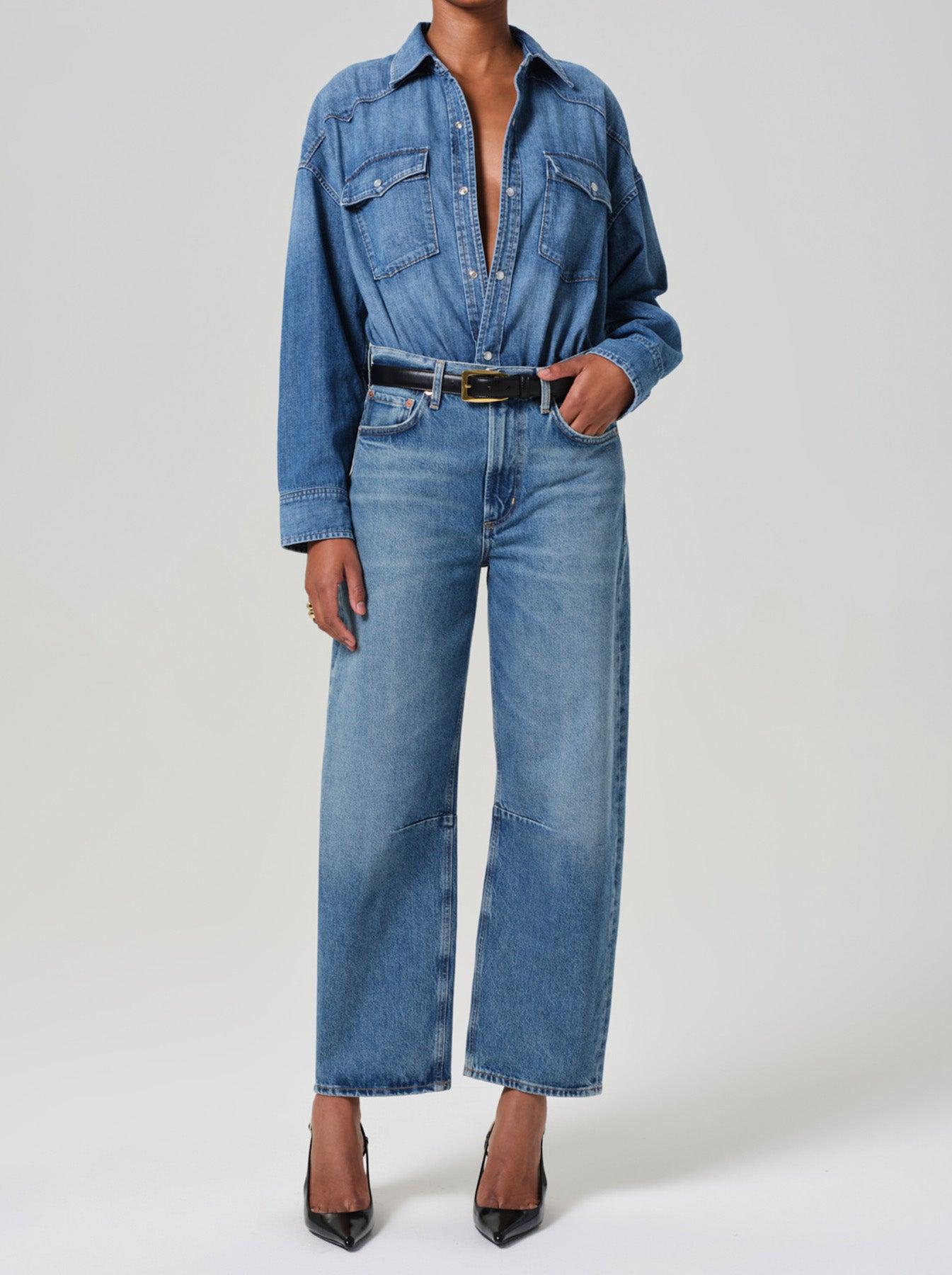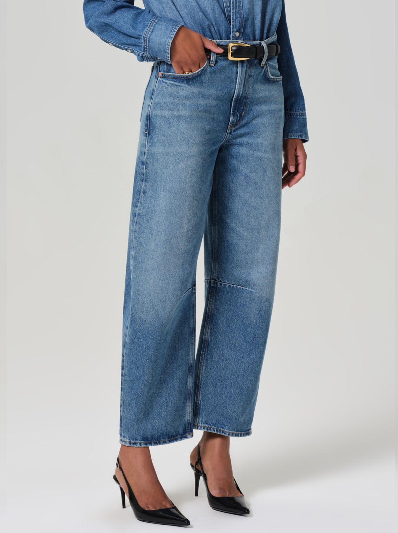 The Miro Relaxed denim from Citizens of Humanity offers a fresh take on the barrel leg silhouette with a slightly relaxed top half and subtle taper to the ankle. Crafted from rigid 100% cotton denim in a versatile mid-blue wash, this style effortlessly combines fashion with comfort. Pair them with a denim shirt, kitten heels and an accent belt for an elevated everyday look.