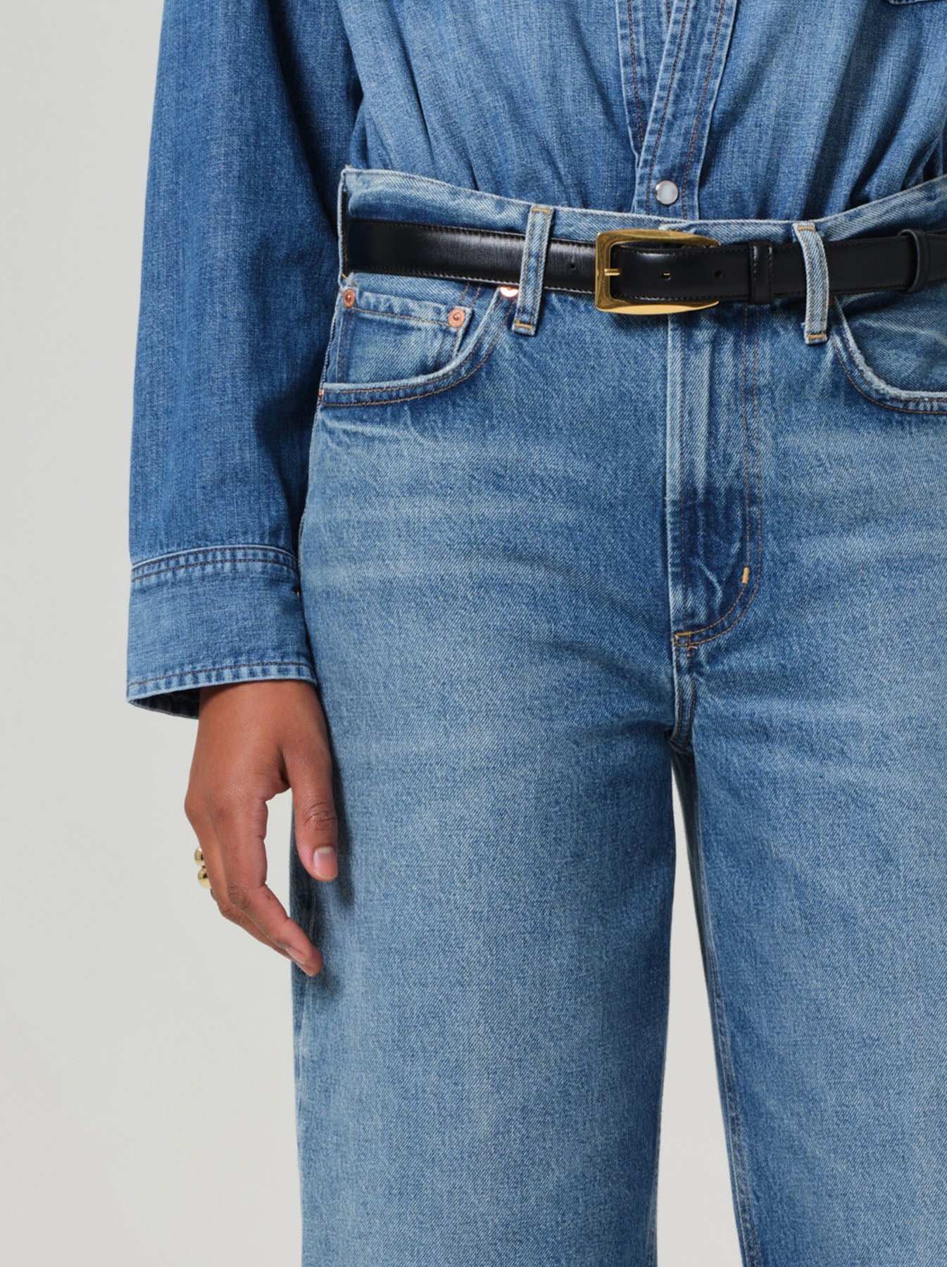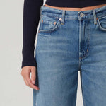 Details: Mid to High rise, classic 5 pockets, belt loops, mid-blue wash denim, clean full-length hem with slight barrel leg