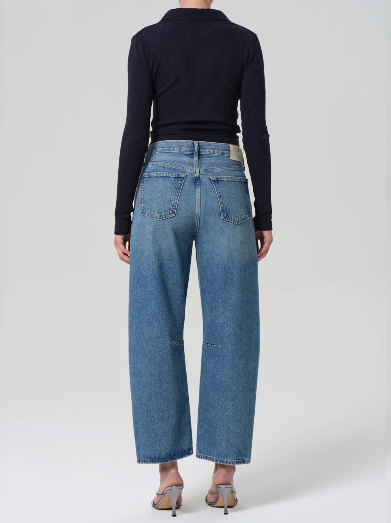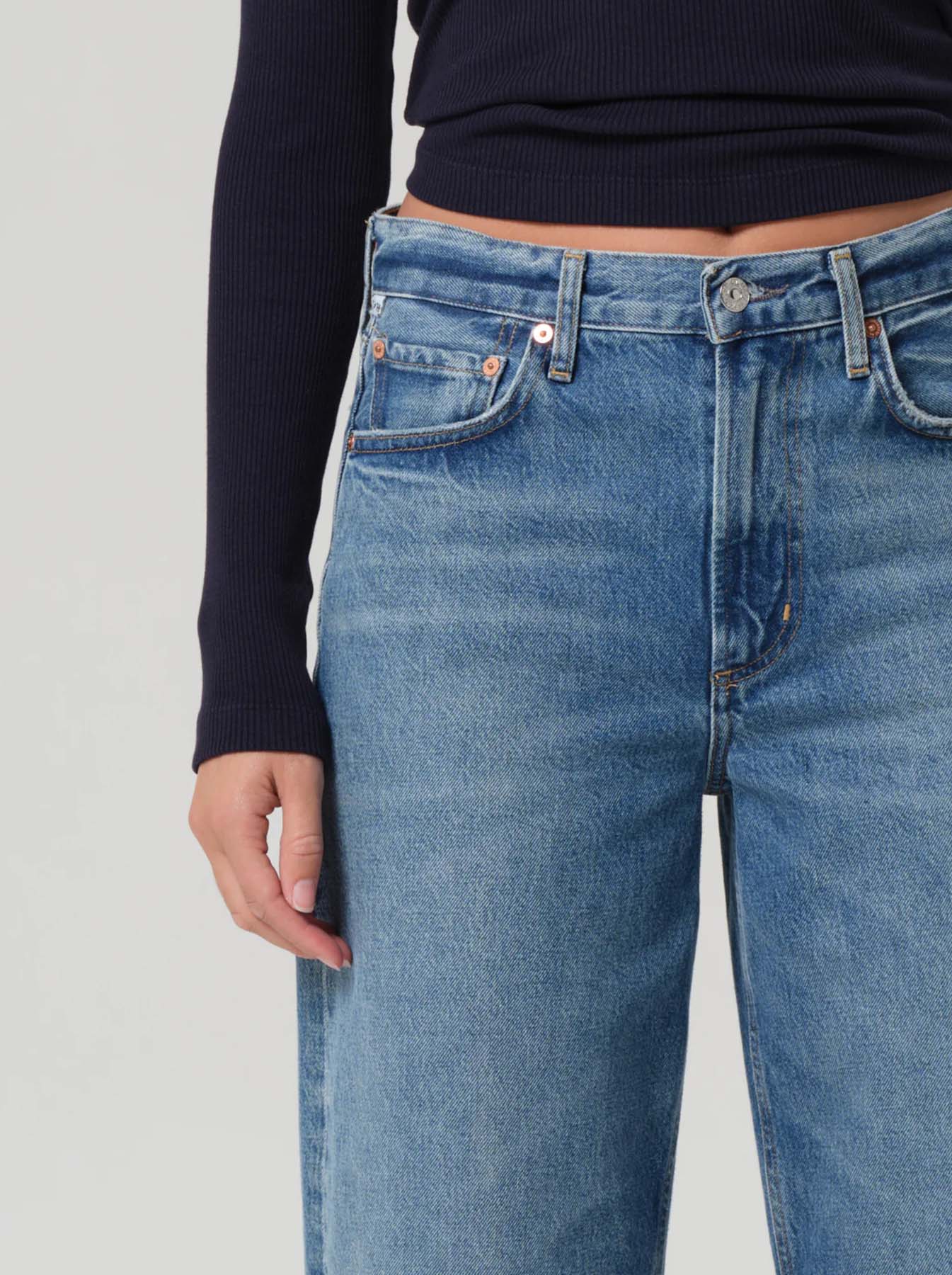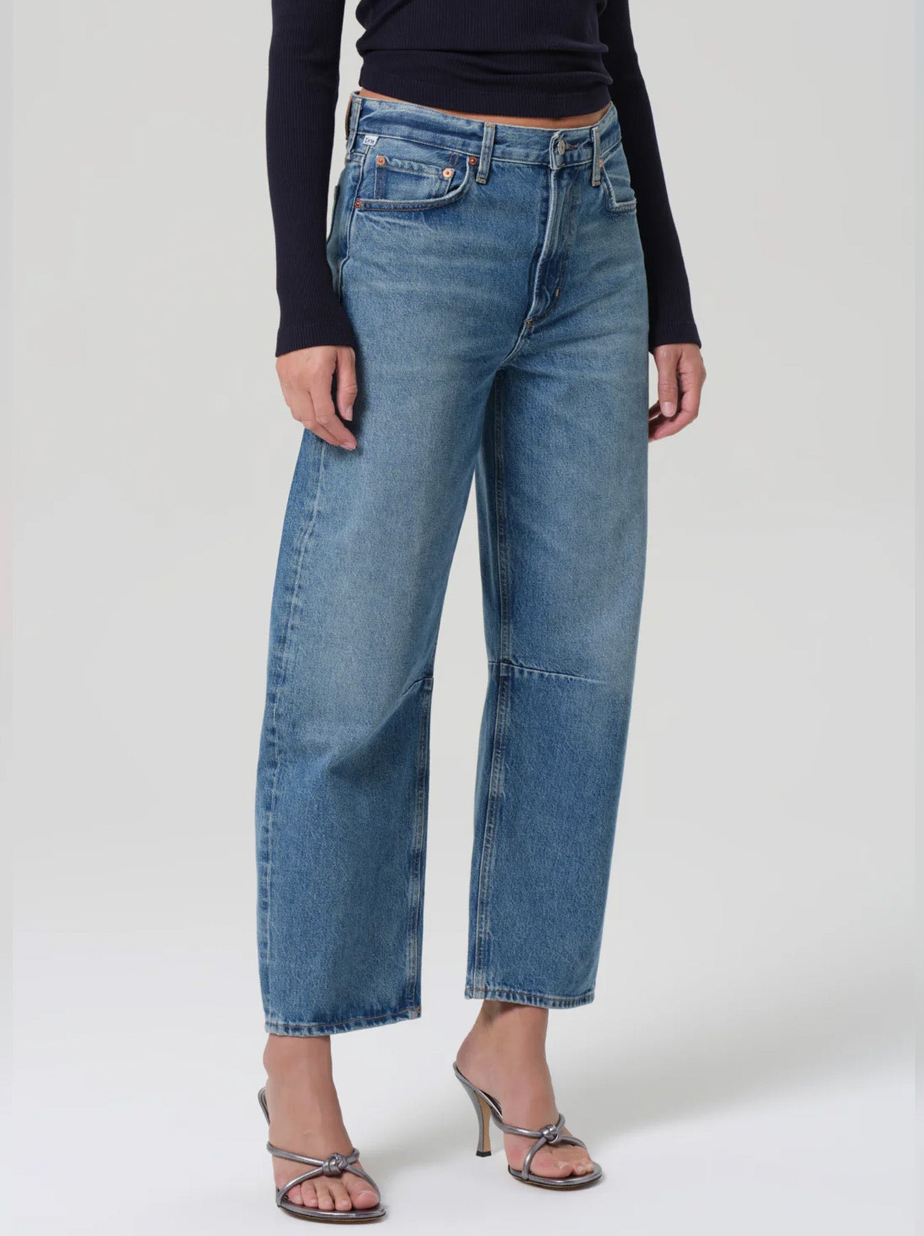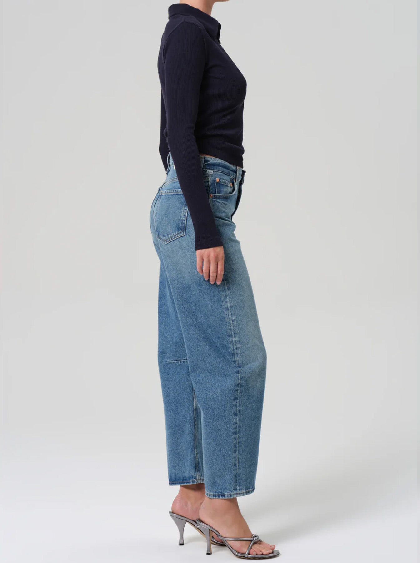 High-rise but made to be worn lower on hips, barrel leg