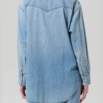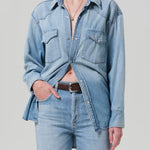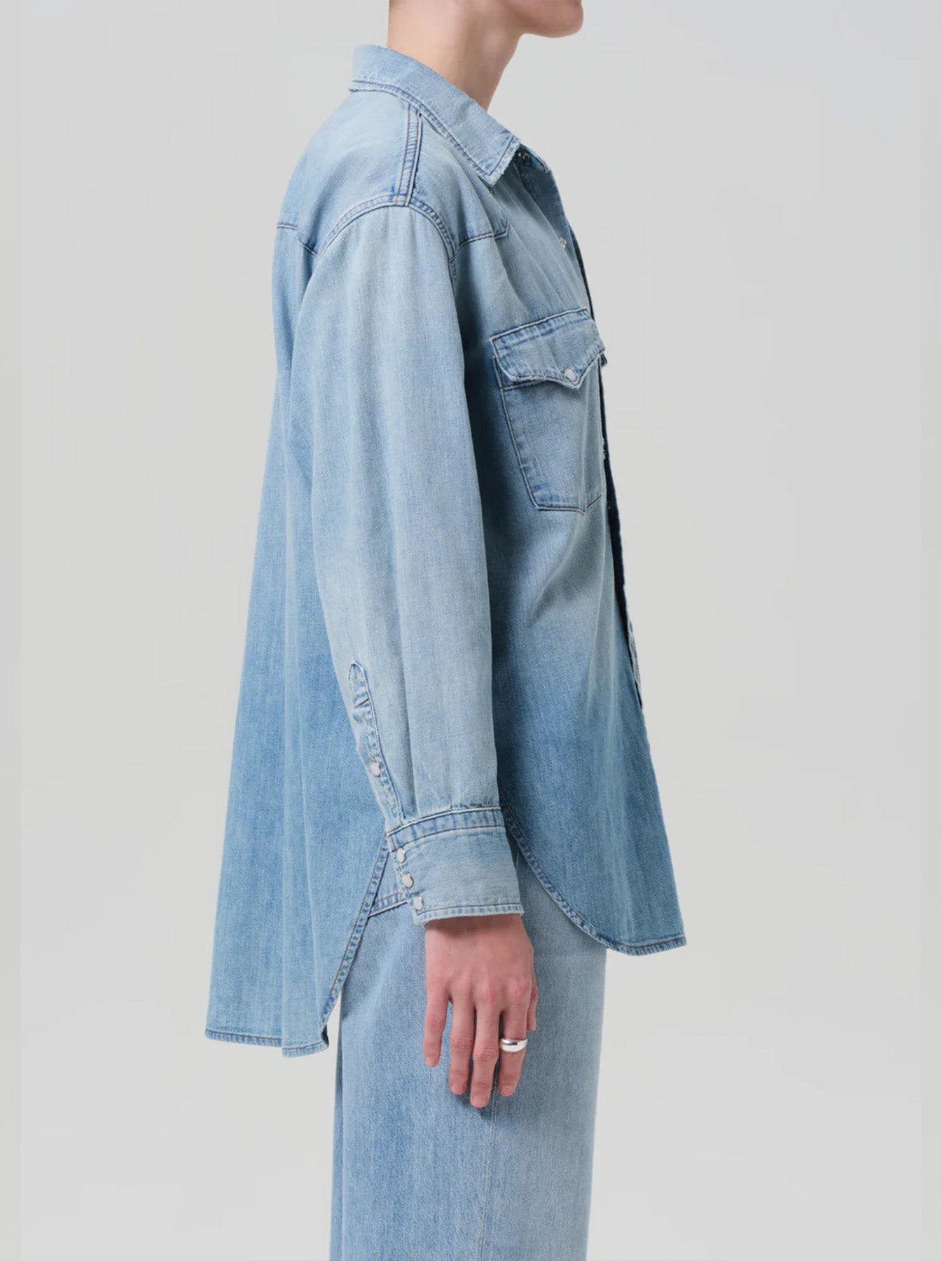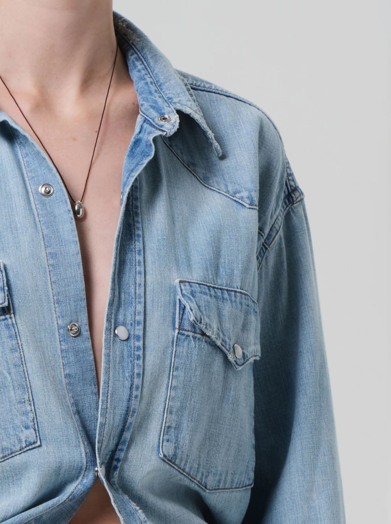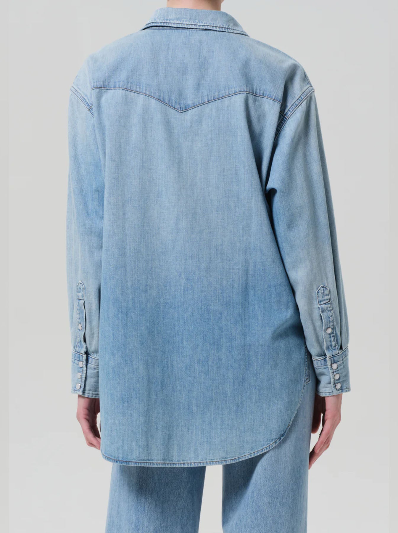 Effortless, modern tailoring defines Citizens of Humanity’s Rancher Kayla Shirt, a relaxed-fit button-down crafted for everyday wear. Made from soft, breathable cotton with a subtle denim wash, it drapes comfortably while maintaining structure. Subtle stitching details and a slightly curved hem give the shirt understated character and a versatile finish. Pair it with monotone denims for a chic, modern denim-on-denim look.