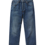 - Details: Low-rise rigid boyfriend silhouette denims, that are worn low on the waist and are relaxed from the hip throughout, cropped inseam, with classic five-pocket design, dark blue denim with tonal stitching and subtle fading, with concealed button fly