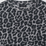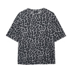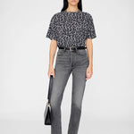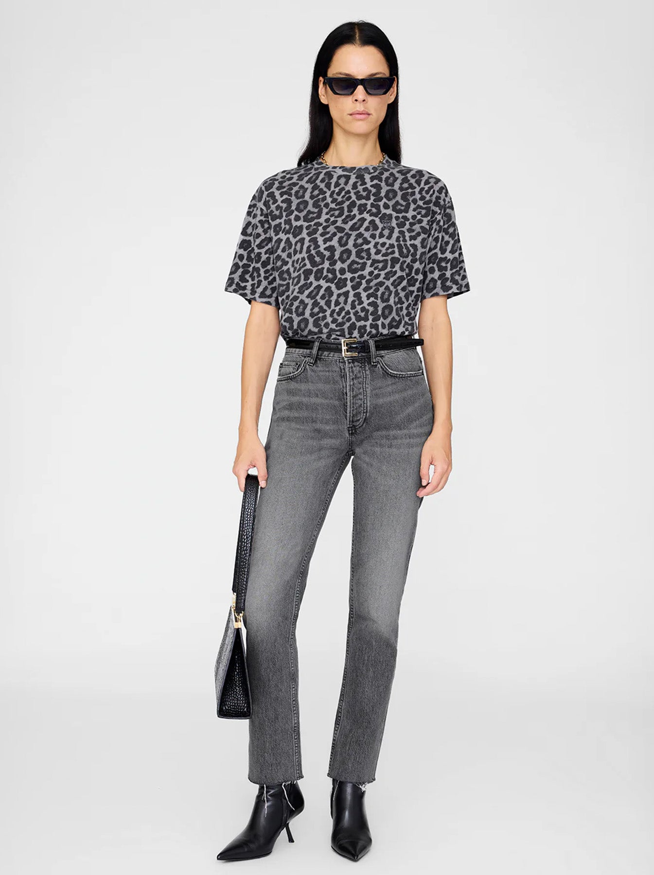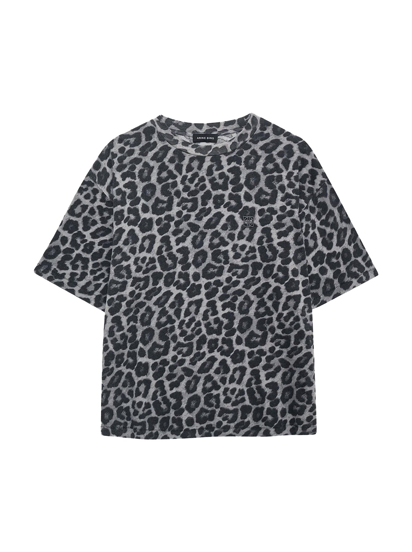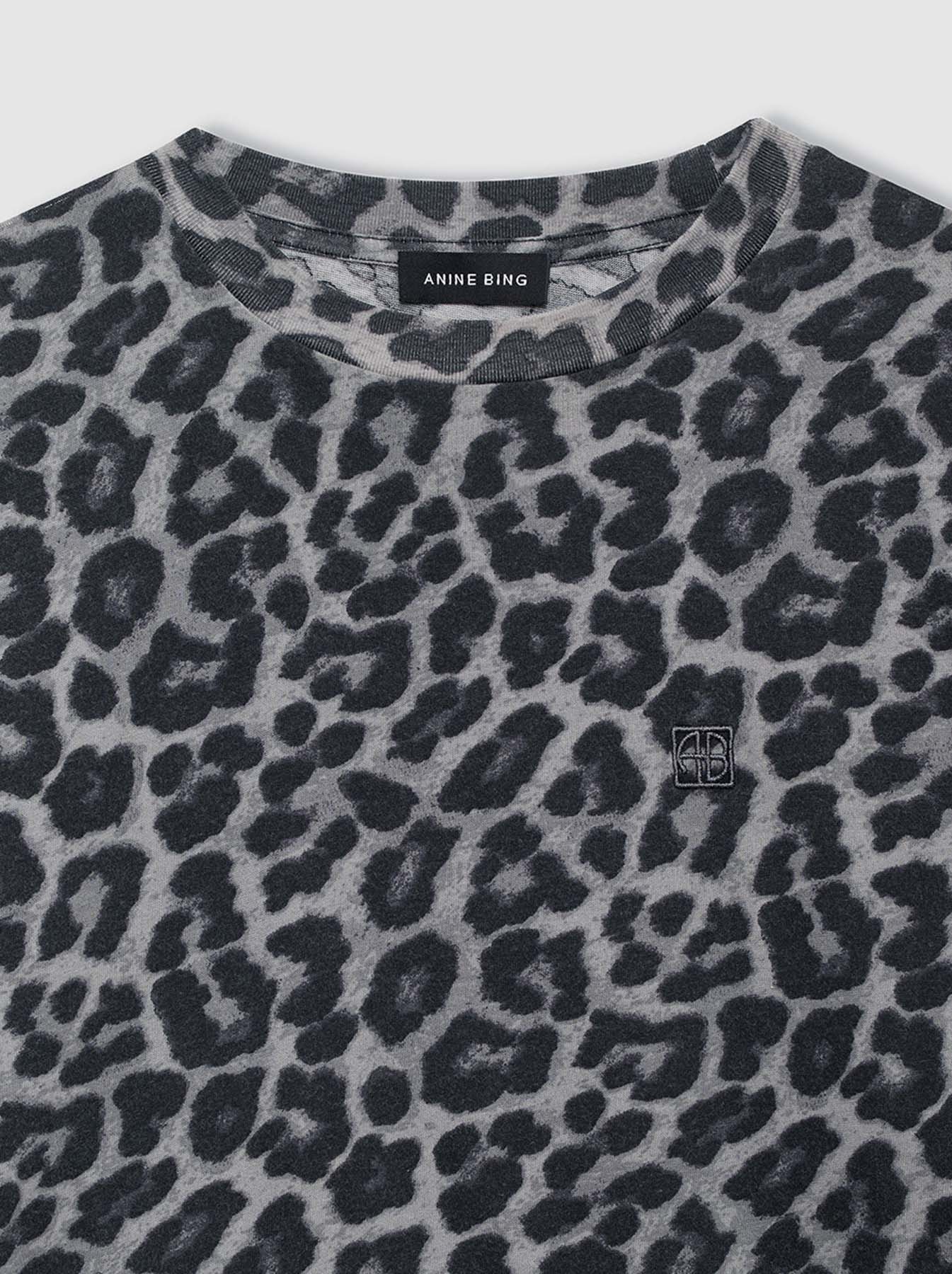 Details: Oversized, boxy fit, ribbed crew neck, washed black tee with faded off-white "Anine Bing" & leopard screen print.