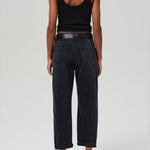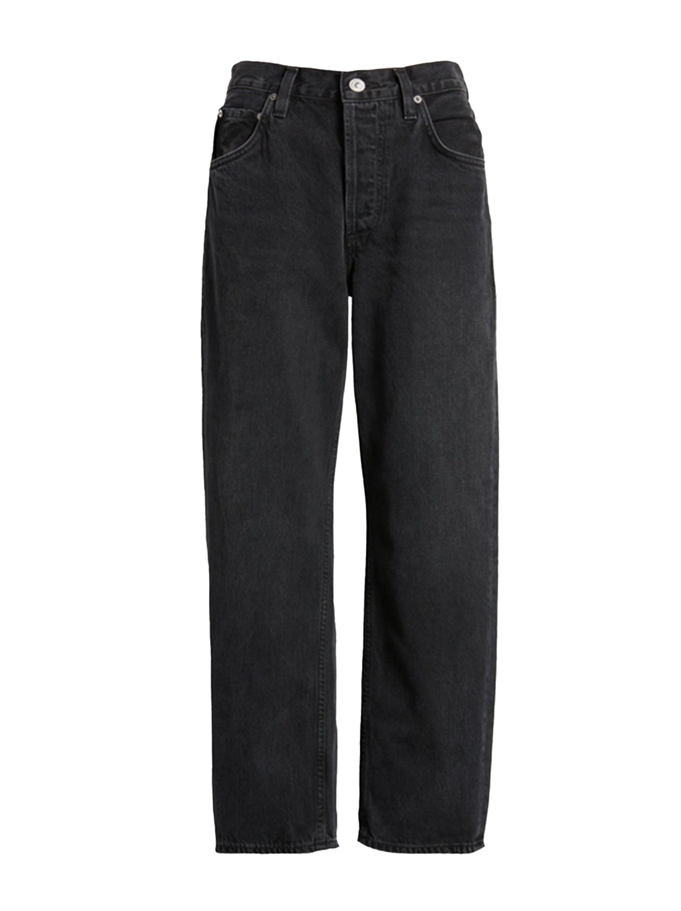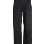 Details: Classic 5 pockets, belt loops, faded and slightly whiskered black denim, clean hem with uneven baby roll finish, button fly