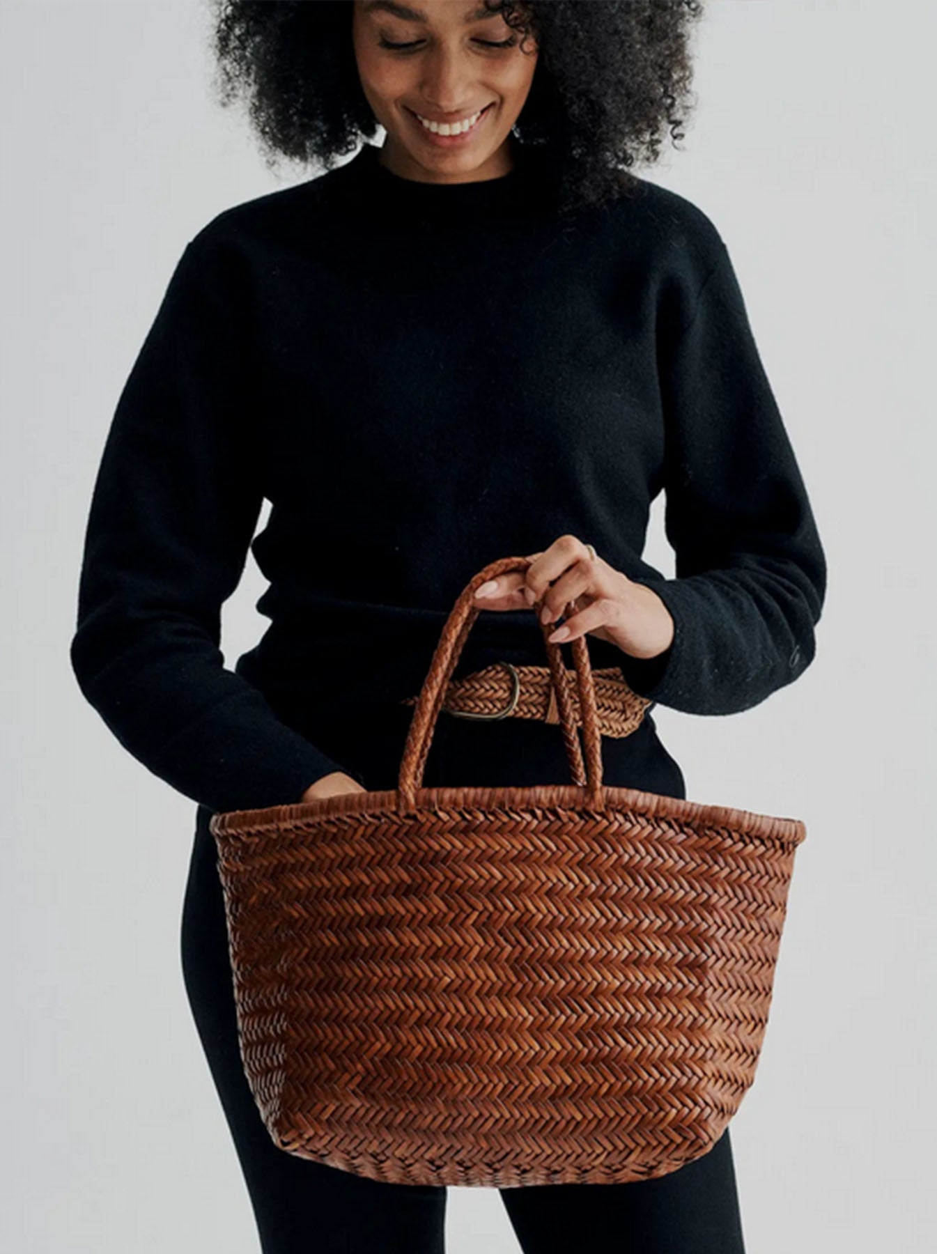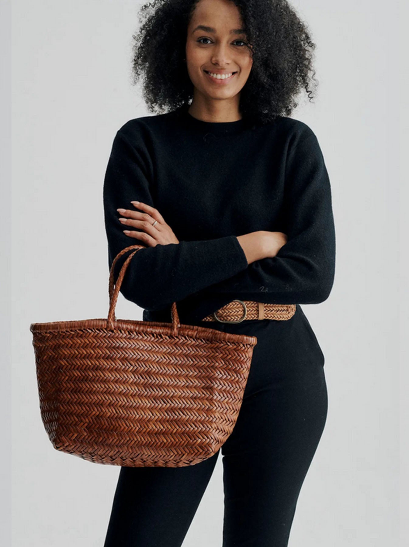 Dragon Diffusion introduces a larger take on its iconic best-seller—a spacious handwoven basket crafted from smooth buffalo calf leather. Skillfully made in one seamless piece by artisan weavers, it features a distinctive diagonal chevron weave that sets it apart. This timeless bag is unlined with an open-top design for effortless versatility.