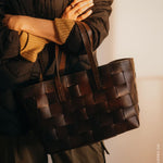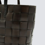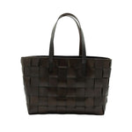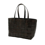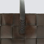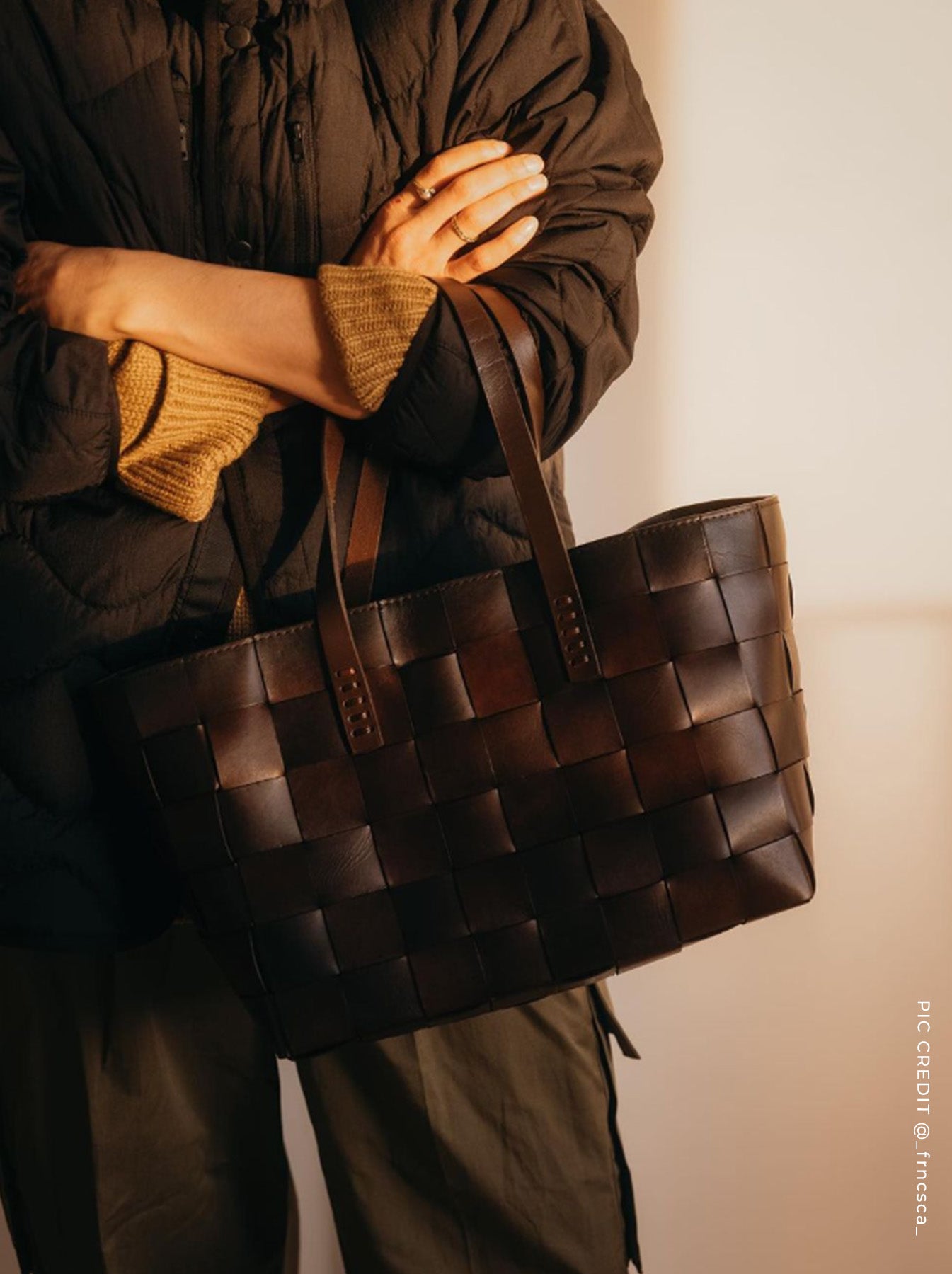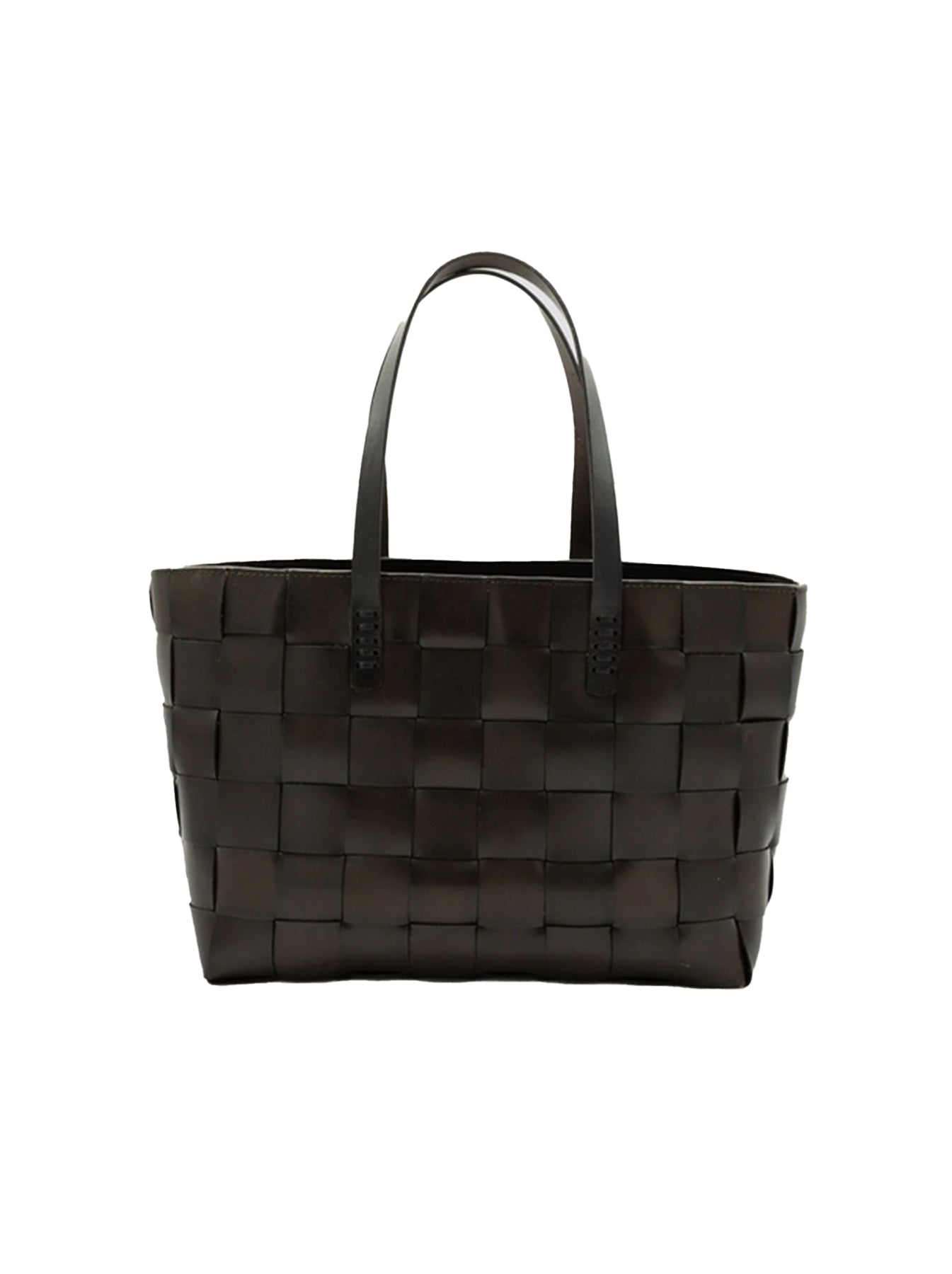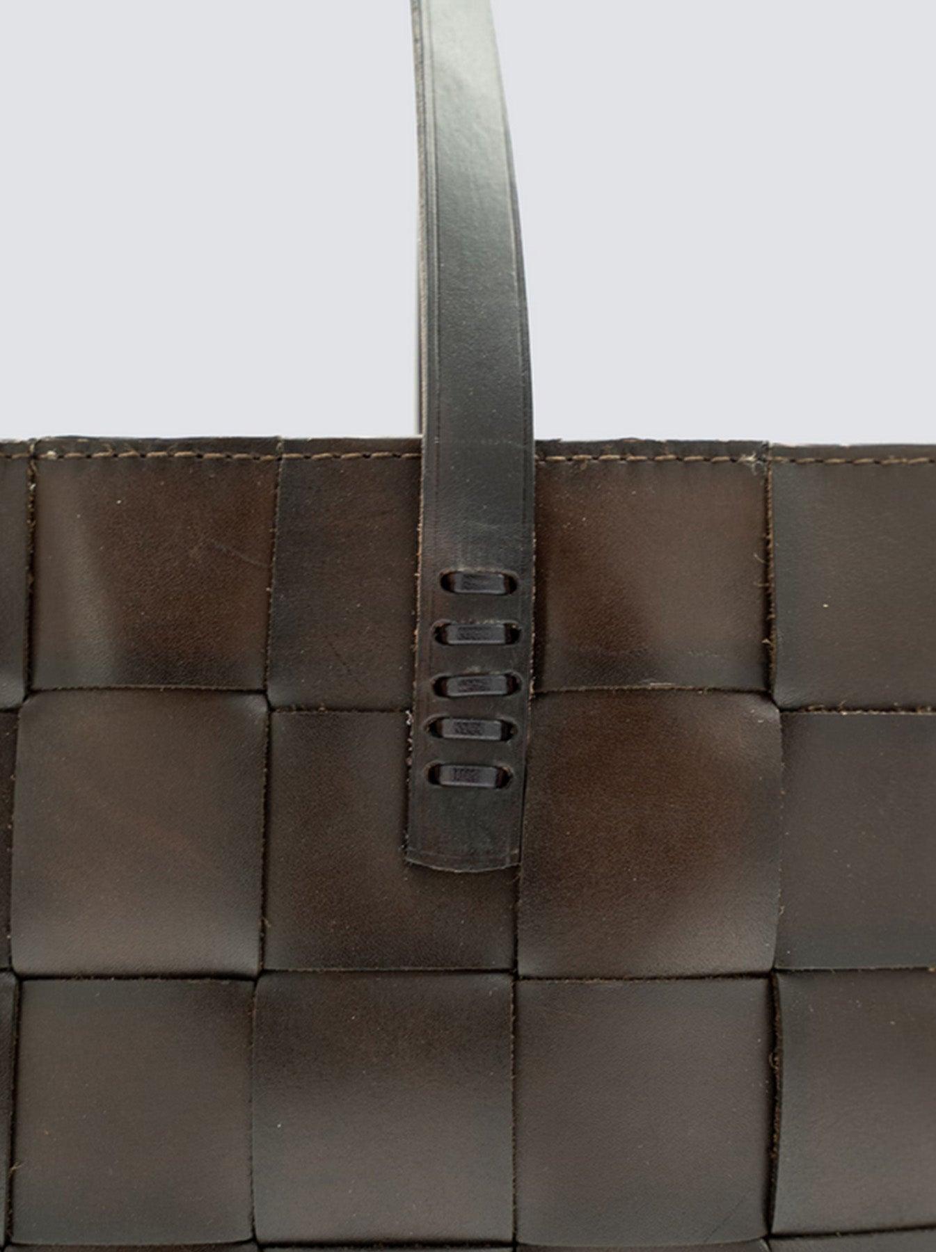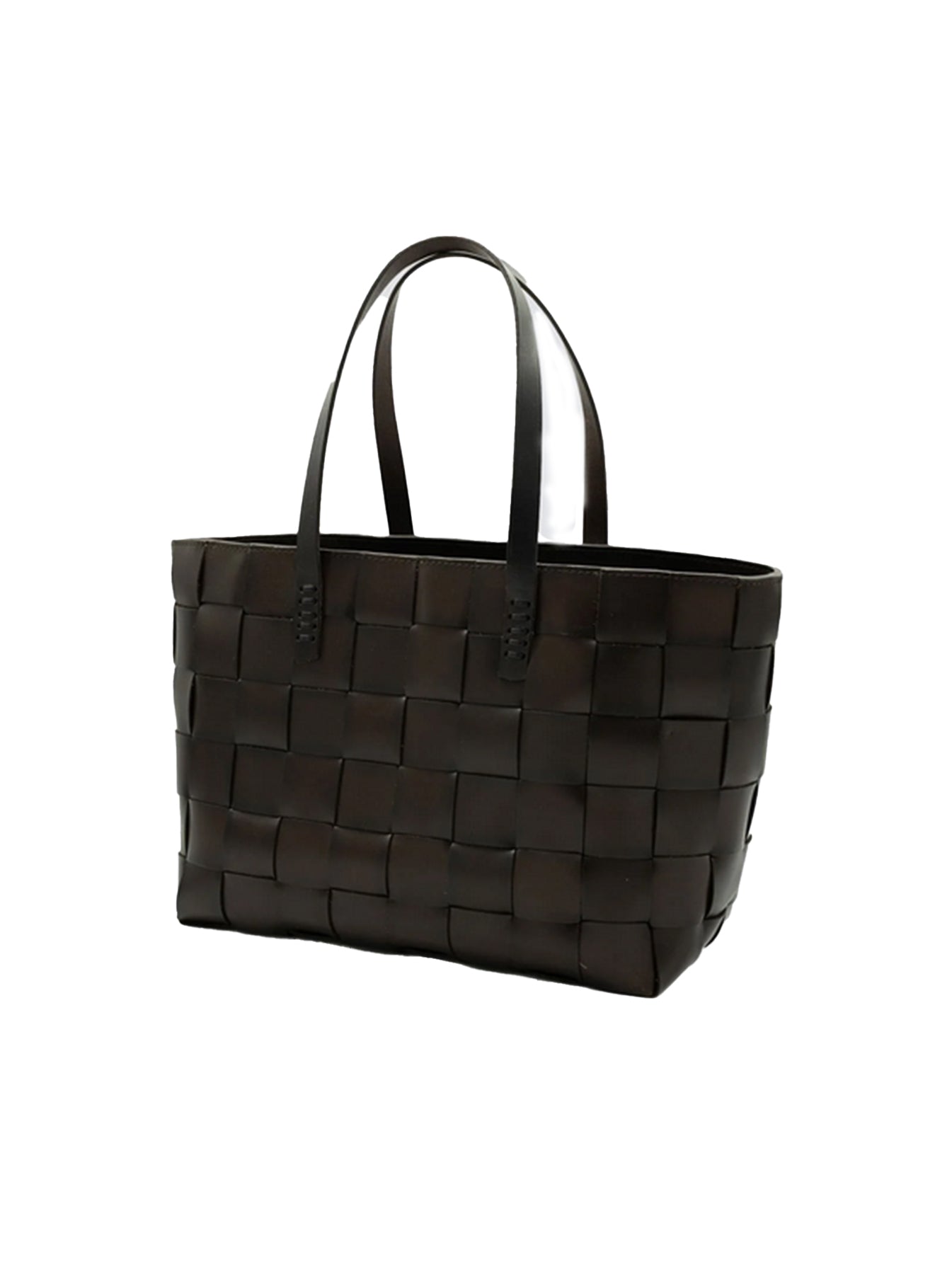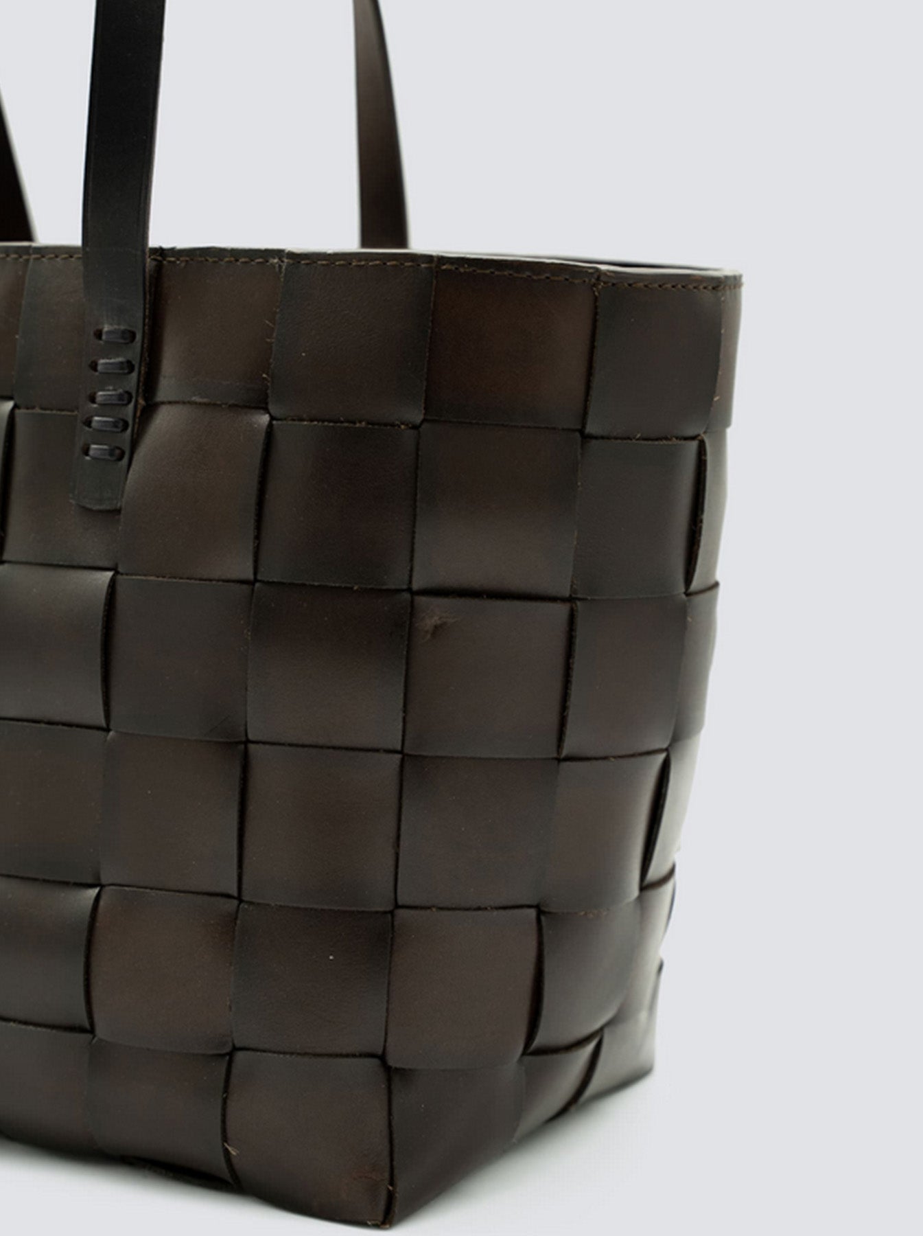 - Details: Square shaped bucket bag, with a wide-weave, twill lined interior featuring 3 zip-up interior pockets and flat polished leather handles.