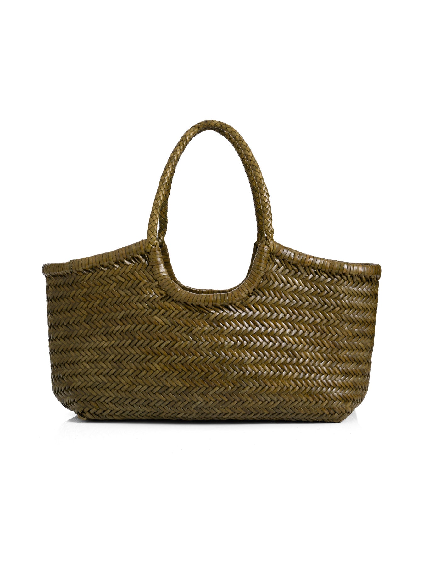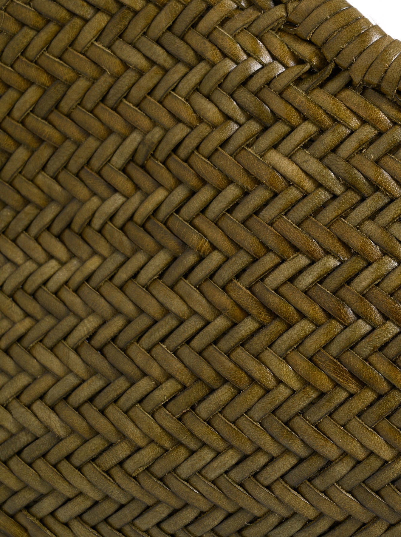 Handmade from 100% leather, the Nantucket Large Woven Leather Tote from Dragon Diffusion blends effortless style with craftsmanship. Its roomy proportions carry essentials with ease, while the structured shape keeps it polished. The soft khaki tone offers a versatile, natural appeal. Handwoven using traditional techniques, this tote reflects understated, timeless skill.