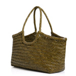 - Details: Large woven leather bag, braided leather handles, open top & Unlined.