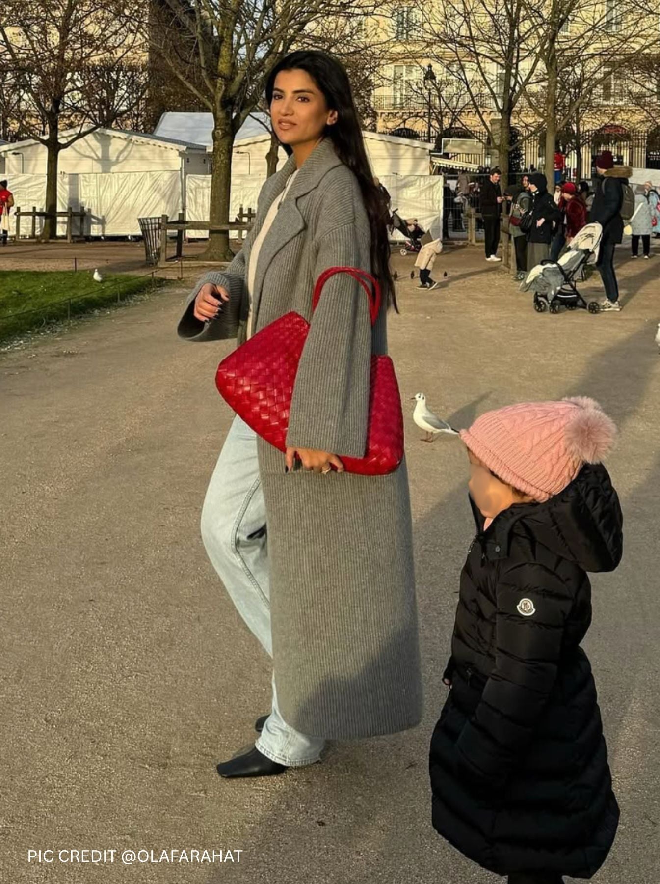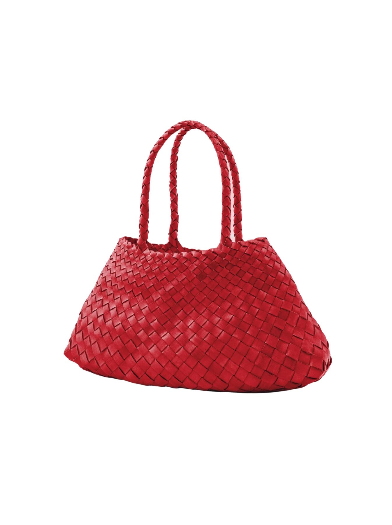 Vibrant and distinctive, the Santa Croce Large Woven Leather Tote from Dragon Diffusion brings craftsmanship to the forefront. Handmade from 100% leather, its woven straps taper toward the top, forming a balanced and eye-catching silhouette. The open-top design with an unlined interior highlights traditional basket-weaving techniques while remaining practical for everyday use. In a striking poppy red, this tote makes a bold statement without compromising timeless appeal.