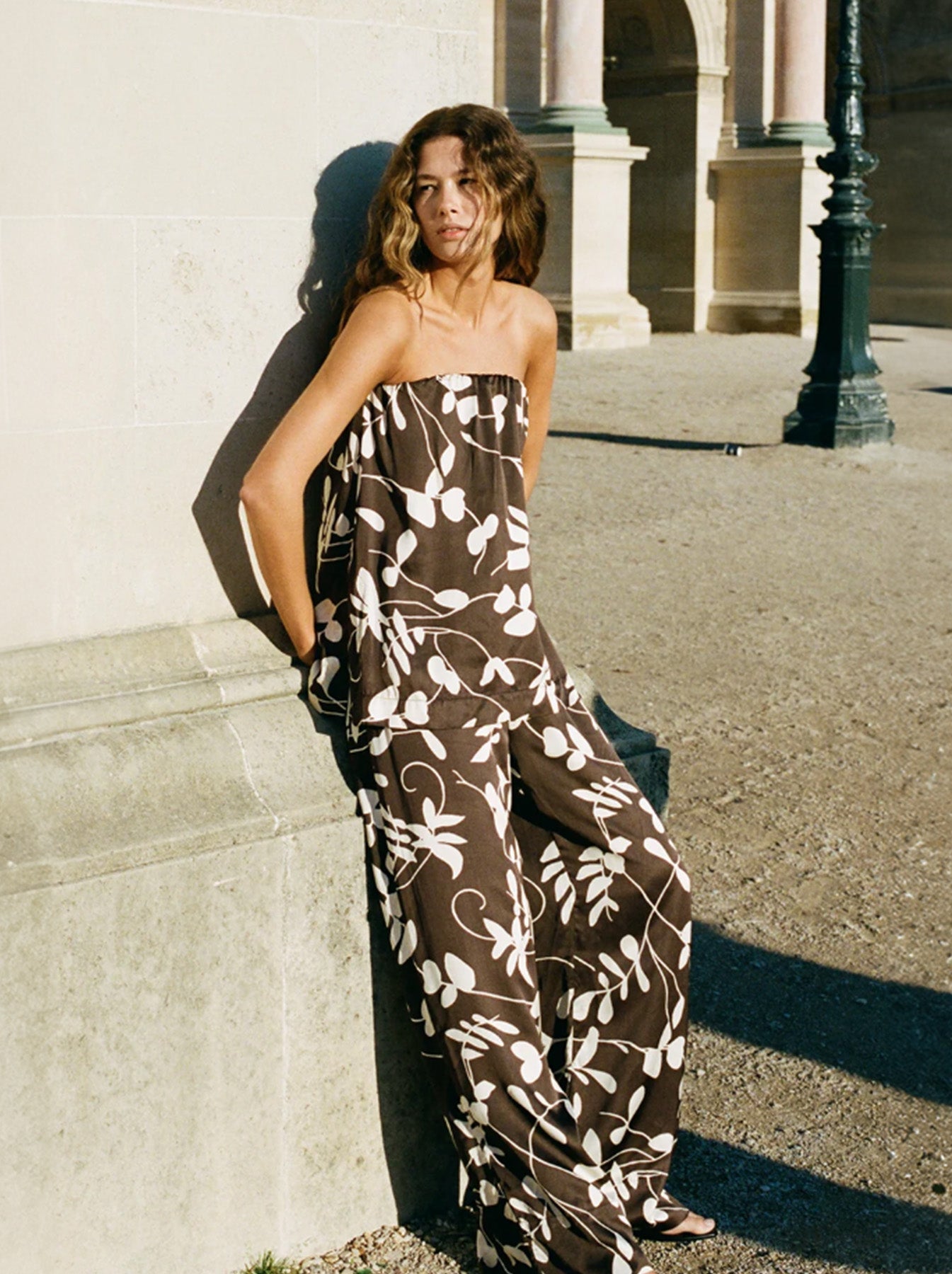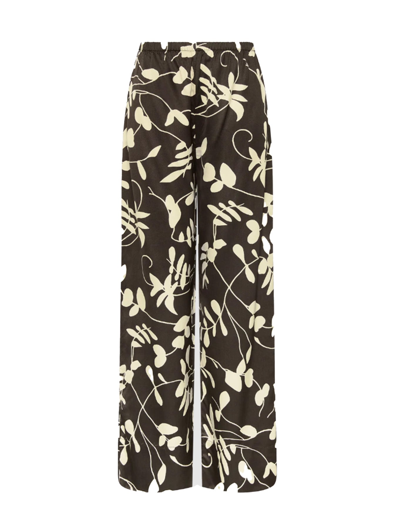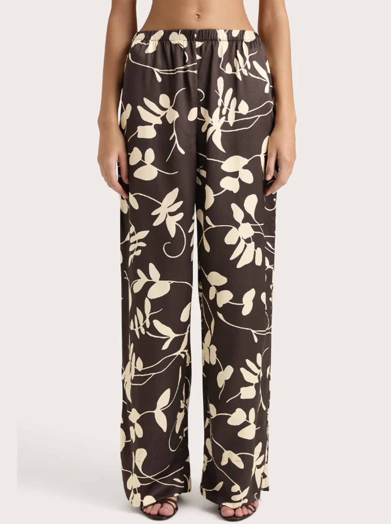 Faithfull's relaxed Chambien Pants offer a comfortable fit with an elastic waistband sitting at the hips. Made from a soft viscose-rayon blend, they feature a rich chocolate brown color and vintage floral print inspired by 1920s wallpaper. This mid-rise, straight-leg design falls just above the ankles for an effortlessly stylish look. Pair it with the matching Chambien top for a standout two-piece set.