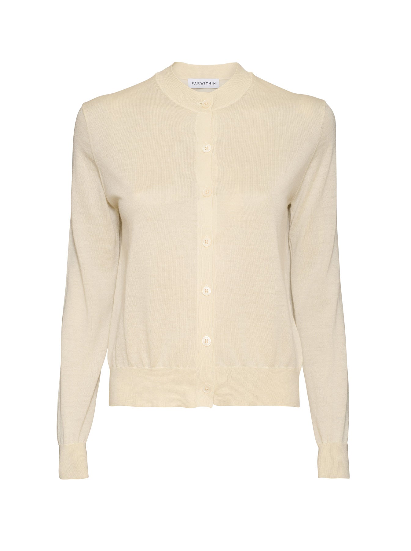 Meet the new Farwithin Ivy Cardigan. This lightweight cashmere cardigan is crafted from a 16-gauge fine knit that makes it ideal for layering through every season. The boxy silhouette hits at the hip, balanced by a finely ribbed hem that adds subtle shape. Pearlescent buttons line the front centre placket, complementing the soft round neckline. Understated yet refined, it’s the perfect go-to for easy elegance.