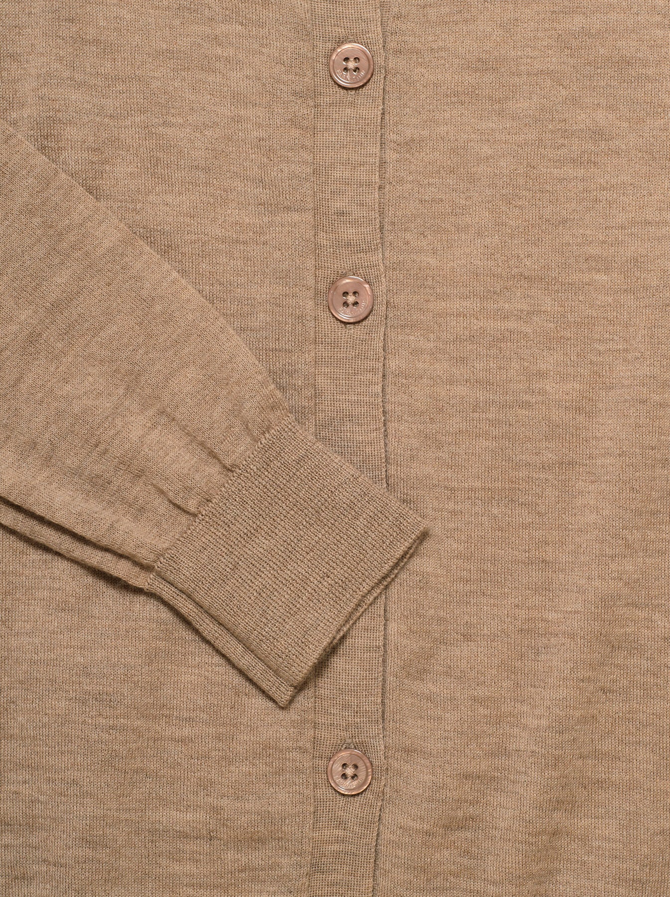 - Details: Details: Fine knit cashmere long-sleeved, round-neck cardigan, ribbed hems, tonal pearlescent buttons down the centre placket..