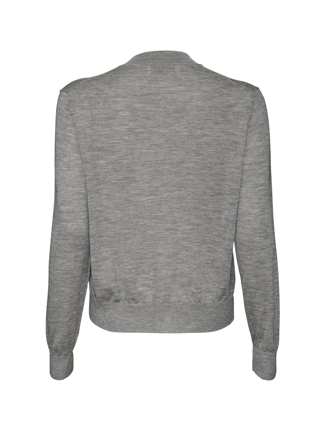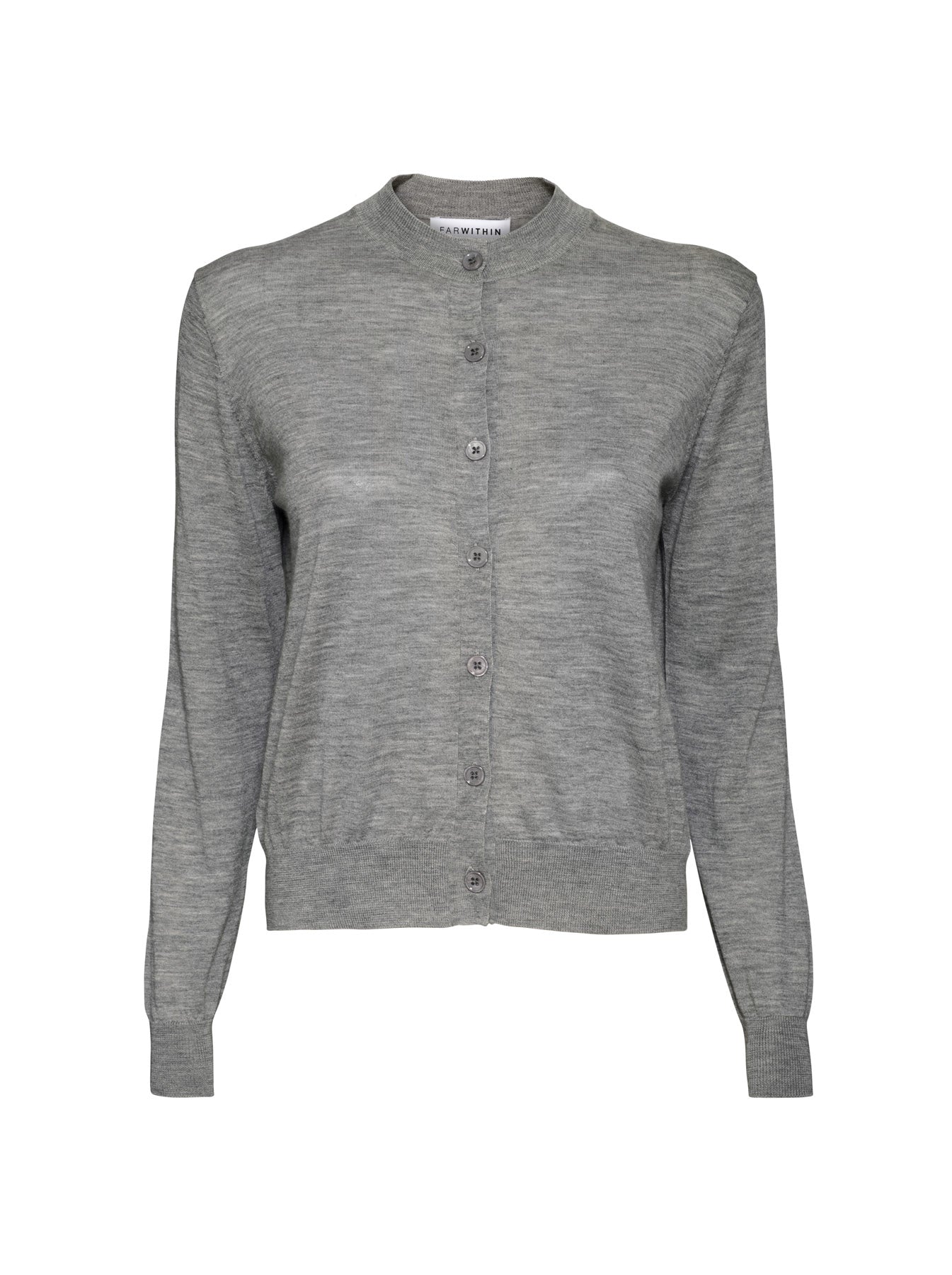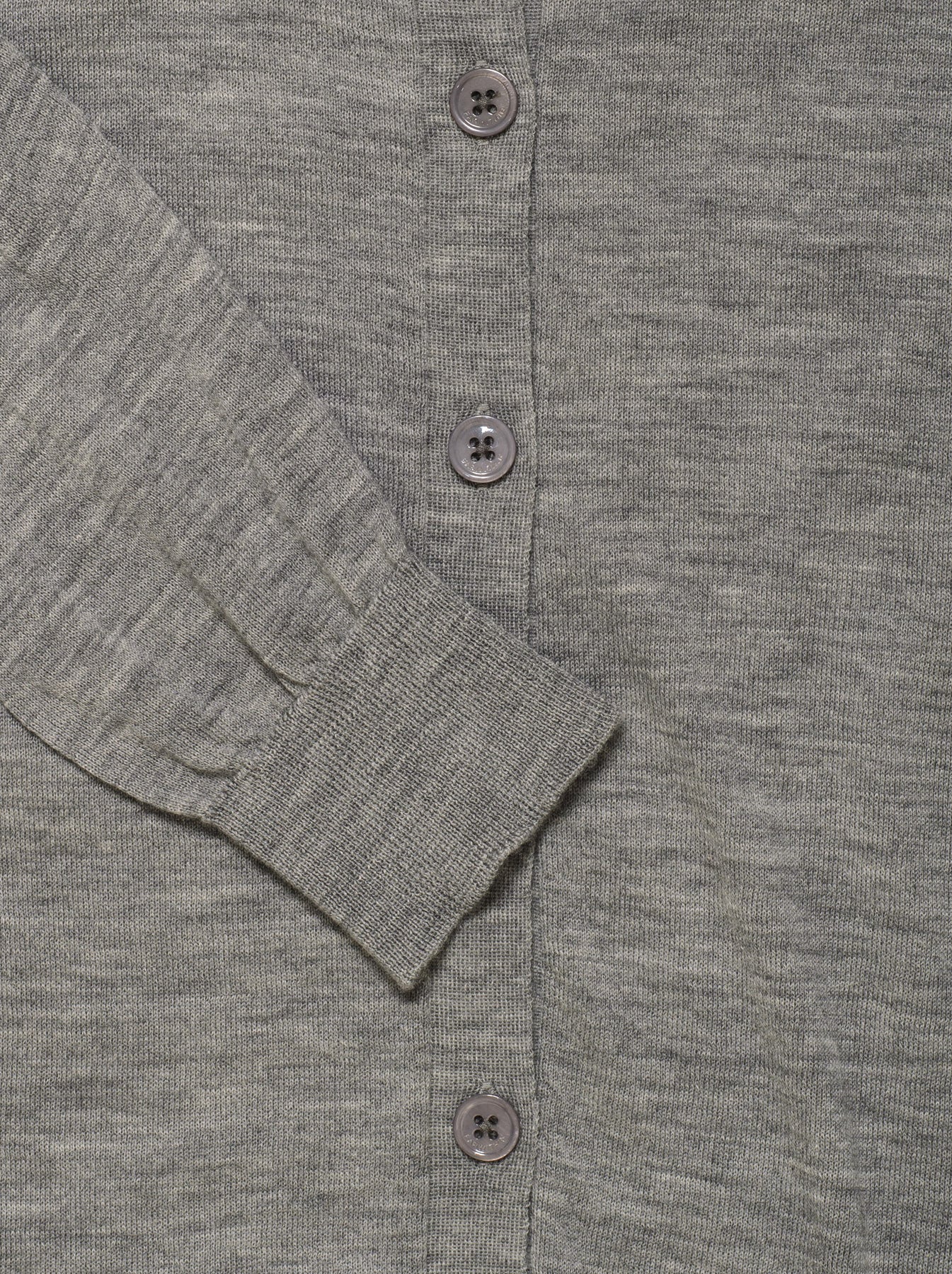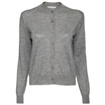 - Details: Fine knit cashmere long-sleeved, round-neck cardigan, with a relaxed-fit & slightly cropped body, monochromatic pearlescent buttons down the centre placket.