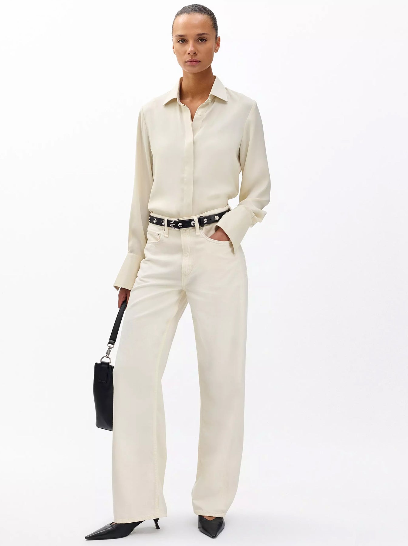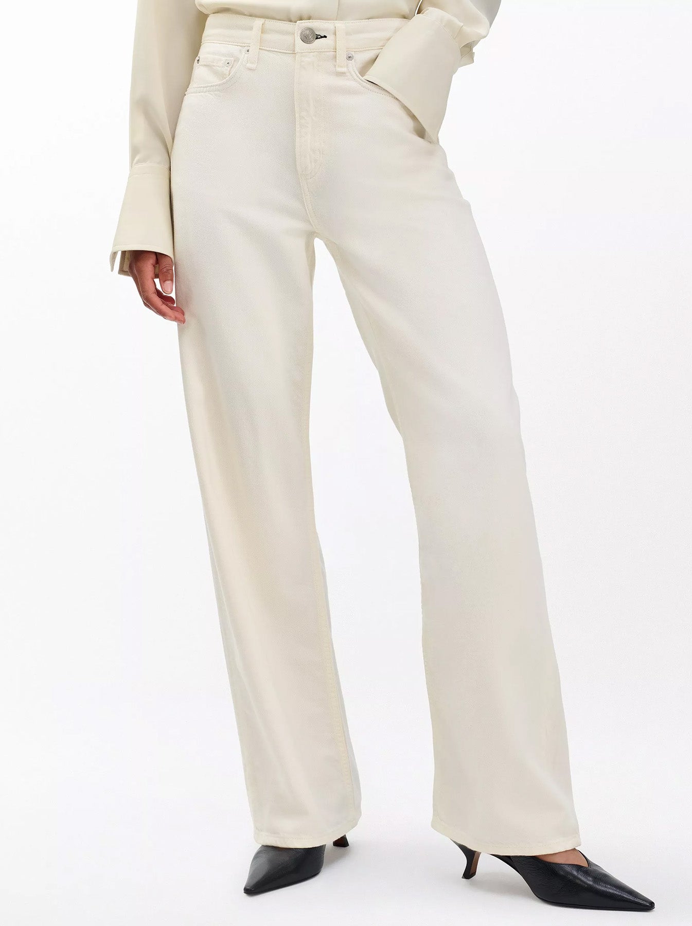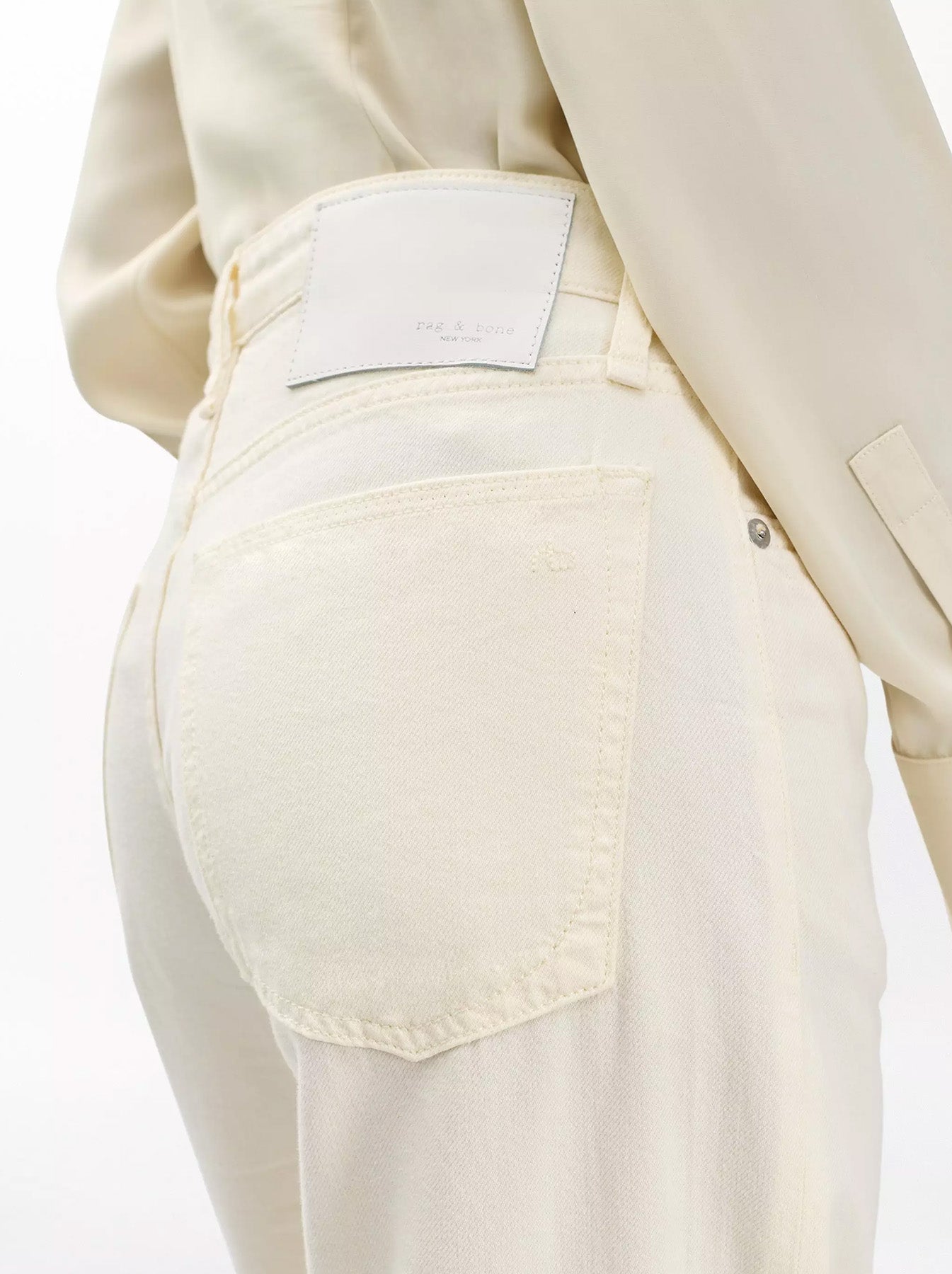 The Rag & Bone Featherweight Logan jean presents a sophisticated wide-leg design crafted from a comfortable Featherweight denim. Its generous hip and thigh cut ensures exceptional comfort, perfect for effortless style. Offered in an elegant Ecru shade, it adapts seamlessly to your preference: wear your true size low on the waist for a casual silhouette, or opt for a smaller size to elevate the rise gracefully.