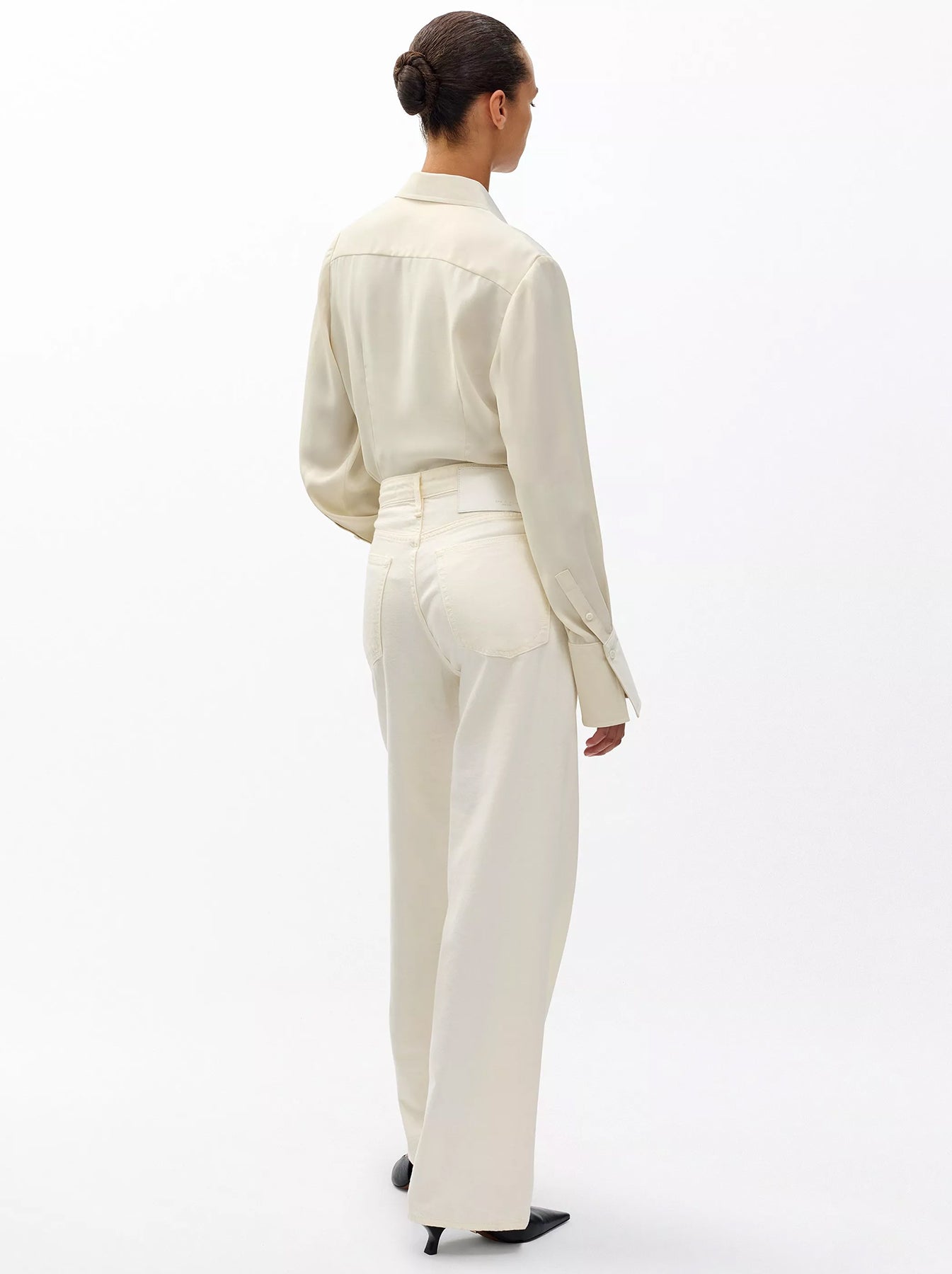- Details: Mid-rise featherweight stretch denim, wide leg silhouette, classic five-pocket design, belt loops and a concealed zip-fly