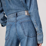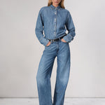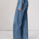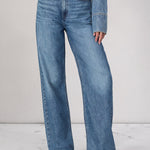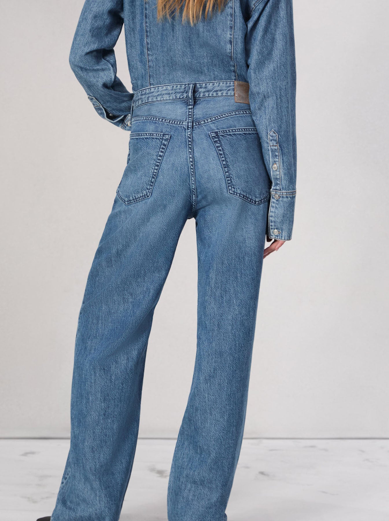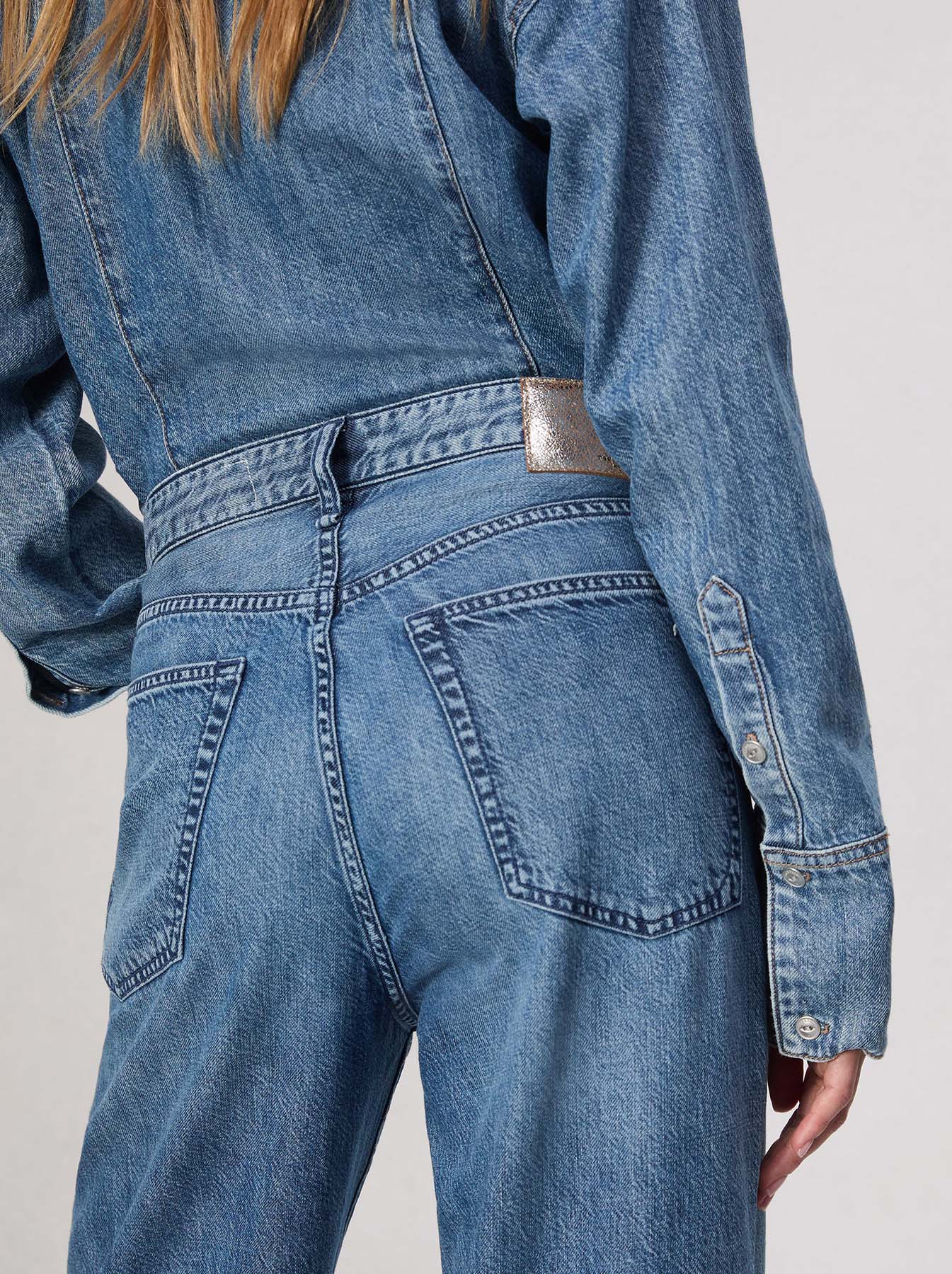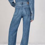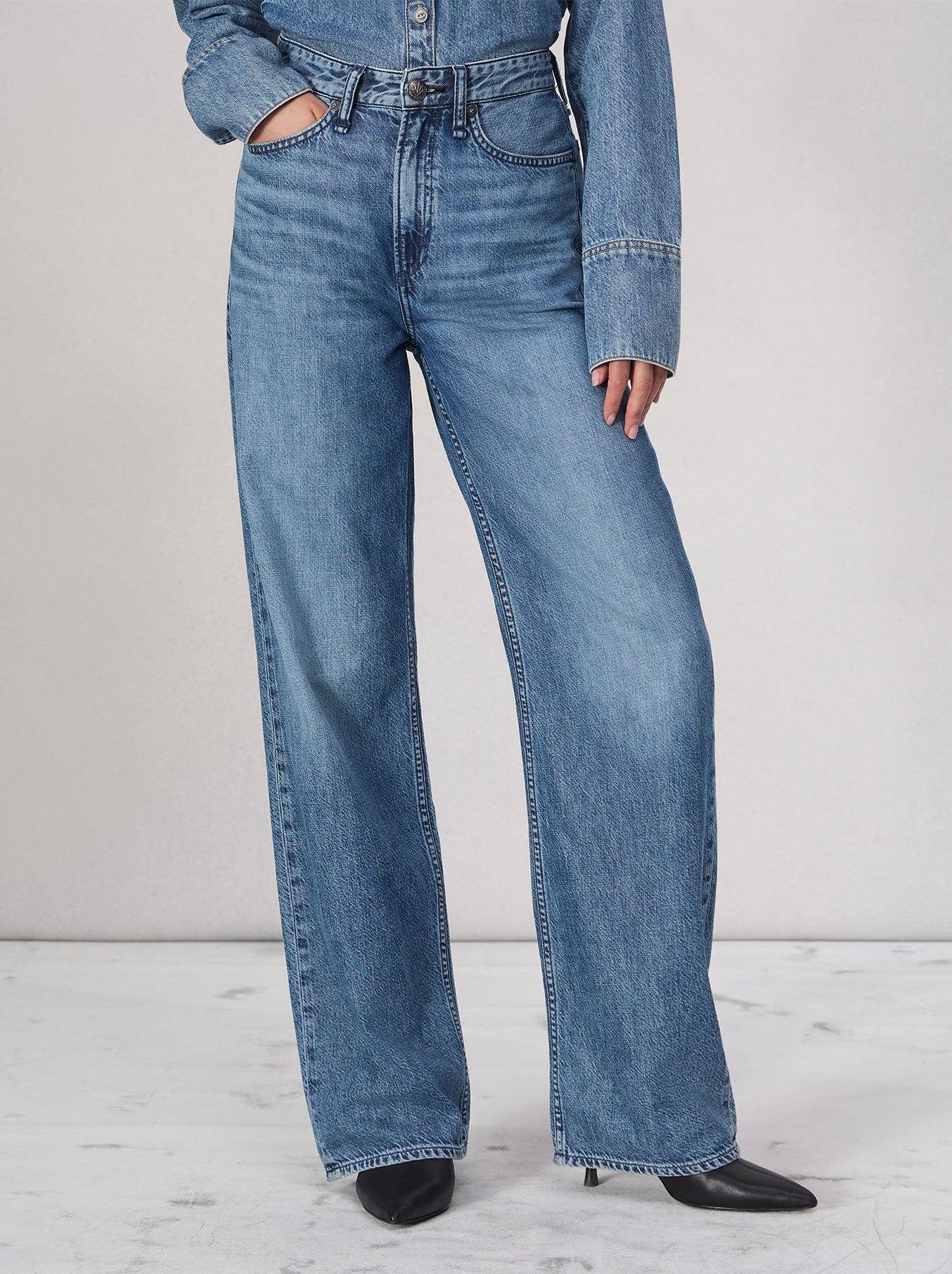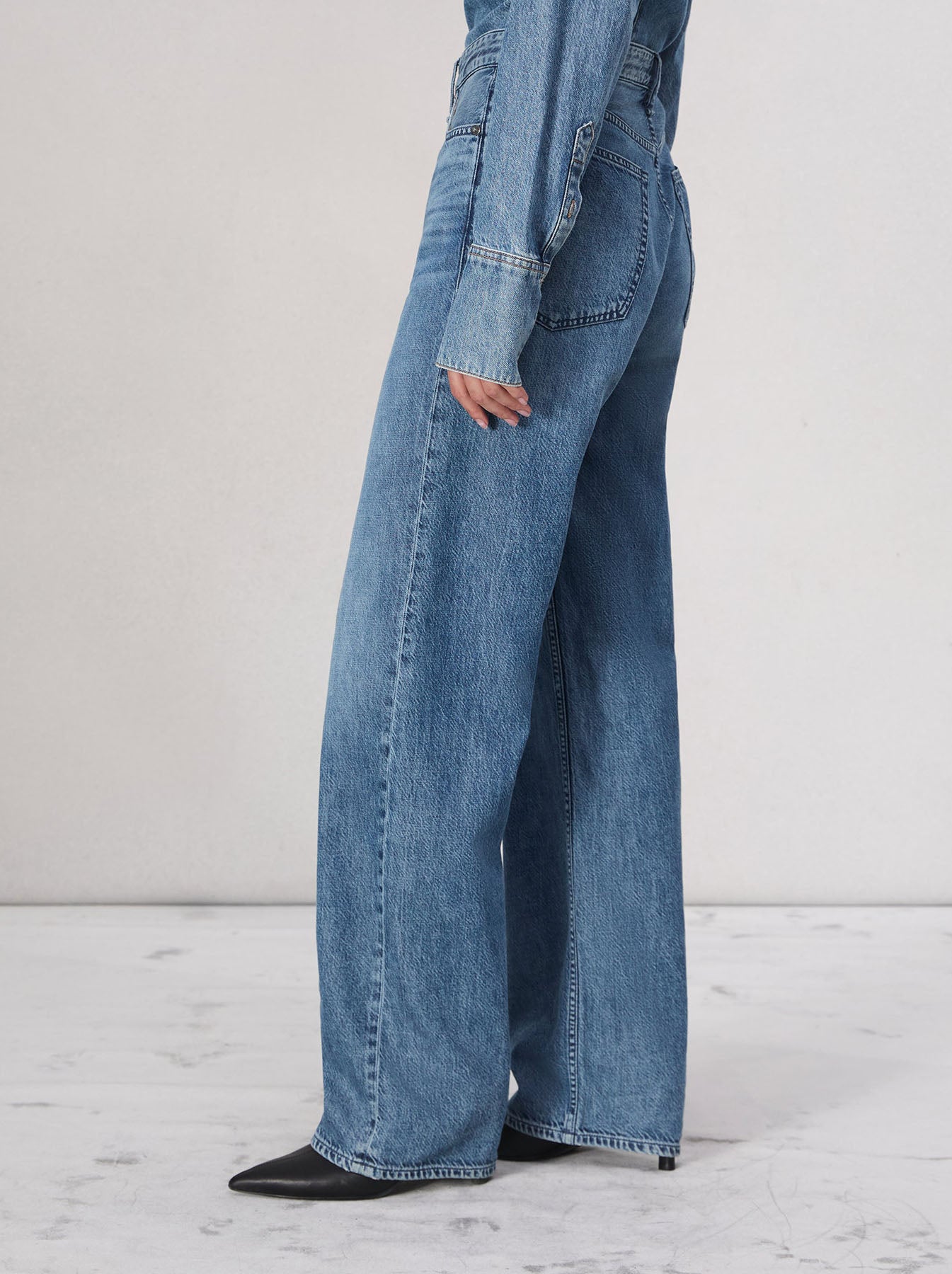 - Details: Mid-rise featherweight stretch blue denim with fading/whiskering, wide leg silhouette, classic five-pocket design, belt loops and a concealed zip-fly