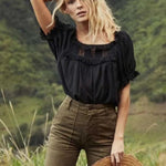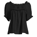 • Details: Lightweight semi-sheer cotton blouse with elasticated square neckline, gathered front and short puff sleeves with ruffle trim.
