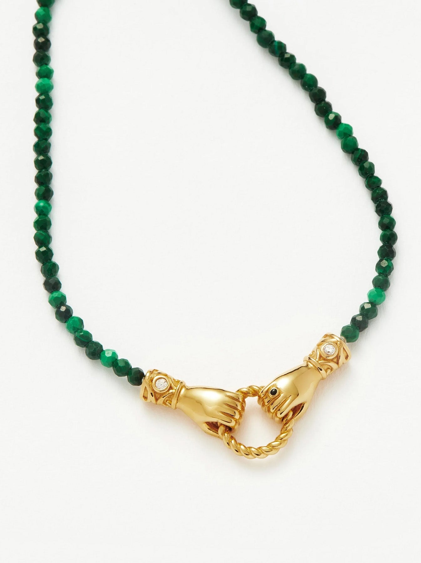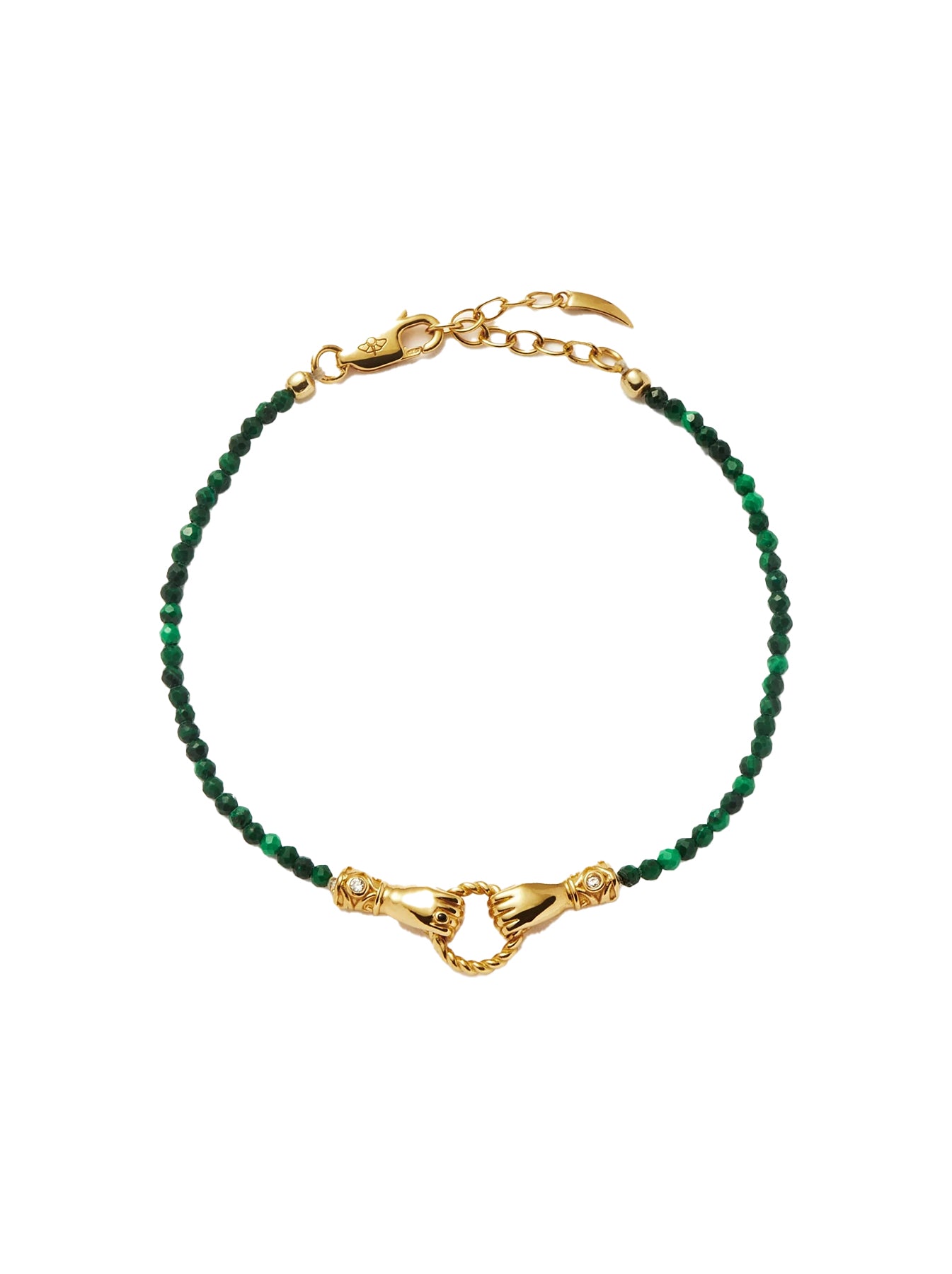 The bestselling Harris Reed x Missoma collab is now here in a sleek mini format. Featuring pretty malachite beads and two Georgian-inspired hands which meet in the middle at the pendant. The cuffs are detailed with white cubic zirconia and finished with a bold black enamel ring. Wear it alone for subtle elegance or layer for a colourful, statement look.
