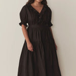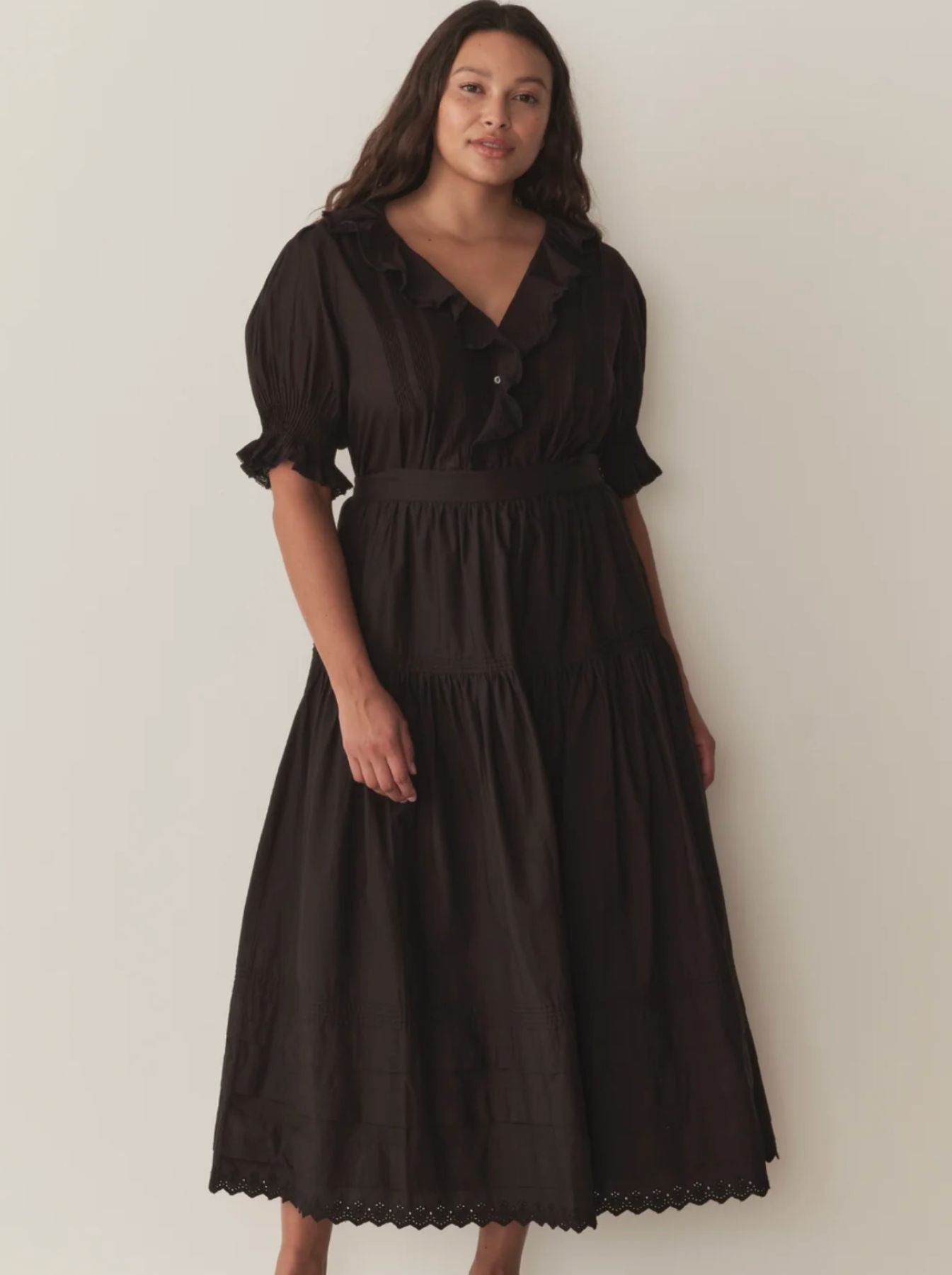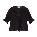 Cut from a lightweight black organic cotton-voile, the Henri Top by DÔEN offers refined drama and ease. Pintucked detailing draws the eye to the softly gathered front, while ruffled trims frame the neckline and short puff sleeves add subtle movement. Tuck it into tailored trousers for evening polish or keep it untucked with high-rise jeans for day-to-night versatility.
