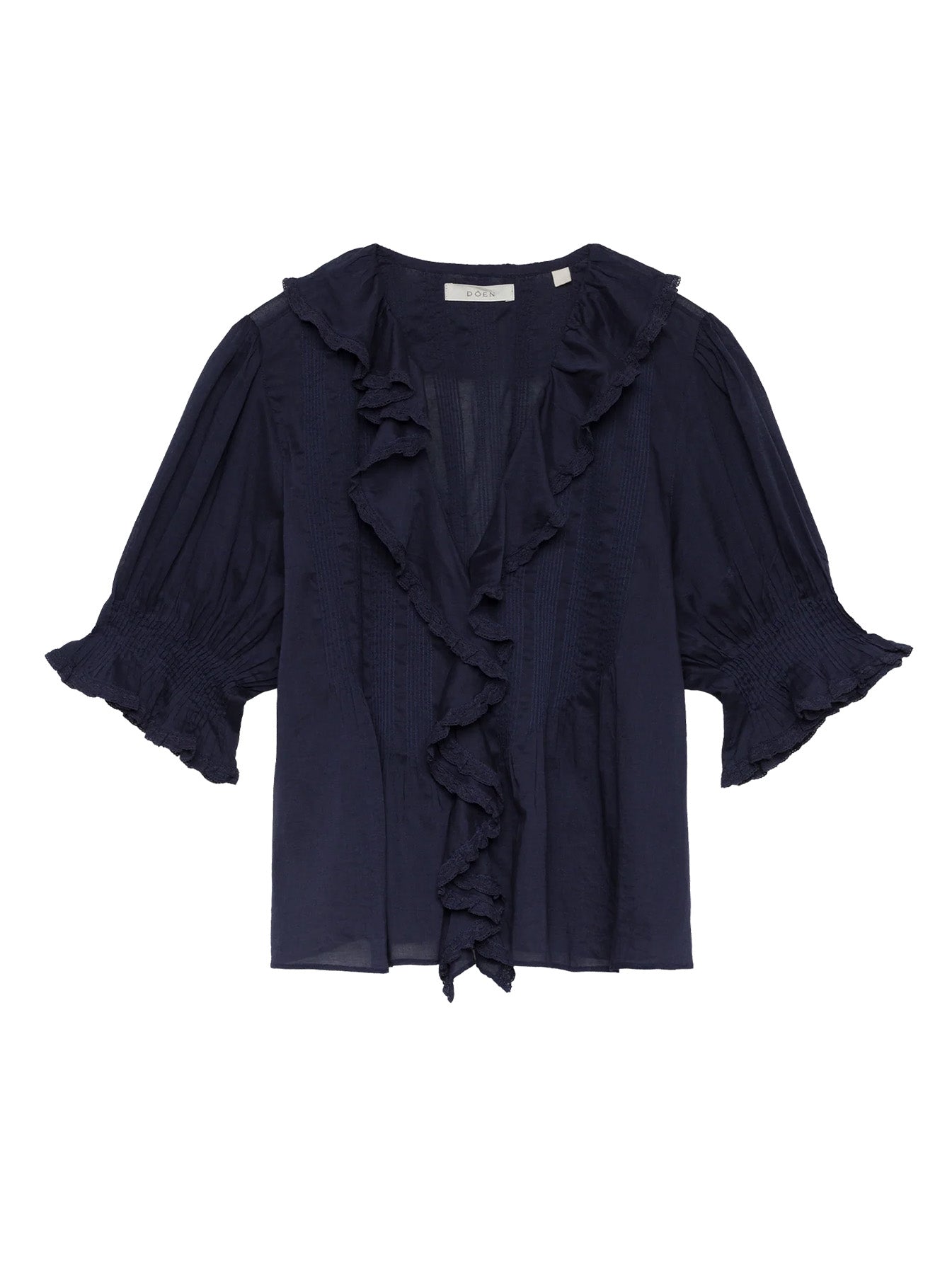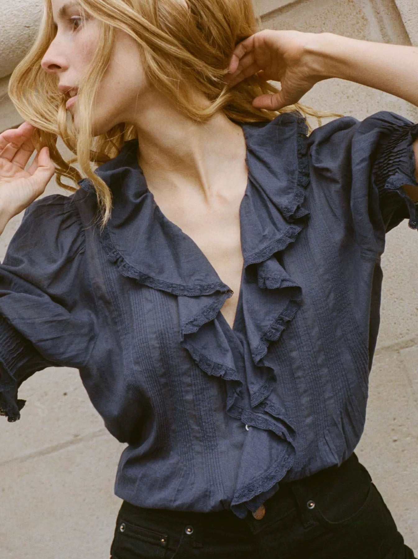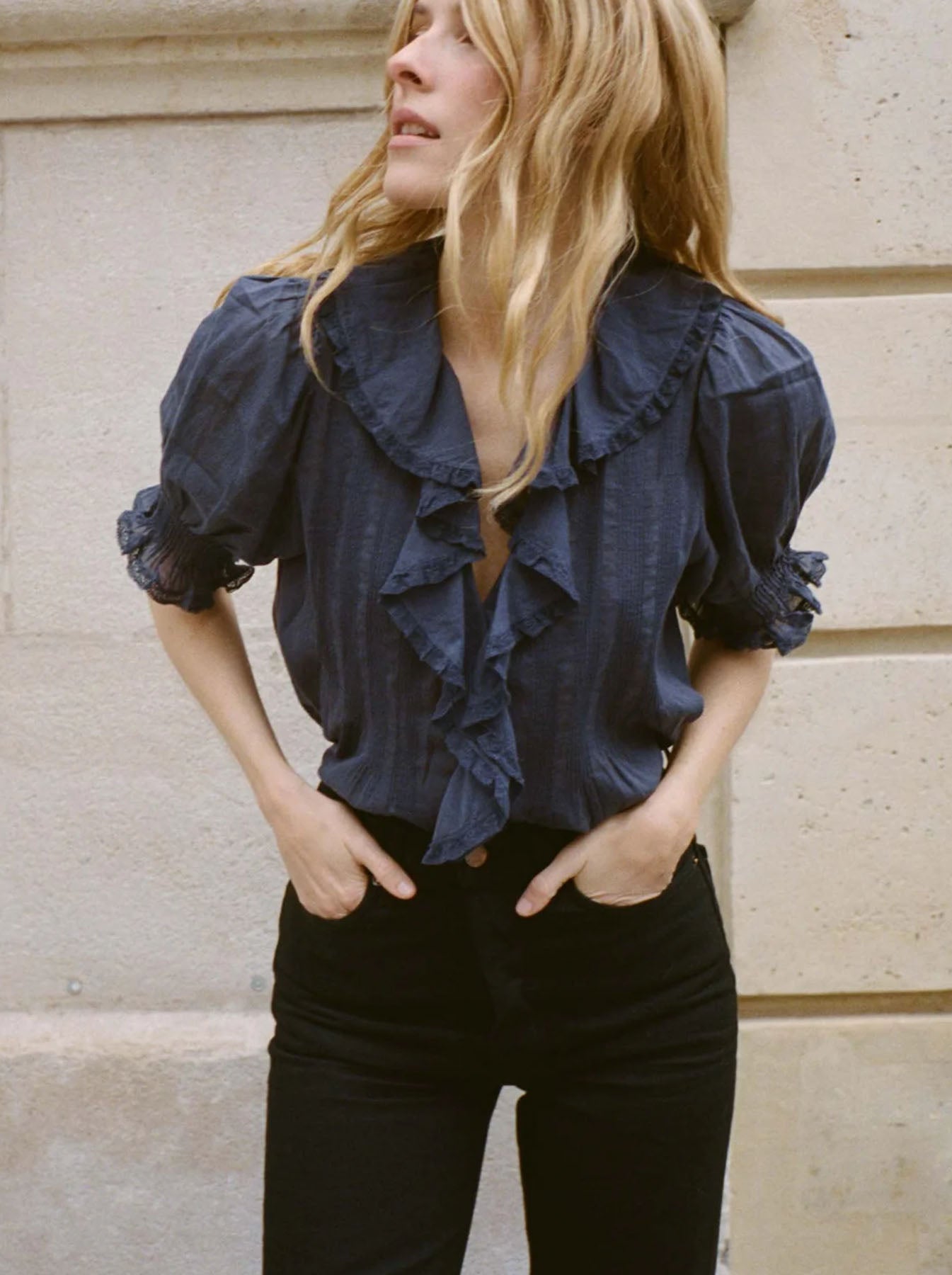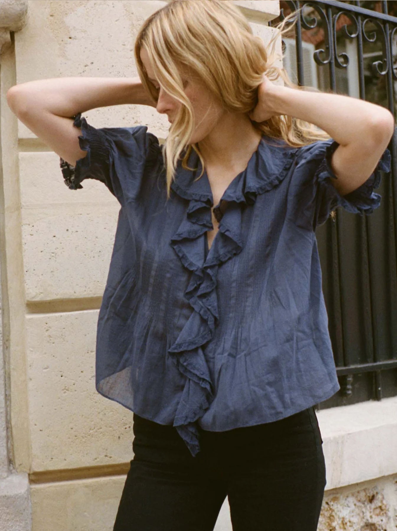 Cut from a lightweight organic cotton-voile, the Henri Top by DÔEN offers refined drama and ease. Pintucked detailing draws the eye to the softly gathered front, while ruffled trims frame the neckline and short puff sleeves add subtle movement. Tuck it into tailored trousers for evening polish or keep it untucked with high-rise jeans for day-to-night versatility.