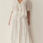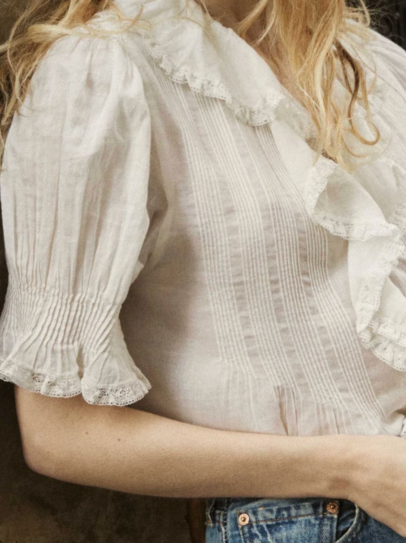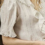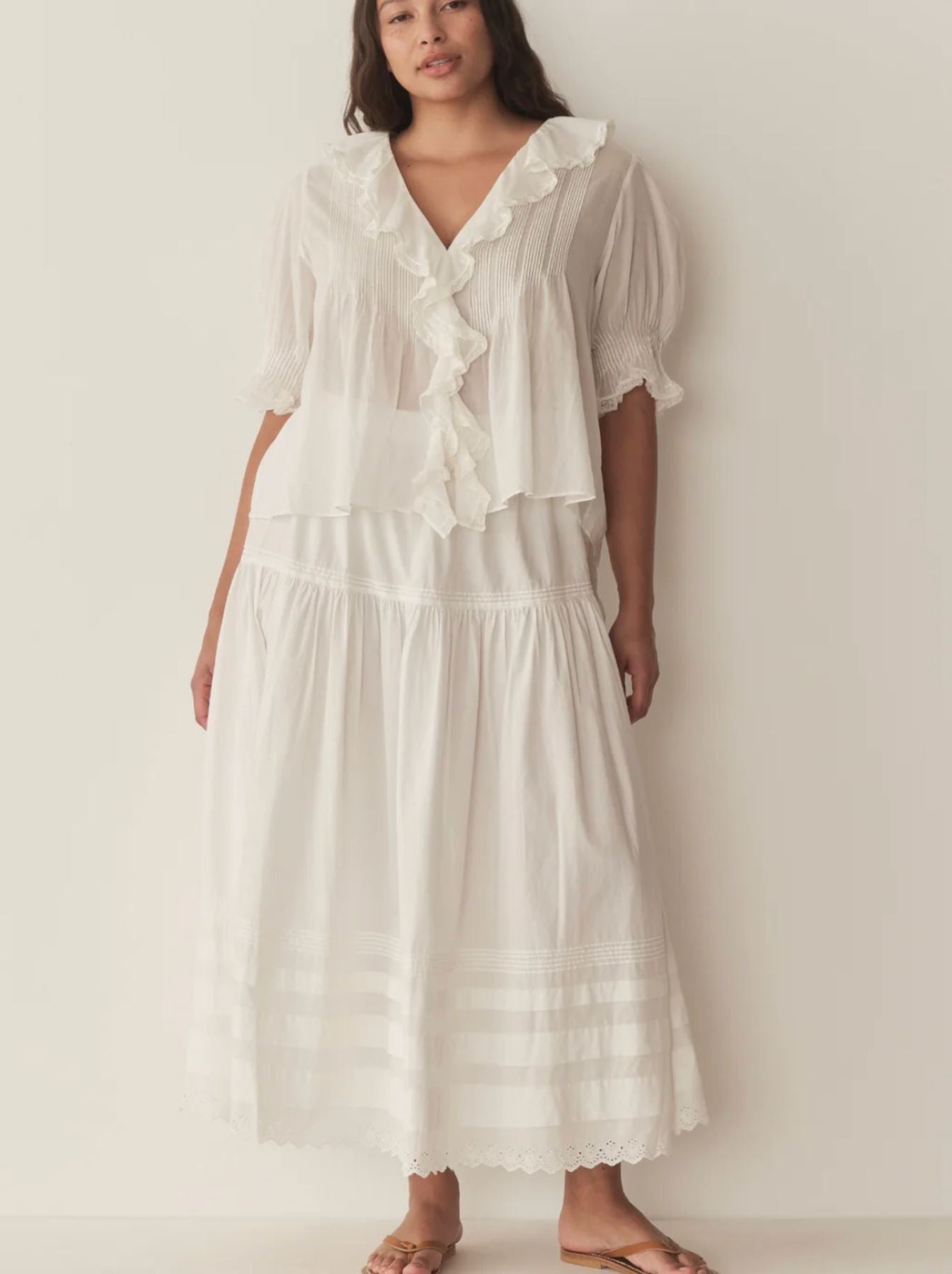 The Dôen Henri Top in Salt captures the label’s romantic sensibility through delicate texture and graceful movement. Crafted from airy organic cotton voile, it features soft pintucks and cascading ruffles that frame the neckline, with smocked puff sleeves adding gentle volume. The crisp off-white shade enhances its lightness — effortless when paired with straight-leg denim or flowing linen trousers.