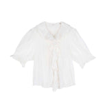 • Details: Lightweight semi-sheer blouse with pintucked yoke, ruffle-trimmed neckline, smocked puff sleeves and button front closure