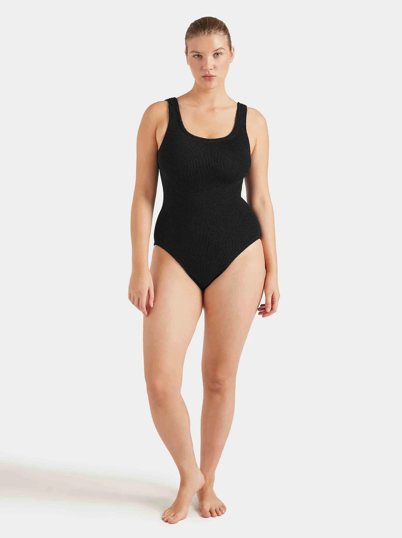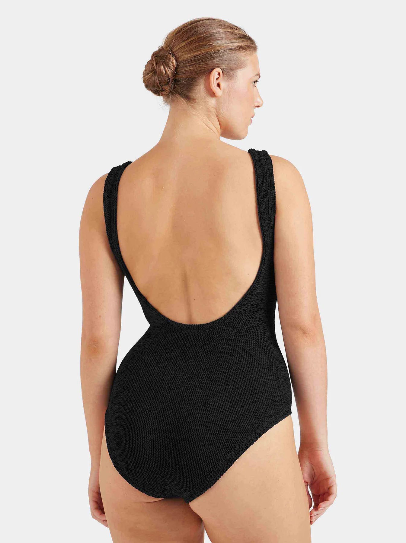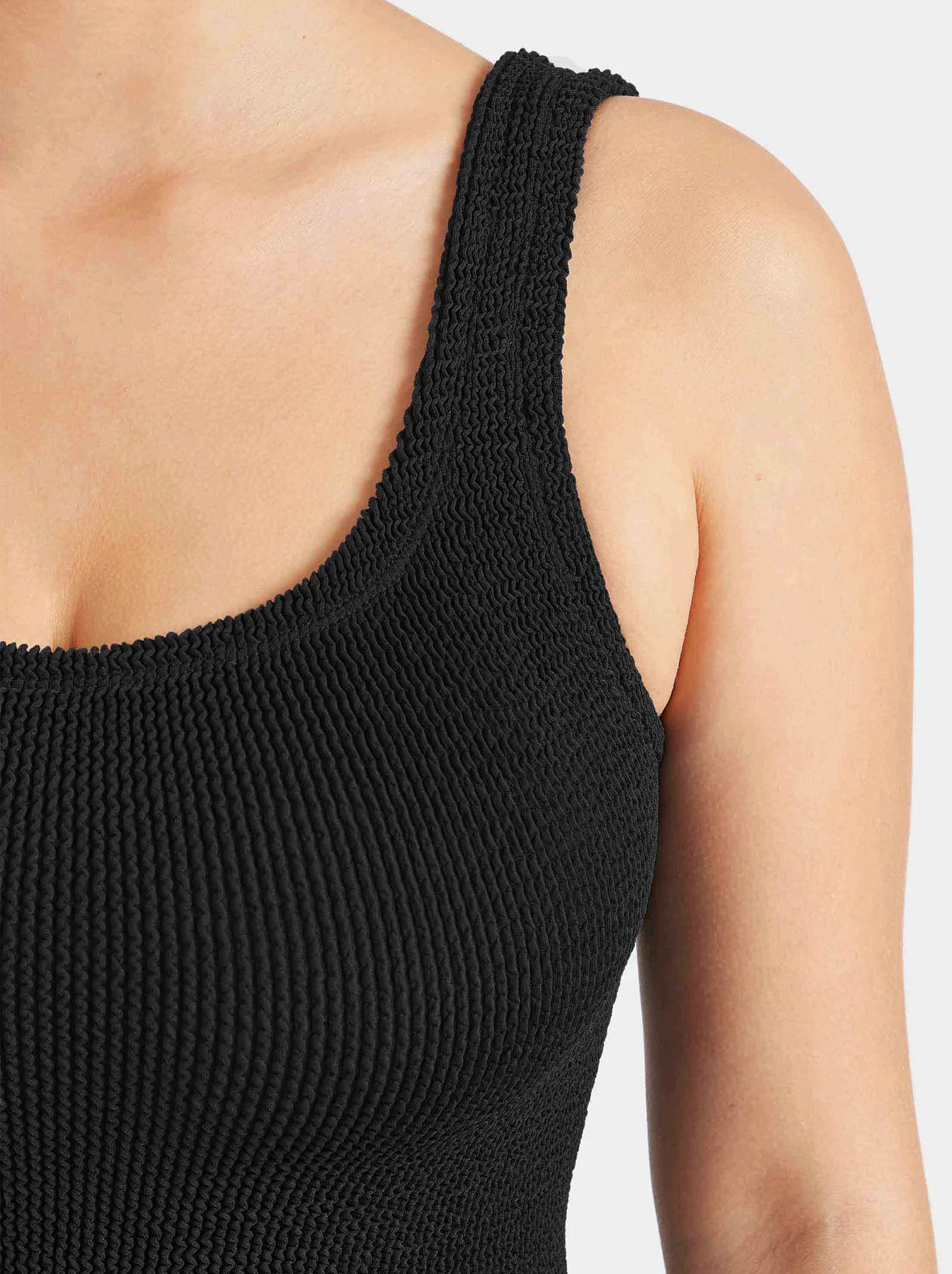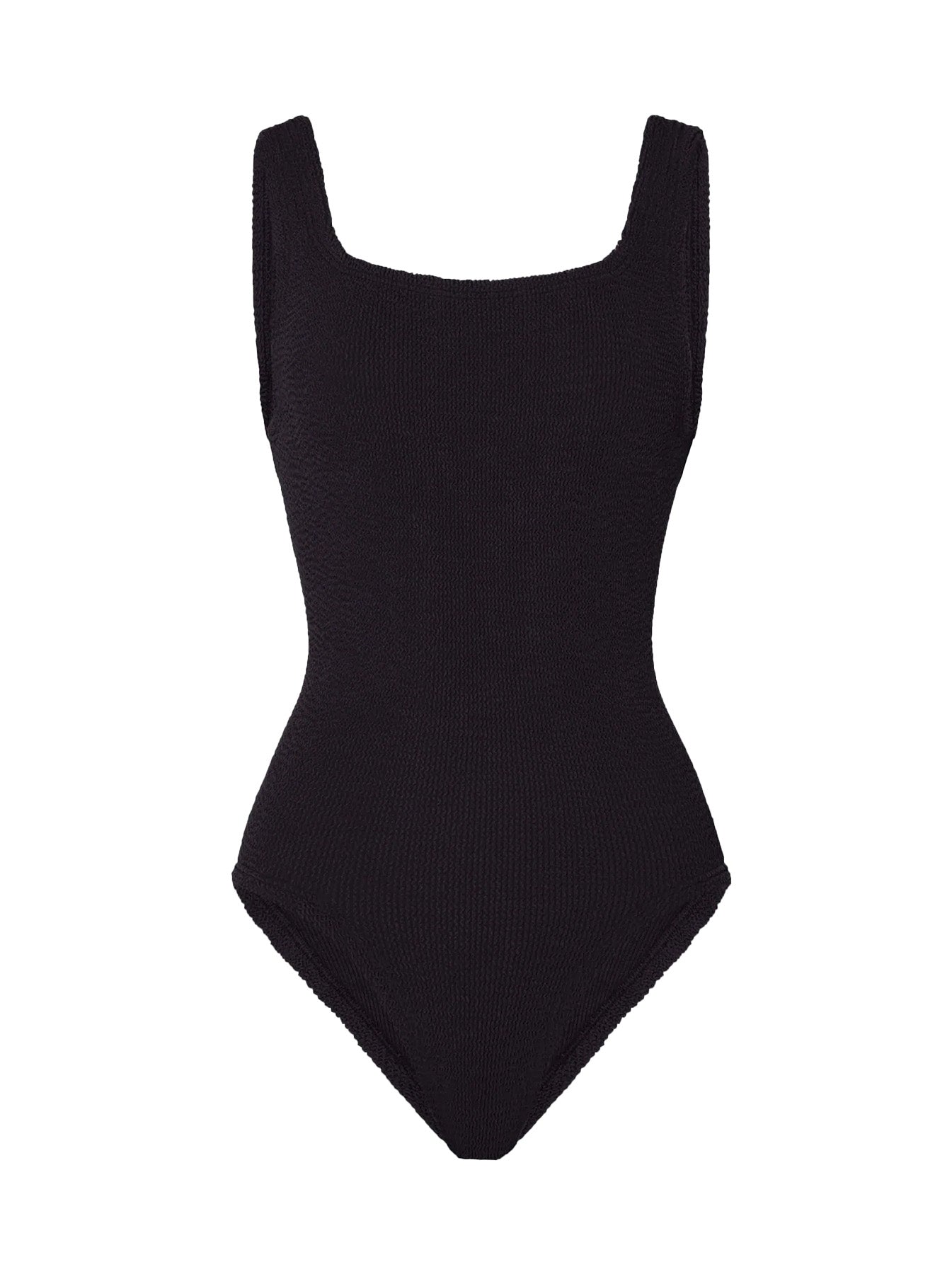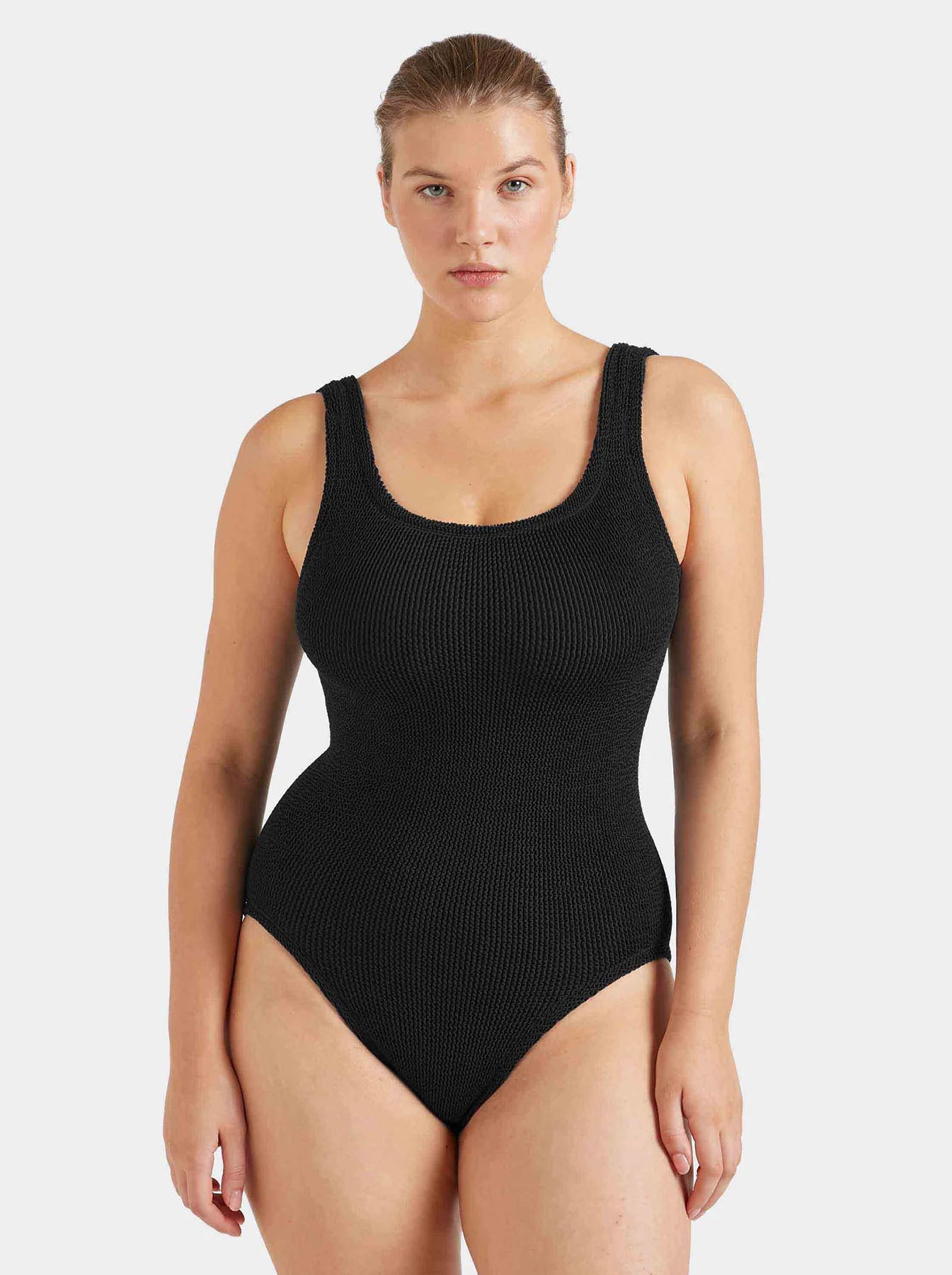 A refined take on one of Hunza G’s most recognisable styles, the Coverage Square Neck Swimsuit offers a more modest cut while keeping the brand’s signature sculpting look. Crafted from Hunza G’s iconic crinkle-stretch fabric, it molds comfortably to the body with a flattering square neckline and wider straps for effortless support. In timeless black, it’s a sleek, versatile piece made for poolside or beach days.
