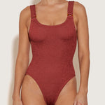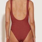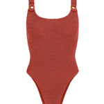 Update your swimwear collection, with Hunza G Domino Swimsuit in their gorgeous new season hue, Metallic Rosewood. Crafted from the brand's signature Crinkle™ fabric, a flattering fit for every figure, this pretty dark pink metallic swimsuit features a scooped neckline, low-cut back, and elegant tortoiseshell accents. Pair yours with your favourite black linen short and shirt set.