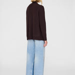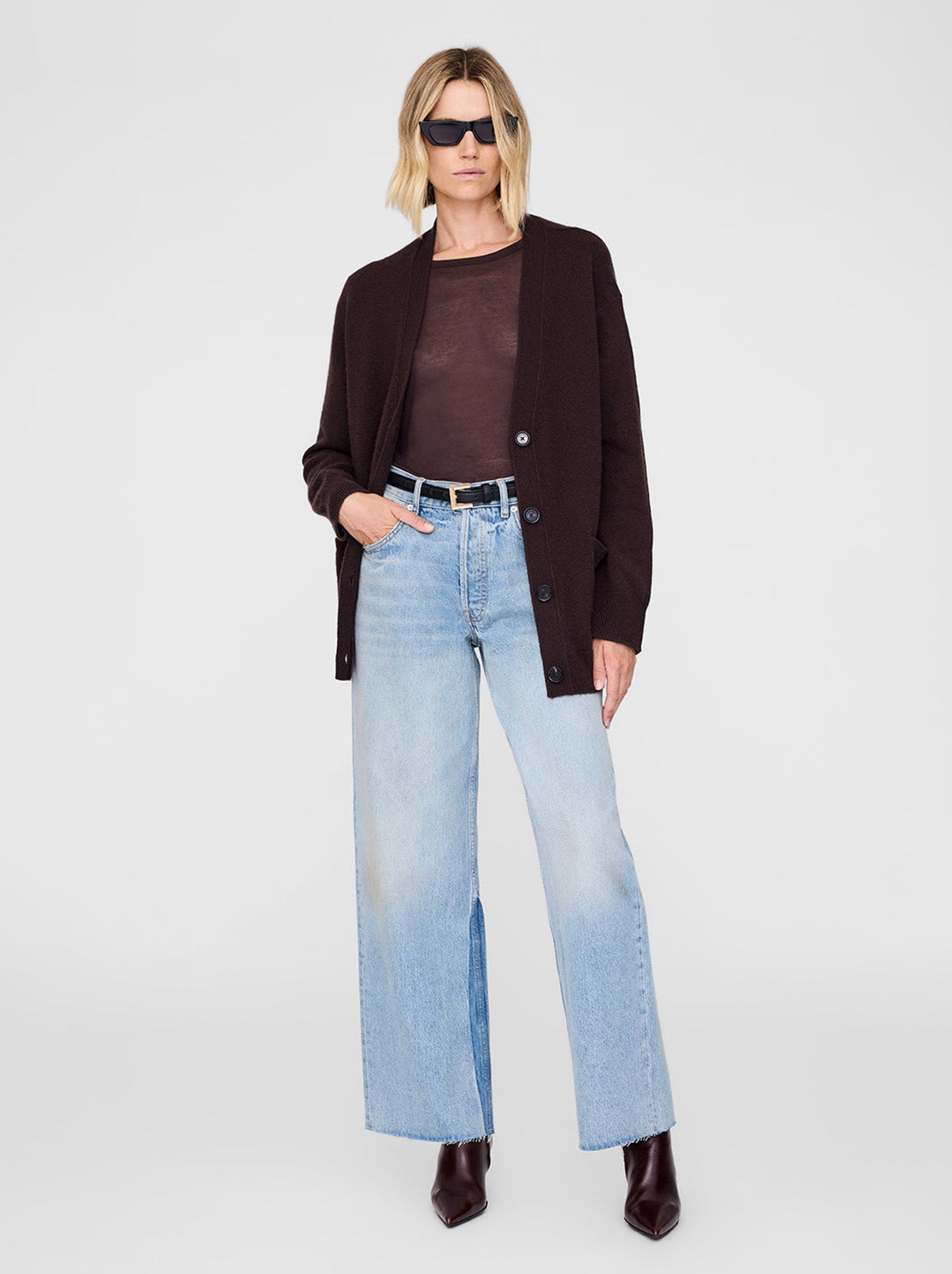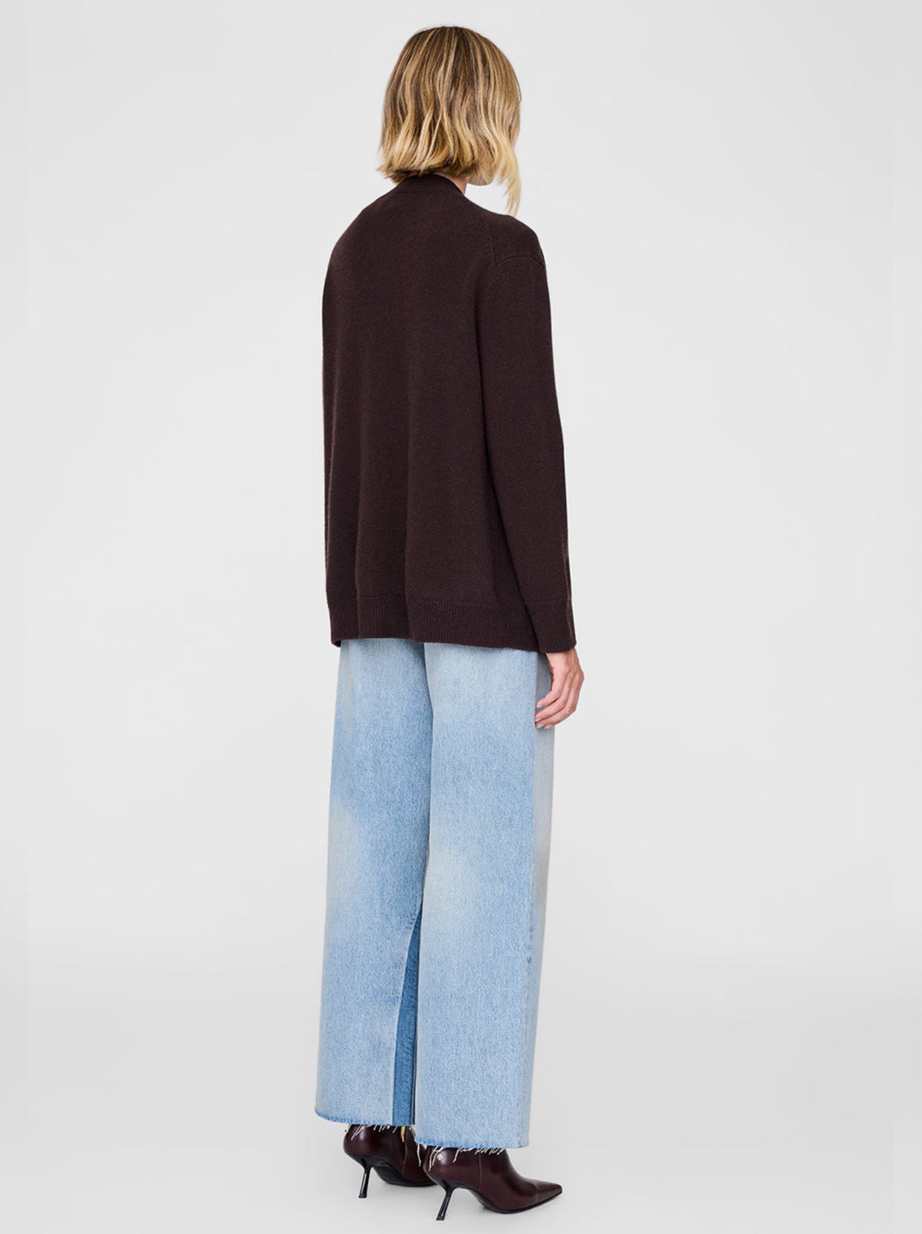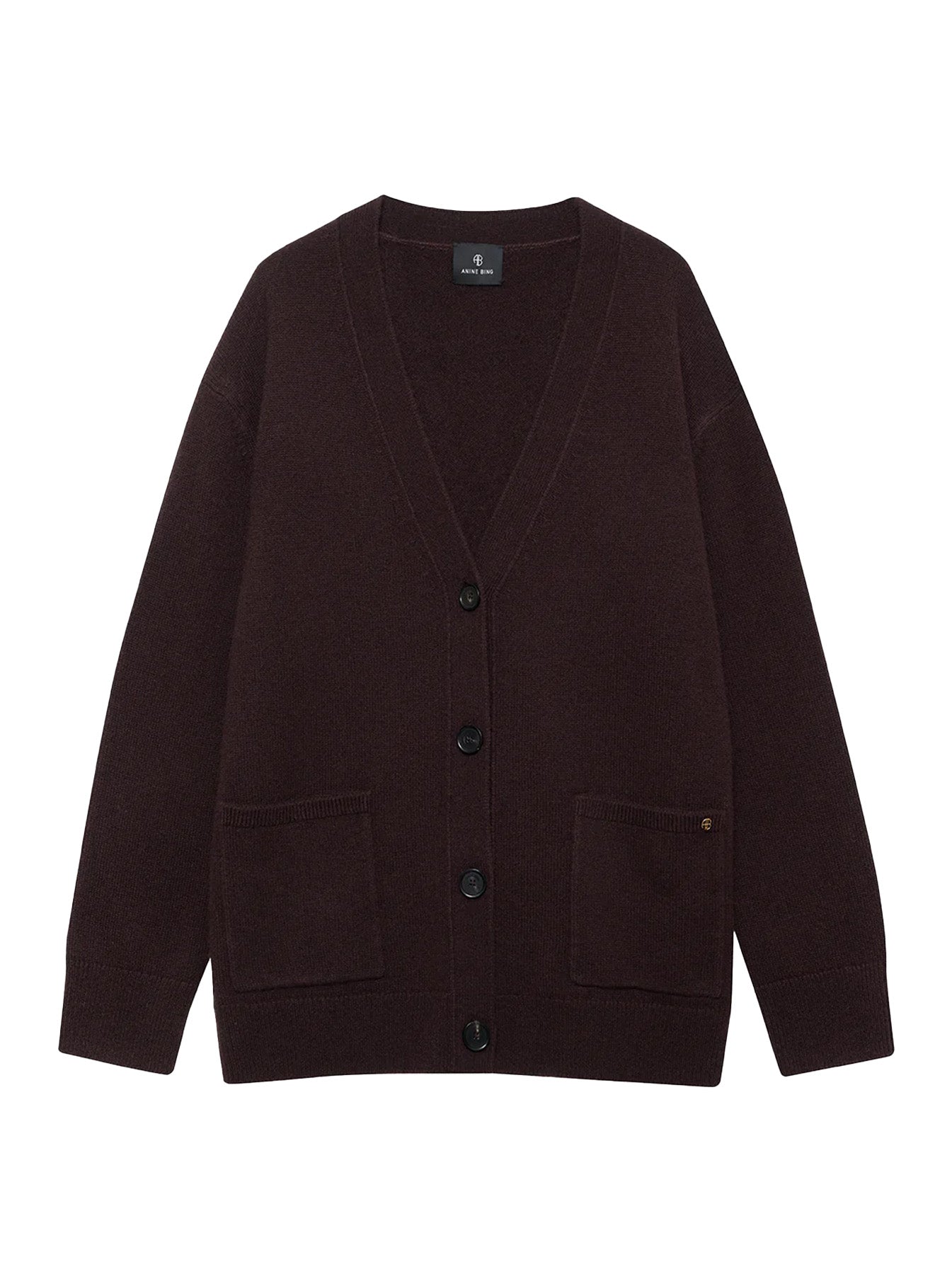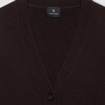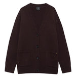 The Jackson Cardigan is made from luxuriously soft, midweight 100% cashmere in a rich dark brown hue. It features a relaxed boxy silhouette, long raglan sleeves, elegant horn buttons, and two convenient front patch pockets, combining comfort with timeless style.