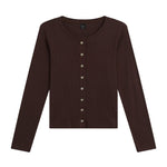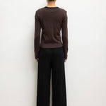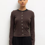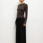 Leset’s Pointelle Classic Crew Cardigan is knit from soft, breathable pointelle cotton with signature pinhole stripes and a clean crew neckline. The relaxed silhouette and button-front design create an easy, fluid drape that layers effortlessly over any base. Its rich chocolate hue adds depth while maintaining a refined, understated tone. Pair it with washed black cargos and neutral sneakers for a grounded, everyday edge that still feels polished.