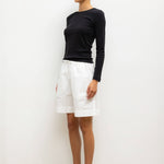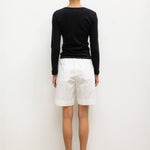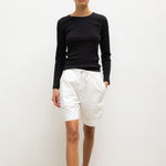 The Pointelle Slim Fit Long Sleeve Tee by Leset is knitted in ribbed pointelle cotton with a classic crewneck and scalloped edging that adds a soft design detail. The slim silhouette hugs the frame with gentle stretch that feels breathable and lived-in. Eyelet accents lend visual texture while preserving its clean, polished look. Tuck it into wide-leg trousers with heeled boots and finish with a structured blazer for an effortless outfit.